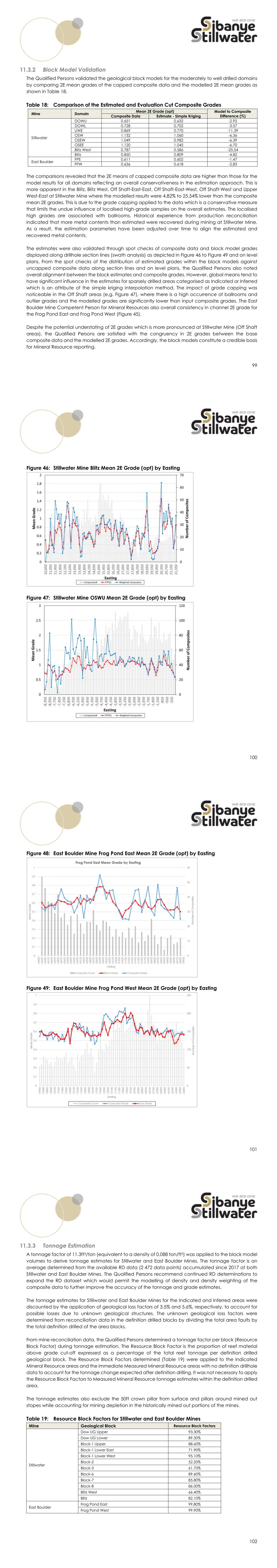99 Block Model Validation The Qualified Persons validated the geological block models for the moderately to well drilled domains by comparing 2E mean grades of the capped composite data and the modelled 2E mean grades as shown in Table 18. Table 18: Comparison of the Estimated and Evaluation Cut Composite Grades Mine Domain Mean 2E Grade (opt) Model to Composite Difference (%) Composite Data Estimate - Simple Kriging Stillwater DOWU 0.651 0.632 -2.92 DOWL 0.728 0.702 -3.57 UWE 0.869 0.770 -11.39 OSW 1.132 1.060 -6.36 OSEW 1.049 0.982 -6.39 OSEE 1.120 1.045 -6.70 Blitz West 0.787 0.586 -25.54 Blitz 0.850 0.809 -4.82 East Boulder FPE 0.611 0.602 -1.47 FPW 0.636 0.618 -2.83 The comparisons revealed that the 2E means of capped composite data are higher than those for the model results for all domains reflecting an overall conservativeness in the estimation approach. This is more apparent in the Blitz, Blitz West, Off Shaft-East-East, Off Shaft-East-West, Off Shaft-West and Upper West-East at Stillwater Mine where the modelled results were 4.82% to 25.54% lower than the composite mean 2E grades. This is due to the grade capping applied to the data which is a conservative measure that limits the undue influence of localised high-grade samples on the overall estimates. The localised high grades are associated with ballrooms. Historical experience from production reconciliation indicated that more metal contents than estimated were recovered during mining at Stillwater Mine. As a result, the estimation parameters have been adjusted over time to align the estimated and recovered metal contents. The estimates were also validated through spot checks of composite data and block model grades displayed along drillhole section lines (swath analysis) as depicted in Figure 46 to Figure 49 and on level plans. From the spot checks of the distribution of estimated grades within the block models against uncapped composite data along section lines and on level plans, the Qualified Persons also noted overall alignment between the block estimates and composite grades. However, global means tend to have significant influence in the estimates for sparsely drilled areas categorised as Indicated or Inferred which is an attribute of the simple kriging interpolation method. The impact of grade capping was noticeable in the Off Shaft areas (e.g. Figure 47), where there is a high occurrence of ballrooms and outlier grades and the modelled grades are significantly lower than input composite grades. The East Boulder Mine Competent Person for Mineral Resources also overall consistency in channel 2E grade for the Frog Pond East and Frog Pond West (Figure 45). Despite the potential understating of 2E grades which is more pronounced at Stillwater Mine (Off Shaft areas), the Qualified Persons are satisfied with the congruency in 2E grades between the base composite data and the modelled 2E grades. Accordingly, the block models constitute a credible basis for Mineral Resource reporting. 100 Figure 46: Stillwater Mine Blitz Mean 2E Grade (opt) by Easting Figure 47: Stillwater Mine OSWU Mean 2E Grade (opt) by Easting 101 Figure 48: East Boulder Mine Frog Pond East Mean 2E Grade (opt) by Easting Figure 49: East Boulder Mine Frog Pond West Mean 2E Grade (opt) by Easting 102 Tonnage Estimation A tonnage factor of 11.3ft3/ton (equivalent to a density of 0.088 ton/ft3) was applied to the block model volumes to derive tonnage estimates for Stillwater and East Boulder Mines. The tonnage factor is an average determined from the available RD data (2 472 data points) accumulated since 2017 at both Stillwater and East Boulder Mines. The Qualified Persons recommend continued RD determinations to expand the RD dataset which would permit the modelling of density and density weighting of the composite data to further improve the accuracy of the tonnage and grade estimates. The tonnage estimates for Stillwater and East Boulder Mines for the Indicated and Inferred areas were discounted by the application of geological loss factors of 3.5% and 5.6%, respectively, to account for possible losses due to unknown geological structures. The unknown geological loss factors were determined from reconciliation data in the definition drilled blocks by dividing the total area faults by the total definition drilled of the area blocks. From mine reconciliation data, the Qualified Persons determined a tonnage factor per block (Resource Block Factor) during tonnage estimation. The Resource Block Factor is the proportion of reef material above grade cut-off expressed as a percentage of the total reef tonnage per definition drilled geological block. The Resource Block Factors determined (Table 19) were applied to the Indicated Mineral Resource areas and the immediate Measured Mineral Resource areas with no definition drillhole data to account for the tonnage change expected after definition drilling. It was not necessary to apply the Resource Block Factors to Measured Mineral Resource tonnage estimates within the definition drilled area. The tonnage estimates also exclude the 50ft crown pillar from surface and pillars around mined out stopes while accounting for mining depletion in the historically mined out portions of the mines. Table 19: Resource Block Factors for Stillwater and East Boulder Mines Mine Geological Block Resource Block Factors Stillwater Dow UG Upper 93.30% Dow UG Lower 89.30% Block-1 Upper 88.60% Block-1 Lower East 71.90% Block-1 Lower West 95.10% Block-2 52.20% Block-3 61.70% Block-6 89.60% Block-7 85.80% Block-8 86.00% Blitz West 66.40% Blitz 82.10% East Boulder Frog Pond East 99.80% Frog Pond West 99.90%