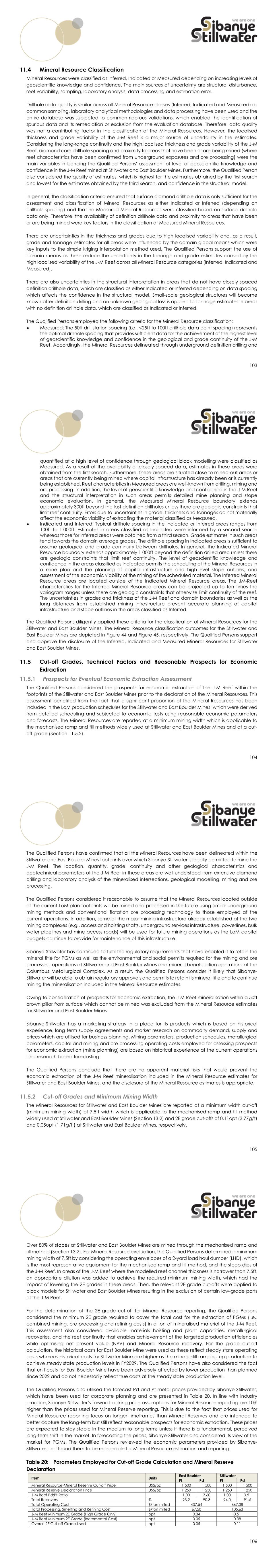 107 Using the parameters in Table 20 provided by Sibanye-Stillwater, the Qualified Person initially determined the minimum 2E grades required to pay for the extraction and processing of a ton of high-grade ore at East Boulder Mines of at least 0.34opt. This scenario excludes low-grade (0.05-0.34opt) material which is inevitably mined to access the high-grade material. The cost of mining of this low-grade material is already accounted for in the mining cost for high-grade material. Furthermore, there is sufficient hoisting and milling capacity for the processing of the mined low-grade material without displacing any high- grade material. Historically, this low-grade material has been mined and milled profitably together with the high-grade material and together these materials constitute the run of mine ore (RoM) reported as Mineral Reserves. Using the incremental cost of hoisting and processing the low-grade material, the Qualified Person determined an indicative 2E minimum grade of approximately 0.05opt (Table 20). Since all the material grading at least 0.05opt is processed at East Boulder Mine, the Qualified Person considered a 2E cut-off grade of 0.05opt to be appropriate for Mineral Resource reporting and this matches the cut-off grade for mechanised ramp and fill employed for Mineral Reserve reporting at East Boulder Mine. Applying the same grade cut-off calculation logic to Stillwater Mine, an indicative minimum 2E grade of 0.51opt was obtained for the mining and processing of high-grade ore while a minimum 2E grade of 0.08opt was determined under the incremental cost scenario. The higher cut-off grades reflect the higher operating costs associated with the current production ramp-up than those for East Boulder Mine. Due plant capacity constraints, Stillwater Mine milled material above 0.20opt and the mined low-grade material was not hoisted to surface. Accordingly, the 2E cut-off grade of 0.20opt which was applicable for the mining and processing of high-grade ore was used for Mineral Resource reporting at Stillwater Mine; this was also the cut-off grade used for Mineral Reserve reporting. However, the planned commissioning of additional mill capacity at Stillwater Mine in 2024 will remove the historical capacity constraints allowing for the hoisting and milling of low-grade material inevitably mined through to access high-grade ore. Accordingly, the reporting of Mineral Resources at a 2E cut-off grade of 0.11opt at Stillwater Mine is justified. While a higher 2E cut-off grade has been used for reporting the Mineral Resources at Stillwater Mine than for East Boulder Mine, the Qualified Persons consider it more appropriate and therefore recommend the reporting of Mineral Resources at the 2E cut-off grade of 0.05opt at both mines. Aligning the cut-off grade will more fully reflect the Mineral Resource potential of the J-M Reef than the 0.11opt used at Stillwater Mine which is driven by high operating costs during the production ramp up phase. Mineral Resource Estimates 31 December 2023 Mineral Resource Statements The Mineral Resource estimates for Stillwater and East Boulder Mines as at the end of the fiscal year ended 31 December 2023 are summarised in Table 21 and Table 22. The Mineral Resource estimates in Table 21 are reported inclusive of Mineral Reserves while the estimates in Table 22 are reported exclusive of Mineral Reserves. These estimates are in situ estimates of tonnage and grades (point of reference) 108 reported at a minimum mining width of 7.5ft, which is applicable for the dominant ramp and fill underground mining method at Stillwater and East Boulder Mines. Furthermore, the Mineral Resources are reported at 2E cut-off off grades of 0.11opt (3.44g/t) and 0.05opt (1.71g/t) at Stillwater and East Boulder Mines, respectively. Individual metal grades are based on prill splits (metal ratio) data routinely collected at the concentrators, which are summarised in Table 47. No metal equivalents are reported as these are irrelevant to Stillwater and East Boulder Mines. The Qualified Persons with responsibility for reporting and sign-off of the Mineral Resources for Stillwater and East Boulder Mines are Jeff Hughs and Jennifer Evans, respectively. Jennifer and Jeff are Professional Geologists with more than five years of experience relevant to the estimation and reporting of Mineral Resources and mining of the J-M Reef at Stillwater and East Boulder Mines. Table 21: Mineral Resource Estimates Inclusive of Mineral Reserves at the End of the Fiscal Year Ended 31 December 2023 Based on Pd and Pt Price of $1 500/oz Description Mineral Resources Inclusive of Mineral Reserves Imperial Category Mine Tons (Million) Pd (opt) Pt (opt) 2E (opt) 2E Content (Moz) Measured Stillwater 30.7 0.38 0.11 0.49 15.1 East Boulder 18.3 0.28 0.08 0.36 6.6 Subtotal/Average 49.0 0.35 0.10 0.44 21.7 Indicated Stillwater 25.7 0.38 0.11 0.49 12.5 East Boulder 28.4 0.27 0.08 0.35 10.0 Subtotal/Average 54.1 0.32 0.09 0.41 22.4 Measured + Indicated Stillwater 56.4 0.38 0.11 0.49 27.6 East Boulder 46.8 0.28 0.08 0.35 16.6 Subtotal/Average 103.1 0.33 0.09 0.43 44.1 Inferred Stillwater 64.0 0.27 0.08 0.35 22.4 East Boulder 61.5 0.27 0.08 0.35 21.3 Subtotal/Average 125.5 0.27 0.08 0.35 43.7 Metric Category Mine Tonnes (Million) Pd (g/t) Pt (g/t) 2E (g/t) 2E Content (Moz) Measured Stillwater 27.8 13.15 3.75 16.90 15.1 East Boulder 16.6 9.65 2.68 12.33 6.6 Subtotal/Average 44.5 11.84 3.35 15.19 21.7 Indicated Stillwater 23.3 12.96 3.69 16.65 12.5 East Boulder 25.8 9.40 2.61 12.01 10.0 Subtotal/Average 49.1 11.09 3.12 14.21 22.4 Measured + Indicated Stillwater 51.1 13.06 3.72 16.79 27.6 East Boulder 42.4 9.50 2.64 12.13 16.6 Subtotal/Average 93.6 11.45 3.23 14.68 44.1 Inferred Stillwater 58.0 9.35 2.66 12.01 22.4 East Boulder 55.8 9.29 2.58 11.87 21.3 Subtotal/Average 113.8 9.32 2.62 11.94 43.7 2E Cut-off Grade Stillwater Mine – 0.11opt (3.77g/t) 2E Cut-off Grade East Boulder Mine – 0.05opt (1.71g/t) Pd Price 