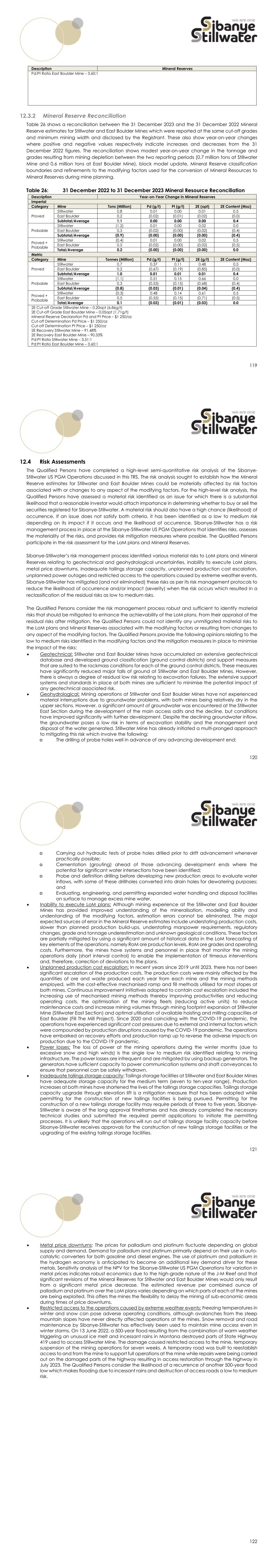 119 Description Mineral Reserves Pd:Pt Ratio East Boulder Mine – 3.60:1 Mineral Reserve Reconciliation Table 26 shows a reconciliation between the 31 December 2023 and the 31 December 2022 Mineral Reserve estimates for Stillwater and East Boulder Mines which were reported at the same cut-off grades and minimum mining width and disclosed by the Registrant. These also show year-on-year changes where positive and negative values respectively indicate increases and decreases from the 31 December 2022 figures. The reconciliation shows modest year-on-year change in the tonnage and grades resulting from mining depletion between the two reporting periods (0.7 million tons at Stillwater Mine and 0.6 million tons at East Boulder Mine), block model update, Mineral Reserve classification boundaries and refinements to the modifying factors used for the conversion of Mineral Resources to Mineral Reserves during mine planning. Table 26: 31 December 2022 to 31 December 2023 Mineral Resource Reconciliation Description Year-on-Year Change in Mineral Reserves Imperial Category Mine Tons (Million) Pd (g/t) Pt (g/t) 2E (opt) 2E Content (Moz) Proved Stillwater 0.8 0.01 0.00 0.01 0.5 East Boulder 0.2 (0.02) (0.01) (0.02) (0.0) Subtotal/Average 1.1 0.00 0.00 0.00 0.4 Probable Stillwater (1.2) 0.01 0.00 0.02 0.0 East Boulder 0.3 (0.02) (0.00) (0.02) (0.4) Subtotal/Average (0.9) (0.00) (0.00) (0.00) (0.4) Proved + Probable Stillwater (0.4) 0.01 0.00 0.02 0.5 East Boulder 0.5 (0.02) (0.00) (0.02) (0.5) Total/Average 0.2 (0.00) (0.00) (0.00) 0.0 Metric Category Mine Tonnes (Million) Pd (g/t) Pt (g/t) 2E (g/t) 2E Content (Moz) Proved Stillwater 0.7 0.37 0.11 0.48 0.5 East Boulder 0.2 (0.67) (0.19) (0.85) (0.0) Subtotal/Average 1.0 0.01 0.01 0.01 0.4 Probable Stillwater (1.1) 0.51 0.15 0.66 0.0 East Boulder 0.3 (0.53) (0.15) (0.68) (0.4) Subtotal/Average (0.8) (0.03) (0.01) (0.04) (0.4) Proved + Probable Stillwater (0.3) 0.48 0.14 0.61 0.5 East Boulder 0.5 (0.55) (0.15) (0.71) (0.5) Total/Average 0.1 (0.03) (0.01) (0.03) 0.0 2E Cut-off Grade Stillwater Mine – 0.20opt (6.86g/t) 2E Cut-off Grade East Boulder Mine – 0.05opt (1.71g/t) Mineral Reserve Declaration Pd and Pt Price – $1 250/oz Cut-off Determination Pd Price – $1 250/oz Cut-off Determination Pt Price – $1 250/oz 2E Recovery Stillwater Mine – 91.48% 2E Recovery East Boulder Mine – 90.33% Pd:Pt Ratio Stillwater Mine – 3.51:1 Pd:Pt Ratio East Boulder Mine – 3.60:1 120 Risk Assessments The Qualified Persons have completed a high-level semi-quantitative risk analysis of the Sibanye- Stillwater US PGM Operations discussed in this TRS. The risk analysis sought to establish how the Mineral Reserve estimates for Stillwater and East Boulder Mines could be materially affected by risk factors associated with or changes to any aspect of the modifying factors. For the high-level risk analysis, the Qualified Persons have assessed a material risk identified as an issue for which there is a substantial likelihood that a reasonable investor would attach importance in determining whether to buy or sell the securities registered for Sibanye-Stillwater. A material risk should also have a high chance (likelihood) of occurrence. If an issue does not satisfy both criteria, it has been identified as a low to medium risk depending on its impact if it occurs and the likelihood of occurrence. Sibanye-Stillwater has a risk management process in place at the Sibanye-Stillwater US PGM Operations that identifies risks, assesses the materiality of the risks, and provides risk mitigation measures where possible. The Qualified Persons participate in the risk assessment for the LoM plans and Mineral Reserves. Sibanye-Stillwater’s risk management process identified various material risks to LoM plans and Mineral Reserves relating to geotechnical and geohydrological uncertainties, inability to execute LoM plans, metal price downturns, inadequate tailings storage capacity, unplanned production cost escalation, unplanned power outages and restricted access to the operations caused by extreme weather events. Sibanye-Stillwater has mitigated (and not eliminated) these risks as per its risk management protocols to reduce the likelihood of occurrence and/or impact (severity) when the risk occurs which resulted in a reclassification of the residual risks as low to medium risks. The Qualified Persons consider the risk management process robust and sufficient to identify material risks that should be mitigated to enhance the achievability of the LoM plans. From their appraisal of the residual risks after mitigation, the Qualified Persons could not identify any unmitigated material risks to the LoM plans and Mineral Reserves associated with the modifying factors or resulting from changes to any aspect of the modifying factors. The Qualified Persons provide the following opinions relating to the low to medium risks identified in the modifying factors and the mitigation measures in place to minimise the impact of the risks:  Geotechnical: Stillwater and East Boulder Mines have accumulated an extensive geotechnical database and developed ground classification (ground control districts) and support measures that are suited to the rockmass conditions for each of the ground control districts. These measures have significantly reduced major falls of ground at Stillwater and East Boulder Mines. However, there is always a degree of residual low risk relating to excavation failures. The extensive support systems and standards in place at both mines are sufficient to minimise the potential impact of any geotechnical associated risk.  Geohydrological: Mining operations at Stillwater and East Boulder Mines have not experienced material interruptions due to groundwater problems, with both mines being relatively dry in the upper sections. However, a significant amount of groundwater was encountered at the Stillwater East Section during the development of the main access adits and the decline, 