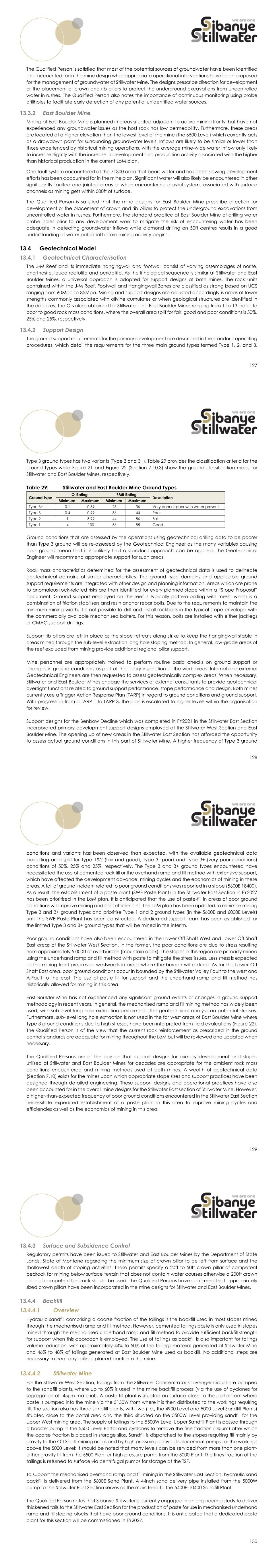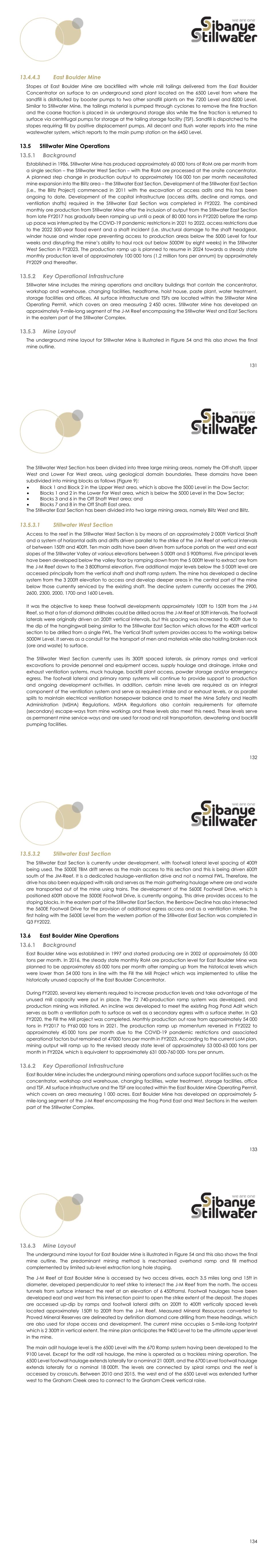 131 13.4.4.3 East Boulder Mine Stopes at East Boulder Mine are backfilled with whole mill tailings delivered from the East Boulder Concentrator on surface to an underground sand plant located on the 6500 Level from where the sandfill is distributed by booster pumps to two other sandfill plants on the 7200 Level and 8200 Level. Similar to Stillwater Mine, the tailings material is pumped through cyclones to remove the fine fraction and the coarse fraction is placed in six underground storage silos while the fine fraction is returned to surface via centrifugal pumps for storage at the tailing storage facility (TSF). Sandfill is dispatched to the stopes requiring fill by positive displacement pumps. All decant and flush water reports into the mine wastewater system, which reports to the main pump station on the 6450 Level. Stillwater Mine Operations Background Established in 1986, Stillwater Mine has produced approximately 60 000 tons of RoM ore per month from a single section – the Stillwater West Section – with the RoM ore processed at the onsite concentrator. A planned step change in production output to approximately 106 000 ton per month necessitated mine expansion into the Blitz area – the Stillwater East Section. Development of the Stillwater East Section (i.e., the Blitz Project) commenced in 2011 with the excavation of access adits and this has been ongoing to date. Development of the capital infrastructure (access drifts, decline and ramps, and ventilation shafts) required in the Stillwater East Section was completed in FY2022. The combined monthly ore production from Stillwater Mine after the inclusion of output from the Stillwater East Section from late FY2017 has gradually been ramping up until a peak of 80 000 tons in FY2020 before the ramp up pace was interrupted by the COVID-19 pandemic restrictions in 2021 to 2022, access restrictions due to the 2022 500-year flood event and a shaft incident (i.e. structural damage to the shaft headgear, winder house and winder rope preventing access to production areas below the 5000 Level for four weeks and disrupting the mine’s ability to haul rock out below 5000W by eight weeks) in the Stillwater West Section in FY2023. The production ramp up is planned to resume in 2024 towards a steady state monthly production level of approximately 100 000 tons (1.2 million tons per annum) by approximately FY2029 and thereafter. Key Operational Infrastructure Stillwater Mine includes the mining operations and ancillary buildings that contain the concentrator, workshop and warehouse, changing facilities, headframe, hoist house, paste plant, water treatment, storage facilities and offices. All surface infrastructure and TSFs are located within the Stillwater Mine Operating Permit, which covers an area measuring 2 450 acres. Stillwater Mine has developed an approximately 9-mile-long segment of the J-M Reef encompassing the Stillwater West and East Sections in the eastern part of the Stillwater Complex. Mine Layout The underground mine layout for Stillwater Mine is illustrated in Figure 54 and this also shows the final mine outline. 132 The Stillwater West Section has been divided into three large mining areas, namely the Off-shaft, Upper West and Lower Far West areas, using geological domain boundaries. These domains have been subdivided into mining blocks as follows (Figure 9):  Block 1 and Block 2 in the Upper West area, which is above the 5000 Level in the Dow Sector;  Blocks 1 and 2 in the Lower Far West area, which is below the 5000 Level in the Dow Sector;  Blocks 3 and 6 in the Off Shaft West area; and  Blocks 7 and 8 in the Off Shaft East area. The Stillwater East Section has been divided into two large mining areas, namely Blitz West and Blitz. 13.5.3.1 Stillwater West Section Access to the reef in the Stillwater West Section is by means of an approximately 2 000ft Vertical Shaft and a system of horizontal adits and drifts driven parallel to the strike of the J-M Reef at vertical intervals of between 150ft and 400ft. Ten main adits have been driven from surface portals on the west and east slopes of the Stillwater Valley at various elevations between 5 000ft and 5 900ftamsl. Five principal levels have been developed below the valley floor by ramping down from the 5 000ft level to extract ore from the J-M Reef down to the 3 800ftamsl elevation. Five additional major levels below the 5 000ft level are accessed principally from the vertical shaft and shaft ramp system. The mine has developed a decline system from the 3 200ft elevation to access and develop deeper areas in the central part of the mine below those currently serviced by the existing shaft. The decline system currently accesses the 2900, 2600, 2300, 2000, 1700 and 1600 Levels. It was the objective to keep these footwall developments approximately 100ft to 150ft from the J-M Reef, so that a fan of diamond drillholes could be drilled across the J-M Reef at 50ft intervals. The footwall laterals were originally driven on 200ft vertical intervals, but this spacing was increased to 400ft due to the dip of the hangingwall being similar to the Stillwater East Section which allows for the 400ft vertical section to be drilled from a single FWL. The Vertical Shaft system provides access to the workings below 5000W Level. It serves as a conduit for the transport of men and materials while also hoisting broken rock (ore and waste) to surface. The Stillwater West Section currently uses its 300ft spaced laterals, six primary ramps and vertical excavations to provide personnel and equipment access, supply haulage and drainage, intake and exhaust ventilation systems, muck haulage, backfill plant access, powder storage and/or emergency egress. The footwall lateral and primary ramp systems will continue to provide support to production and ongoing development activities. In addition, certain mine levels are required as an integral component of the ventilation system and serve as requi