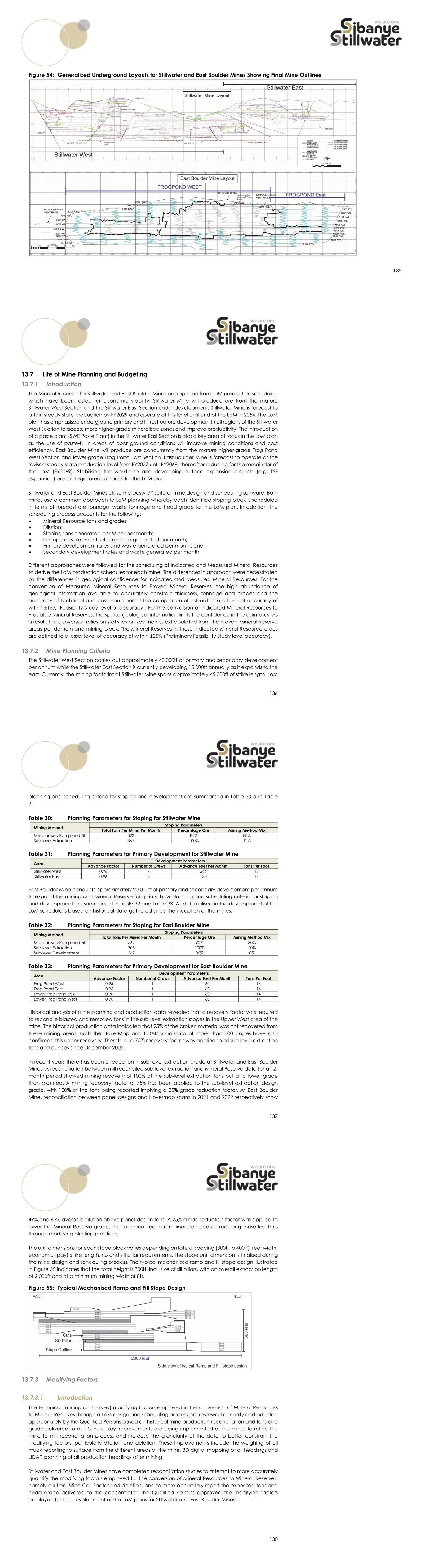 123 MINING METHODS Introduction Stillwater and East Boulder Mines are mature operations extracting the J-M Reef using well-established mining methods. Most of the permanent infrastructure required to access the underground operations is already established and being upgraded where necessary to accommodate production increases anticipated in the LoM plans for the operations. The LoM plans for Stillwater and East Boulder Mines, which underlie the Mineral Reserves, were constructed internally by Sibanye-Stillwater’s Qualified Persons supported by Technical Experts and utilising modifying factors and capital and operating costs which are informed by historical experience at the mines. Accordingly, the technical inputs, modifying factors, staffing levels, capital and operating costs utilised for LoM production planning and conversion of Measured Mineral Resources to Proved Mineral Reserves are within ±15% accuracy and the costs allow for up to 10% contingency. However, for the LoM production planning and conversion of Indicated Mineral Resources to Probable Mineral Reserves, the inputs and costs are within ±15% accuracy and the costs allow for up to 10-15% contingency. The economic viability of the LoM plans was assessed through detailed cash flow analysis. Mining recovery (stope extraction) factors are discussed in Section 13.2.4 of this TRS. Mine Design Mining Method Rationale The J-M Reef outcrops over a 28-mile strike length on the Sibanye-Stillwater Mining Claims but the topography, altitude and thickness of the reef preclude economic exploitation of the reef through open pit mining methods. Accordingly, waste stripping which would be applicable to an open pit mining is not required. At Stillwater Mine, the dip of the J-M Reef varies from 40° to 90° to the north, with an average of 60°. Reef thickness varies from 3ft to more than 9ft but averages 6ft. The J-M Reef at East Boulder Mine dips 35° to 55° (averaging 50°) to the north. The shallowest dip (35°) is observed in the far west area accessed by the 6500 Level Footwall Lateral. Both Stillwater and East Boulder Mines employ the following underground mining methods, which are suited for the variable steep dips and narrow widths of the J-M Reef:  Mechanised ramp and fill (also referred to as cut and fill) using overhand or underhand approaches; and  Sub-level extraction by longitudinal hole open stoping with subsequent backfill. The captive cut and fill stoping method which was also being used at the mines has been phased out. The mining method mix is adjustable and largely driven by geotechnical considerations as well as mineralisation grade and the requirement to minimise dilution. The percentage distribution (frequency of use) of the two mining methods within each of the mines is shown in Table 27. Mechanised ramp and fill stoping (which includes on-reef sub-level sill development) is the predominant mining method at both mine-sites. The mechanised ramp and fill method allows for maximum selectivity for separating ore and waste. Sub-level extraction long hole stoping is utilised typically in narrow continuous ore zones. Except for open stoping, the mining methods employ high-quality sand or paste as backfill, with limited use of Cemented Rock Fill (CRF) and/or other backfill materials. 124 Table 27: Mining method frequency of use at Stillwater and East Boulder Mines Mining Method Frequency of Use Stillwater Mine East Boulder Mine Mechanised Ramp and Fill 86% 83% Sub-level Extraction Long Hole Open Stoping 14% 17% Mechanised Ramp and Fill Method Mechanised overhand ramp and fill stoping is the predominant mining method at the Stillwater and East Boulder Mines while 11% to 20% of the stopes at the Stillwater Mine are extracted through mechanised underhand ramp and fill stoping. The two ramp and fill applications practiced at the mines are illustrated in Figure 52. The backfill for the mechanised overhand and underhand ramp and fill stoping are predominately sand (classified coarse fraction mill tailings) and paste, respectively; in the past CRF was utilised for limited applications but has been phased out due to logistical constraints. Where ground conditions permit, the overhand method is preferred as it is more cost effective. Where less stable ground conditions dictate, mechanised underhand ramp and fill is applied, with the more expensive paste backfill also used. Up to 12% cement is used in the paste fill, as needed, to provide a stable overhead cemented paste material. Furthermore, development ramp gradients should not exceed 18%. Breast holes are drilled on most of the mechanised ramp and fill stopes areas using single-boom drill jumbos and, after blasting, the broken rock material is loaded by 2.0 cubic-yard LHDs. Figure 52: Mechanised Overhand and Underhand Ramp and Fill Mining Methods Sub-level Extraction and Sub-level Development Where the J-M Reef and hangingwall are competent and the reef has good continuity, sub-level longitudinal open stoping using relatively shorter “long holes” compared to those in other mining districts is applied. This extraction method is illustrated in Figure 53. The sub-levels are driven on the reef plane at 125 20ft to 50ft intervals. Considerable tonnage generated by driving sub-levels in the reef is accounted for as Sub-level Development tonnage; this is accounted for in the “Mechanised Cut and Fill” percentage. Figure 53: Sub-level Extraction (Longitudinal) Long Hole Open Stoping In the sub-level extraction longitudinal stoping method, sub-level sills are driven with narrow single-boom jumbos. The long holes are drilled by long hole pneumatic and electric hydraulic drill rigs. Once the sub- levels are advanced, a drop raise is drilled from the upper sub-level to the lower sub-level and blasted at the end of the stope over the full width of the reef at that point. Blast holes are then drilled downward on a pattern between the sub-levels and blasted towards the open cavit