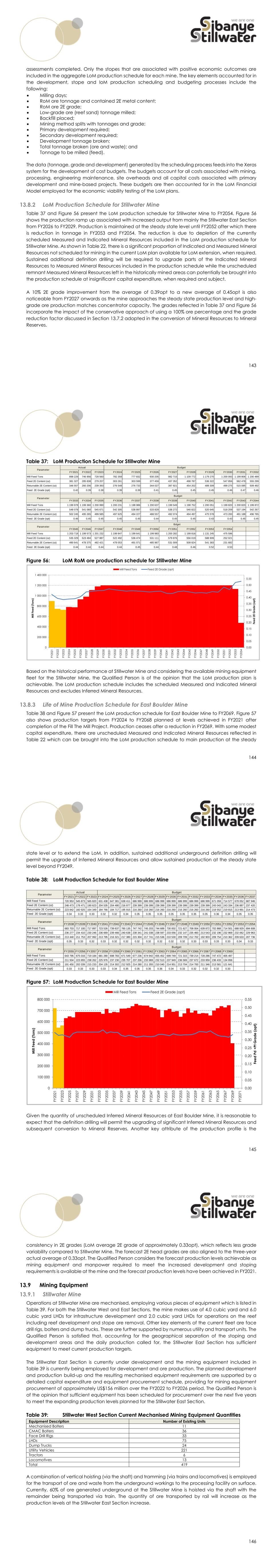 143 assessments completed. Only the stopes that are associated with positive economic outcomes are included in the aggregate LoM production schedule for each mine. The key elements accounted for in the development, stope and loM production scheduling and budgeting processes include the following:  Milling days;  RoM ore tonnage and contained 2E metal content;  RoM ore 2E grade;  Low-grade ore (reef sand) tonnage milled;  Backfill placed;  Mining method splits with tonnages and grade;  Primary development required;  Secondary development required;  Development tonnage broken;  Total tonnage broken (ore and waste); and  Tonnage to be milled (feed). The data (tonnage, grade and development) generated by the scheduling process feeds into the Xeras system for the development of cost budgets. The budgets account for all costs associated with mining, processing, engineering maintenance, site overheads and all capital costs associated with primary development and mine-based projects. These budgets are then accounted for in the LoM Financial Model employed for the economic viability testing of the LoM plans. LoM Production Schedule for Stillwater Mine Table 37 and Figure 56 present the LoM production schedule for Stillwater Mine to FY2054. Figure 56 shows the production ramp up associated with increased output from mainly the Stillwater East Section from FY2026 to FY2029. Production is maintained at the steady state level until FY2052 after which there is reduction in tonnage in FY2053 and FY2054. The reduction is due to depletion of the currently scheduled Measured and Indicated Mineral Resources included in the LoM production schedule for Stillwater Mine. As shown in Table 22, there is a significant proportion of Indicated and Measured Mineral Resources not scheduled for mining in the current LoM plan available for LoM extension, when required. Sustained additional definition drilling will be required to upgrade parts of the Indicated Mineral Resources to Measured Mineral Resources included in the production schedule while the unscheduled remnant Measured Mineral Resources left in the historically mined areas can potentially be brought into the production schedule at insignificant capital expenditure, when required and subject. A 10% 2E grade improvement from the average of 0.39opt to a new average of 0.45opt is also noticeable from FY2027 onwards as the mine approaches the steady state production level and high- grade ore production matches concentrator capacity. The grades reflected in Table 37 and Figure 56 incorporate the impact of the conservative approach of using a 100% ore percentage and the grade reduction factor discussed in Section 13.7.2 adopted in the conversion of Mineral Resources to Mineral Reserves. 144 Table 37: LoM Production Schedule for Stillwater Mine Figure 56: LoM RoM ore production schedule for Stillwater Mine Based on the historical performance at Stillwater Mine and considering the available mining equipment fleet for the Stillwater Mine, the Qualified Person is of the opinion that the LoM production plan is achievable. The LoM production schedule includes the scheduled Measured and Indicated Mineral Resources and excludes Inferred Mineral Resources. Life of Mine Production Schedule for East Boulder Mine Table 38 and Figure 57 present the LoM production schedule for East Boulder Mine to FY2069. Figure 57 also shows production targets from FY2024 to FY2068 planned at levels achieved in FY2021 after completion of the Fill The Mill Project. Production ceases after a reduction in FY2069. With some modest capital expenditure, there are unscheduled Measured and Indicated Mineral Resources reflected in Table 22 which can be brought into the LoM production schedule to main production at the steady FY2021 FY2022 FY2023 FY2024 FY2025 FY2026 FY2027 FY2028 FY2029 FY2030 FY2031 FY2032 Mill Feed Tons 898 229 746 956 728 560 782 359 777 832 930 205 982 715 1 109 772 1 179 270 1 200 093 1 199 806 1 200 489 Feed 2E Content (oz) 381 327 285 838 279 207 303 261 303 599 377 459 437 352 498 787 536 322 547 856 562 478 555 299 Returnable 2E Content (oz) 346 557 260 206 239 393 276 549 276 733 344 027 397 921 454 202 489 309 499 275 515 085 509 492 Feed 2E Grade (opt) 0.42 0.39 0.38 0.39 0.39 0.41 0.45 0.45 0.45 0.46 0.47 0.46 FY2033 FY2034 FY2035 FY2036 FY2037 FY2038 FY2039 FY2040 FY2041 FY2042 FY2043 FY2044 Mill Feed Tons 1 199 978 1 199 360 1 200 990 1 200 231 1 198 986 1 200 637 1 199 549 1 198 752 1 200 051 1 199 820 1 200 820 1 199 872 Feed 2E Content (oz) 548 078 541 060 545 671 542 305 538 897 533 829 538 272 540 822 520 645 518 209 537 194 542 267 Returnable 2E Content (oz) 502 245 495 265 499 585 497 625 494 227 488 557 492 074 494 497 475 578 473 200 491 188 496 765 Feed 2E Grade (opt) 0.46 0.45 0.45 0.45 0.45 0.44 0.45 0.45 0.43 0.43 0.45 0.45 FY2045 FY2046 FY2047 FY2048 FY2049 FY2050 FY2051 FY2052 FY2053 FY2054 Mill Feed Tons 1 203 718 1 199 573 1 201 232 1 199 847 1 199 641 1 199 983 1 200 282 1 199 816 1 131 245 475 596 Feed 2E Content (oz) 535 329 523 484 527 887 522 492 536 474 531 111 579 876 556 019 588 909 252 021 Returnable 2E Content (oz) 490 641 478 375 482 421 478 053 491 071 485 967 531 009 508 824 541 383 231 682 Feed 2E Grade (opt) 0.44 0.44 0.44 0.44 0.45 0.44 0.48 0.46 0.52 0.53 Parameter Actual Parameter Parameter Budget Budget Bdget 0.00 0.05 0.10 0.15 0.20 0.25 0.30 0.35 0.40 0.45 0.50 0.55 0 200 000 400 000 600 000 800 000 1 000 000 1 200 000 1 400 000 FY 2 0 2 1 FY 2 0 2 2 FY 2 0 2 3 FY 2 0 2 4 FY 2 0 2 5 FY 2 0 2 6 FY 2 0 2 7 FY 2 0 2 8 FY 2 0 2 9 FY 2 0 3 0 FY 2 0 3 1 FY 2 0 3 2 FY 2 0 3 3 FY 2 0 3 4 FY 2 0 3 5 FY 2 0 3 6 FY 2 0 3 7 FY 2 0 3 8 FY 2 0 3 9 FY 2 0 4 0 FY 2 0 4 1 FY 2 0 4 2 FY 2 0 4 3 FY 2 0 4 4 FY 2 0 4 5 FY 2 0 4 6 FY 2 0 4 7 FY 2 0 4 8 FY 2 0 4 9 FY 2 0 5 0 FY 2 0 5 1 FY 2 0 5 2 FY 2 0 5 3 FY 2 0 5 4 Fe e d 2 E G ra d e ( o p t) M ill F e e d ( To n s) Mill Feed Tons Feed 2E Grade (opt) 145 state 