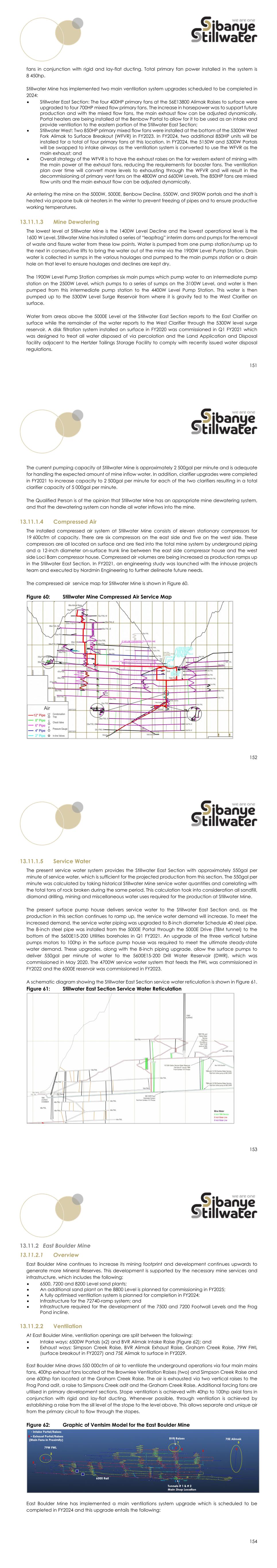 151 fans in conjunction with rigid and lay-flat ducting. Total primary fan power installed in the system is 8 450hp. Stillwater Mine has implemented two main ventilation system upgrades scheduled to be completed in 2024:  Stillwater East Section: The four 400HP primary fans at the 56E13800 Alimak Raises to surface were upgraded to four 700HP mixed flow primary fans. The increase in horsepower was to support future production and with the mixed flow fans, the main exhaust flow can be adjusted dynamically. Portal heaters are being installed at the Benbow Portal to allow for it to be used as an intake and provide ventilation to the eastern portion of the Stillwater East Section;  Stillwater West: Two 850HP primary mixed flow fans were installed at the bottom of the 5300W West Fork Alimak to Surface Breakout (WFVR) in FY2023. In FY2024, two additional 850HP units will be installed for a total of four primary fans at this location. In FY2024, the 5150W and 5300W Portals will be swapped to intake airways as the ventilation system is converted to use the WFVR as the main exhaust; and  Overall strategy of the WFVR is to have the exhaust raises on the far western extent of mining with the main power at the exhaust fans, reducing the requirements for booster fans. The ventilation plan over time will convert more levels to exhausting through the WFVR and will result in the decommissioning of primary vent fans on the 4800W and 6600W Levels. The 850HP fans are mixed flow units and the main exhaust flow can be adjusted dynamically. Air entering the mine on the 5000W, 5000E, Benbow Decline, 5500W, and 5900W portals and the shaft is heated via propane bulk air heaters in the winter to prevent freezing of pipes and to ensure productive working temperatures. 13.11.1.3 Mine Dewatering The lowest level at Stillwater Mine is the 1400W Level Decline and the lowest operational level is the 1600 W Level. Stillwater Mine has installed a series of “leapfrog” interim dams and pumps for the removal of waste and fissure water from these low points. Water is pumped from one pump station/sump up to the next in consecutive lifts to bring the water out of the mine via the 1900W Level Pump Station. Drain water is collected in sumps in the various haulages and pumped to the main pumps station or a drain hole on that level to ensure haulages and declines are kept dry. The 1900W Level Pump Station comprises six main pumps which pump water to an intermediate pump station on the 2500W Level, which pumps to a series of sumps on the 3100W Level, and water is then pumped from this intermediate pump station to the 4400W Level Pump Station. This water is then pumped up to the 5300W Level Surge Reservoir from where it is gravity fed to the West Clarifier on surface. Water from areas above the 5000E Level at the Stillwater East Section reports to the East Clarifier on surface while the remainder of the water reports to the West Clarifier through the 5300W level surge reservoir. A disk filtration system installed on surface in FY2020 was commissioned in Q1 FY2021 which was designed to treat all water disposed of via percolation and the Land Application and Disposal facility adjacent to the Hertzler Tailings Storage Facility to comply with recently issued water disposal regulations. 152 The current pumping capacity at Stillwater Mine is approximately 2 500gal per minute and is adequate for handling the expected amount of mine inflow water. In addition, clarifier upgrades were completed in FY2021 to increase capacity to 2 500gal per minute for each of the two clarifiers resulting in a total clarifier capacity of 5 000gal per minute. The Qualified Person is of the opinion that Stillwater Mine has an appropriate mine dewatering system, and that the dewatering system can handle all water inflows into the mine. 13.11.1.4 Compressed Air The installed compressed air system at Stillwater Mine consists of eleven stationary compressors for 19 600cfm of capacity. There are six compressors on the east side and five on the west side. These compressors are all located on surface and are tied into the total mine system by underground piping and a 12-inch diameter on-surface trunk line between the east side compressor house and the west side Loci Barn compressor house. Compressed air volumes are being increased as production ramps up in the Stillwater East Section. In FY2021, an engineering study was launched with the inhouse projects team and executed by Nordmin Engineering to further delineate future needs. The compressed air service map for Stillwater Mine is shown in Figure 60. Figure 60: Stillwater Mine Compressed Air Service Map 153 13.11.1.5 Service Water The present service water system provides the Stillwater East Section with approximately 550gal per minute of service water, which is sufficient for the projected production from this section. The 550gal per minute was calculated by taking historical Stillwater Mine service water quantities and correlating with the total tons of rock broken during the same period. This calculation took into consideration all sandfill, diamond drilling, mining and miscellaneous water uses required for the production at Stillwater Mine. The present surface pump house delivers service water to the Stillwater East Section and, as the production in this section continues to ramp up, the service water demand will increase. To meet the increased demand, the service water piping was upgraded to 8-inch diameter Schedule 40 steel pipe. The 8-inch steel pipe was installed from the 5000E Portal through the 5000E Drive (TBM tunnel) to the bottom of the 5600E15-200 Utilities boreholes in Q1 FY2021. An upgrade of the three vertical turbine pumps motors to 100hp in the surface pump house was required to meet the ultimate steady-state water demand. These upgrades, along with the 8-inch piping upgrade, allow the surface pumps to deliver 550gal per minute of water to the 5600E15-200 Drill Water Reservoir (DWR), whi