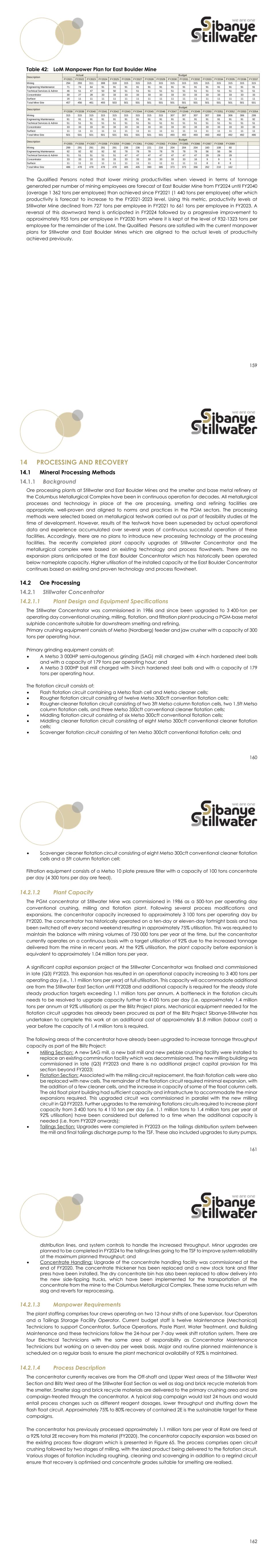 159 Table 42: LoM Manpower Plan for East Boulder Mine The Qualified Persons noted that lower mining productivities when viewed in terms of tonnage generated per number of mining employees are forecast at East Boulder Mine from FY2024 until FY2040 (average 1 362 tons per employee) than achieved since FY2021 (1 440 tons per employee) after which productivity is forecast to increase to the FY2021-2023 level. Using this metric, productivity levels at Stillwater Mine declined from 727 tons per employee in FY2021 to 661 tons per employee in FY2023. A reversal of this downward trend is anticipated in FY2024 followed by a progressive improvement to approximately 955 tons per employee in FY2030 from where it is kept at the level of 932-1323 tons per employee for the remainder of the LoM. The Qualified Persons are satisfied with the current manpower plans for Stillwater and East Boulder Mines which are aligned to the actual levels of productivity achieved previously. FY2021 FY2022 FY2023 FY2024 FY2025 FY2026 FY2027 FY2028 FY2029 FY2030 FY2031 FY2032 FY2033 FY2034 FY2035 FY2036 FY2037 Mining 294 293 311 308 318 315 315 315 315 315 315 315 315 315 315 315 315 Engineering Maintenance 71 74 64 91 91 91 91 91 91 91 91 91 91 91 91 91 91 Technical Services & Admin 46 51 47 50 50 51 51 51 51 51 51 51 51 51 51 51 51 Concentrator 30 27 28 33 33 33 33 33 33 33 33 33 33 33 33 33 33 Surface 16 11 11 11 11 11 11 11 11 11 11 11 11 11 11 11 11 Total Mine Site 457 456 461 493 503 501 501 501 501 501 501 501 501 501 501 501 501 FY2038 FY2039 FY2040 FY2041 FY2042 FY2043 FY2044 FY2045 FY2046 FY2047 FY2048 FY2049 FY2050 FY2051 FY2052 FY2053 FY2054 Mining 315 315 315 315 315 315 315 315 315 307 307 307 307 306 306 306 299 Engineering Maintenance 91 91 91 91 91 91 91 91 91 91 91 91 91 91 91 91 92 Technical Services & Admin 51 51 51 51 51 51 51 51 51 51 51 51 51 51 51 51 51 Concentrator 33 33 33 33 33 33 33 33 33 33 33 33 33 33 33 33 33 Surface 11 11 11 11 11 11 11 11 11 11 11 11 11 11 11 11 11 Total Mine Site 501 501 501 501 501 501 501 501 501 493 493 493 493 492 492 492 486 FY2055 FY2056 FY2057 FY2058 FY2059 FY2060 FY2061 FY2062 FY2063 FY2064 FY2065 FY2066 FY2067 FY2068 FY2069 Mining 299 291 291 291 291 236 236 221 216 204 204 204 160 108 60 Engineering Maintenance 92 92 92 92 92 78 78 78 78 78 78 78 56 56 56 Technical Services & Admin 51 51 51 51 51 47 47 47 47 47 47 47 29 29 29 Concentrator 33 33 33 33 33 33 33 33 33 33 33 16 9 9 9 Surface 11 11 11 11 11 11 11 11 11 11 11 11 8 8 8 Total Mine Site 486 478 478 478 478 405 405 390 385 373 373 356 262 210 162 Description Description Budget Budget Budget Description Actual 160 PROCESSING AND RECOVERY Mineral Processing Methods Background Ore processing plants at Stillwater and East Boulder Mines and the smelter and base metal refinery at the Columbus Metallurgical Complex have been in continuous operation for decades. All metallurgical processes and technology in place at the ore processing, smelting and refining facilities are appropriate, well-proven and aligned to norms and practices in the PGM sectors. The processing methods were selected based on metallurgical testwork carried out as part of feasibility studies at the time of development. However, results of the testwork have been superseded by actual operational data and experience accumulated over several years of continuous successful operation of these facilities. Accordingly, there are no plans to introduce new processing technology at the processing facilities. The recently completed plant capacity upgrades at Stillwater Concentrator and the metallurgical complex were based on existing technology and process flowsheets. There are no expansion plans anticipated at the East Boulder Concentrator which has historically been operated below nameplate capacity. Higher utilisation of the installed capacity at the East Boulder Concentrator continues based on existing and proven technology and process flowsheet. Ore Processing Stillwater Concentrator 14.2.1.1 Plant Design and Equipment Specifications The Stillwater Concentrator was commissioned in 1986 and since been upgraded to 3 400-ton per operating day conventional crushing, milling, flotation, and filtration plant producing a PGM-base metal sulphide concentrate suitable for downstream smelting and refining. Primary crushing equipment consists of Metso (Nordberg) feeder and jaw crusher with a capacity of 300 tons per operating hour. Primary grinding equipment consists of:  A Metso 3 000HP semi-autogenous grinding (SAG) mill charged with 4-inch hardened steel balls and with a capacity of 179 tons per operating hour; and  A Metso 3 000HP ball mill charged with 3-inch hardened steel balls and with a capacity of 179 tons per operating hour. The flotation circuit consists of:  Flash flotation circuit containing a Metso flash cell and Metso cleaner cells;  Rougher flotation circuit consisting of twelve Metso 300cft convention flotation cells;  Rougher-cleaner flotation circuit consisting of two 3ft Metso column flotation cells, two 1.5ft Metso column flotation cells, and three Metso 350cft conventional cleaner flotation cells;  Middling flotation circuit consisting of six Metso 300cft conventional flotation cells;  Middling cleaner flotation circuit consisting of eight Metso 300cft conventional cleaner flotation cells;  Scavenger flotation circuit consisting of ten Metso 300cft conventional flotation cells; and 161  Scavenger cleaner flotation circuit consisting of eight Metso 300cft conventional cleaner flotation cells and a 5ft column flotation cell; Filtration equipment consists of a Metso 10 plate pressure filter with a capacity of 100 tons concentrate per day (4 300 tons per day ore feed). 14.2.1.2 Plant Capacity The PGM concentrator at Stillwater Mine was commissioned in 1986 as a 500-ton per operating day conventional crushing, milling and flotation plant. Following several process modifications and expansions, the concentrator capacity i