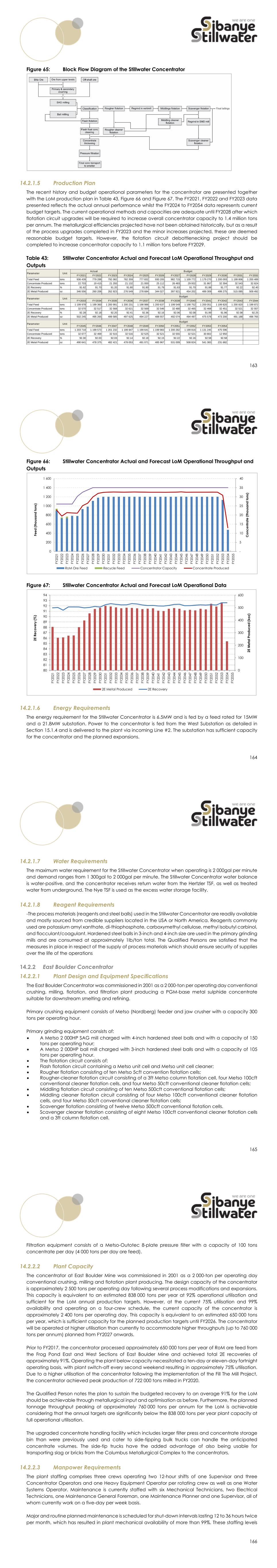 163 Figure 65: Block Flow Diagram of the Stillwater Concentrator 14.2.1.5 Production Plan The recent history and budget operational parameters for the concentrator are presented together with the LoM production plan in Table 43, Figure 66 and Figure 67. The FY2021, FY2022 and FY2023 data presented reflects the actual annual performance whilst the FY2024 to FY2054 data represents current budget targets. The current operational methods and capacities are adequate until FY2028 after which flotation circuit upgrades will be required to increase overall concentrator capacity to 1.4 million tons per annum. The metallurgical efficiencies projected have not been obtained historically, but as a result of the process upgrades completed in FY2023 and the minor increases projected, these are deemed reasonable budget targets. However, the flotation circuit debottlenecking project should be completed to increase concentrator capacity to 1.1 million tons before FY2029. Table 43: Stillwater Concentrator Actual and Forecast LoM Operational Throughput and Outputs FY2021 FY2022 FY2023 FY2024 FY2025 FY2026 FY2027 FY2028 FY2029 FY2030 FY2031 FY2032 Total Feed tons 936 439 779 288 792 082 782 359 777 832 930 205 982 715 1 109 772 1 179 270 1 200 093 1 199 806 1 200 489 Concentrate Produced tons 22 703 19 415 21 293 21 132 21 000 25 112 26 483 29 932 31 867 32 394 32 543 32 624 2E Recovery % 91.62 91.70 91.20 91.80 91.80 91.79 91.63 91.70 91.88 91.77 92.22 92.40 2E Metal Produced oz 346 556 260 206 262 923 276 549 278 684 344 027 397 921 454 202 489 309 499 275 515 085 509 492 FY2033 FY2034 FY2035 FY2036 FY2037 FY2038 FY2039 FY2040 FY2041 FY2042 FY2043 FY2044 Total Feed tons 1 199 978 1 199 360 1 200 991 1 200 231 1 198 986 1 200 637 1 199 549 1 198 752 1 200 051 1 199 820 1 200 820 1 199 872 Concentrate Produced tons 32 570 32 517 32 568 32 621 32 569 32 546 32 480 32 465 32 468 32 451 32 521 32 557 2E Recovery % 92.28 92.18 92.20 92.41 92.36 92.16 92.06 92.08 91.99 91.96 92.08 92.25 2E Metal Produced oz 502 245 495 265 499 585 497 625 494 227 488 557 492 074 494 497 475 578 473 200 491 188 496 765 FY2045 FY2046 FY2047 FY2048 FY2049 FY2050 FY2051 FY2052 FY2053 FY2054 Total Feed tons 1 203 718 1 199 573 1 201 232 1 199 847 1 199 641 1 199 983 1 200 282 1 199 816 1 131 245 475 596 Concentrate Produced tons 32 677 32 469 32 515 32 516 32 525 32 521 32 555 32 521 30 802 12 950 2E Recovery % 92.30 92.03 92.03 92.14 92.18 92.15 92.22 92.16 92.58 92.58 2E Metal Produced oz 490 641 478 375 482 421 478 053 491 071 485 967 531 009 508 824 541 383 231 682 Parameter Unit Unit Unit Actual Parameter Parameter Budget Budget Budget 164 Figure 66: Stillwater Concentrator Actual and Forecast LoM Operational Throughput and Outputs Figure 67: Stillwater Concentrator Actual and Forecast LoM Operational Data 14.2.1.6 Energy Requirements The energy requirement for the Stillwater Concentrator is 6.5MW and is fed by a feed rated for 15MW and a 21.8MW substation. Power to the concentrator is fed from the West Substation as detailed in Section 15.1.4 and is delivered to the plant via incoming Line #2. The substation has sufficient capacity for the concentrator and the planned expansions. - 5 10 15 20 25 30 35 40 0 200 400 600 800 1 000 1 200 1 400 1 600 FY 2 0 2 1 FY 2 0 2 2 FY 2 0 2 3 FY 2 0 2 4 FY 2 0 2 5 FY 2 0 2 6 FY 2 0 2 7 FY 2 0 2 8 FY 2 0 2 9 FY 2 0 3 0 FY 2 0 3 1 FY 2 0 3 2 FY 2 0 3 3 FY 2 0 3 4 FY 2 0 3 5 FY 2 0 3 6 FY 2 0 3 7 FY 2 0 3 8 FY 2 0 3 9 FY 2 0 4 0 FY 2 0 4 1 FY 2 0 4 2 FY 2 0 4 3 FY 2 0 4 4 FY 2 0 4 5 FY 2 0 4 6 FY 2 0 4 7 FY 2 0 4 8 FY 2 0 4 9 FY 2 0 5 0 FY 2 0 5 1 FY 2 0 5 2 FY 2 0 5 3 FY 2 0 5 4 FY 2 0 5 5 C o n c e n tr a te ( th o u sa n d t o n s) Fe e d ( th o u sa n d t o n s) RoM Ore Feed Recycle Feed Concentrator Capacity Concentrate Produced 0 100 200 300 400 500 600 80 81 82 83 84 85 86 87 88 89 90 91 92 93 94 FY 2 0 2 1 FY 2 0 2 2 FY 2 0 2 3 FY 2 0 2 4 FY 2 0 2 5 FY 2 0 2 6 FY 2 0 2 7 FY 2 0 2 8 FY 2 0 2 9 FY 2 0 3 0 FY 2 0 3 1 FY 2 0 3 2 FY 2 0 3 3 FY 2 0 3 4 FY 2 0 3 5 FY 2 0 3 6 FY 2 0 3 7 FY 2 0 3 8 FY 2 0 3 9 FY 2 0 4 0 FY 2 0 4 1 FY 2 0 4 2 FY 2 0 4 3 FY 2 0 4 4 FY 2 0 4 5 FY 2 0 4 6 FY 2 0 4 7 FY 2 0 4 8 FY 2 0 4 9 FY 2 0 5 0 FY 2 0 5 1 FY 2 0 5 2 FY 2 0 5 3 FY 2 0 5 4 FY 2 0 5 5 2 E M e ta l P ro d u c e d ( k o z) 2 E R e c o v e ry ( % ) 2E Metal Produced 2E Recovery 165 14.2.1.7 Water Requirements The maximum water requirement for the Stillwater Concentrator when operating is 2 000gal per minute and demand ranges from 1 300gal to 2 000gal per minute. The Stillwater Concentrator water balance is water-positive, and the concentrator receives return water from the Hertzler TSF, as well as treated water from underground. The Nye TSF is used as the excess water storage facility. 14.2.1.8 Reagent Requirements -The process materials (reagents and steel balls) used in the Stillwater Concentrator are readily available and mostly sourced from credible suppliers located in the USA or North America. Reagents commonly used are potassium amyl xanthate, di-thiophosphate, carboxymethyl cellulose, methyl Isobutyl carbinol, and flocculant/coagulant. Hardened steel balls in 3-inch and 4-inch size are used in the primary grinding mills and are consumed at approximately 1lb/ton total. The Qualified Persons are satisfied that the measures in place in respect of the supply of process materials which should ensure security of supplies over the life of the operations East Boulder Concentrator 14.2.2.1 Plant Design and Equipment Specifications The East Boulder Concentrator was commissioned in 2001 as a 2 000-ton per operating day conventional crushing, milling, flotation, and filtration plant producing a PGM-base metal sulphide concentrate suitable for downstream smelting and refining. Primary crushing equipment consists of Metso (Nordberg) feeder and jaw crusher with a capacity 300 tons per operating hour. Primary grinding equipment consists of:  A Metso 2 000HP SAG mill charged with 4-inch hardened steel ba