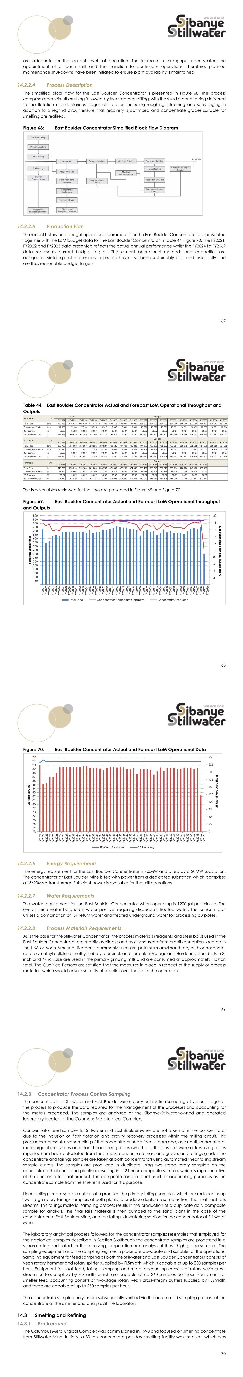 167 are adequate for the current levels of operation. The increase in throughput necessitated the appointment of a fourth shift and the transition to continuous operations. Therefore, planned maintenance shut-downs have been initiated to ensure plant availability is maintained. 14.2.2.4 Process Description The simplified block flow for the East Boulder Concentrator is presented in Figure 68. The process comprises open circuit crushing followed by two stages of milling, with the sized product being delivered to the flotation circuit. Various stages of flotation including roughing, cleaning and scavenging in addition to a regrind circuit ensure that recovery is optimised and concentrate grades suitable for smelting are realised. Figure 68: East Boulder Concentrator Simplified Block Flow Diagram 14.2.2.5 Production Plan The recent history and budget operational parameters for the East Boulder Concentrator are presented together with the LoM budget data for the East Boulder Concentrator in Table 44, Figure 70. The FY2021, FY2022 and FY2023 data presented reflects the actual annual performance whilst the FY2024 to FY2069 data represents current budget targets. The current operational methods and capacities are adequate. Metallurgical efficiencies projected have also been sustainably obtained historically and are thus reasonable budget targets. 168 Table 44: East Boulder Concentrator Actual and Forecast LoM Operational Throughput and Outputs The key variables reviewed for the LoM are presented in Figure 69 and Figure 70. Figure 69: East Boulder Concentrator Actual and Forecast LoM Operational Throughput and Outputs FY2021 FY2022 FY2023 FY2024 FY2025 FY2026 FY2027 FY2028 FY2029 FY2030 FY2031 FY2032 FY2033 FY2034 FY2035 FY2036 FY2037 Total Feed tons 720 033 545 873 565 820 631 438 647 381 638 411 686 999 686 999 686 999 686 999 686 999 686 999 686 999 671 059 714 577 678 052 687 946 Concentrate Produced tons 17 859 17 134 17 514 15 525 15 917 15 696 16 891 16 891 16 891 16 891 16 891 16 891 16 891 16 499 17 569 16 671 16 914 2E Recovery % 90.60 91.33 90.86 90.97 90.97 90.97 90.97 90.97 90.97 90.97 90.97 90.97 90.97 90.97 90.97 90.97 90.97 2E Metal Produced oz 223 842 160 925 164 349 184 766 184 717 195 915 216 260 216 260 216 260 216 260 216 260 216 260 216 260 219 552 219 815 213 991 214 473 FY2038 FY2039 FY2040 FY2041 FY2042 FY2043 FY2044 FY2045 FY2046 FY2047 FY2048 FY2049 FY2050 FY2051 FY2052 FY2053 FY2054 Total Feed tons 683 703 717 100 717 897 723 526 739 637 760 135 747 742 745 203 744 689 730 002 721 627 708 004 639 872 702 868 714 501 688 929 694 608 Concentrate Produced tons 16 810 17 631 17 651 17 789 18 185 18 689 18 384 18 322 18 309 17 948 17 742 17 407 15 732 17 281 17 567 16 938 17 078 2E Recovery % 90.97 90.97 90.97 90.97 90.97 90.97 90.97 90.97 90.97 90.97 90.97 90.97 90.97 90.97 90.97 90.97 90.97 2E Metal Produced oz 213 440 211 753 207 992 213 795 216 321 217 380 215 304 217 741 215 536 210 530 209 709 212 702 192 903 209 754 210 362 209 633 207 736 FY2055 FY2056 FY2057 FY2058 FY2059 FY2060 FY2061 FY2062 FY2063 FY2064 FY2065 FY2066 FY2067 FY2068 FY2069 Total Feed tons 643 795 675 016 719 184 681 280 698 783 671 549 677 236 674 942 655 452 699 749 721 315 739 214 728 286 747 472 405 497 Concentrate Produced tons 15 829 16 596 17 682 16 750 17 181 16 511 16 651 16 595 16 115 17 204 17 735 18 175 17 906 18 378 9 970 2E Recovery % 90.97 90.97 90.97 90.97 90.97 90.97 90.97 90.97 90.97 90.97 90.97 90.97 90.97 90.97 90.97 2E Metal Produced oz 191 450 202 039 215 233 204 135 214 302 212 925 214 280 211 355 210 040 214 951 213 704 214 700 211 346 213 581 121 641 Budget Budget Budget Parameter Unit Parameter Unit Actual Parameter Unit - 2 4 6 8 10 12 14 16 18 20 - 50 100 150 200 250 300 350 400 450 500 550 600 650 700 750 800 850 900 FY 2 0 2 1 FY 2 0 2 2 FY 2 0 2 3 FY 2 0 2 4 FY 2 0 2 5 FY 2 0 2 6 FY 2 0 2 7 FY 2 0 2 8 FY 2 0 2 9 FY 2 0 3 0 FY 2 0 3 1 FY 2 0 3 2 FY 2 0 3 3 FY 2 0 3 4 FY 2 0 3 5 FY 2 0 3 6 FY 2 0 3 7 FY 2 0 3 8 FY 2 0 3 9 FY 2 0 4 0 FY 2 0 4 1 FY 2 0 4 2 FY 2 0 4 3 FY 2 0 4 4 FY 2 0 4 5 FY 2 0 4 6 FY 2 0 4 7 FY 2 0 4 8 FY 2 0 4 9 FY 2 0 5 0 FY 2 0 5 1 FY 2 0 5 2 FY 2 0 5 3 FY 2 0 5 4 FY 2 0 5 5 FY 2 0 5 6 FY 2 0 5 7 FY 2 0 5 8 FY 2 0 5 9 FY 2 0 6 0 FY 2 0 6 1 FY 2 0 6 2 FY 2 0 6 3 FY 2 0 6 4 FY 2 0 6 5 FY 2 0 6 6 FY 2 0 6 7 FY 2 0 6 8 FY 2 0 6 9 FY 2 0 7 0 C o n c e n tr a te P ro d u c e d ( th o u sa n d t o n s) Fe e d ( th o u sa n d t o n s) Total Feed Concentrator Nameplate Capacity Concentrate Produced 169 Figure 70: East Boulder Concentrator Actual and Forecast LoM Operational Data 14.2.2.6 Energy Requirements The energy requirement for the East Boulder Concentrator is 4.5MW and is fed by a 20MW substation. The concentrator at East Boulder Mine is fed with power from a dedicated substation which comprises a 15/20MVA transformer. Sufficient power is available for the mill operations. 14.2.2.7 Water Requirements The water requirement for the East Boulder Concentrator when operating is 1200gal per minute. The overall mine water balance is water positive, requiring disposal of treated water. The concentrator utilises a combination of TSF return water and treated underground water for processing purposes. 14.2.2.8 Process Materials Requirements As is the case for the Stillwater Concentrator, the process materials (reagents and steel balls) used in the East Boulder Concentrator are readily available and mostly sourced from credible suppliers located in the USA or North America. Reagents commonly used are potassium amyl xanthate, di-thiophosphate, carboxymethyl cellulose, methyl Isobutyl carbinol, and flocculant/coagulant. Hardened steel balls in 3- inch and 4-inch size are used in the primary grinding mills and are consumed at approximately 1lb/ton total. The Qualified Persons are satisfied that the measures in place in respect of the supply of process materials which should ensure security of supplies over the life of the operations. 0 25 50 75 100 125 150 175 200 22