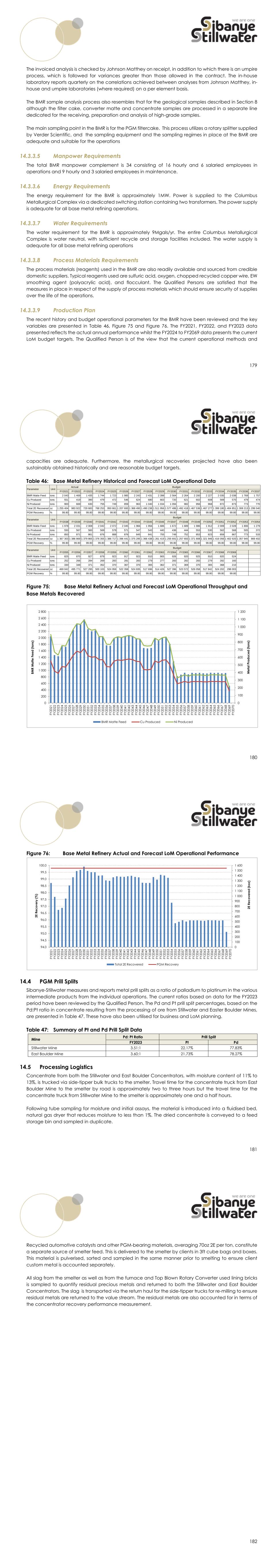 179 The invoiced analysis is checked by Johnson Matthey on receipt, in addition to which there is an umpire process, which is followed for variances greater than those allowed in the contract. The in-house laboratory reports quarterly on the correlations achieved between analyses from Johnson Matthey, in- house and umpire laboratories (where required) on a per element basis. The BMR sample analysis process also resembles that for the geological samples described in Section 8 although the filter cake, converter matte and concentrate samples are processed in a separate line dedicated for the receiving, preparation and analysis of high-grade samples. The main sampling point in the BMR is for the PGM filtercake. This process utilizes a rotary splitter supplied by Verder Scientific, and the sampling equipment and the sampling regimes in place at the BMR are adequate and suitable for the operations 14.3.3.5 Manpower Requirements The total BMR manpower complement is 34 consisting of 16 hourly and 6 salaried employees in operations and 9 hourly and 3 salaried employees in maintenance. 14.3.3.6 Energy Requirements The energy requirement for the BMR is approximately 1MW. Power is supplied to the Columbus Metallurgical Complex via a dedicated switching station containing two transformers. The power supply is adequate for all base metal refining operations. 14.3.3.7 Water Requirements The water requirement for the BMR is approximately 9Mgals/yr. The entire Columbus Metallurgical Complex is water neutral, with sufficient recycle and storage facilities included. The water supply is adequate for all base metal refining operations 14.3.3.8 Process Materials Requirements The process materials (reagents) used in the BMR are also readily available and sourced from credible domestic suppliers. Typical reagents used are sulfuric acid, oxygen, chopped recycled copper wire, EW smoothing agent (polyacrylic acid), and flocculant. The Qualified Persons are satisfied that the measures in place in respect of the supply of process materials which should ensure security of supplies over the life of the operations. 14.3.3.9 Production Plan The recent history and budget operational parameters for the BMR have been reviewed and the key variables are presented in Table 46, Figure 75 and Figure 76. The FY2021, FY2022, and FY2023 data presented reflects the actual annual performance whilst the FY2024 to FY2069 data presents the current LoM budget targets. The Qualified Person is of the view that the current operational methods and 180 capacities are adequate. Furthermore, the metallurgical recoveries projected have also been sustainably obtained historically and are reasonable budget targets. Table 46: Base Metal Refinery Historical and Forecast LoM Operational Data Figure 75: Base Metal Refinery Actual and Forecast LoM Operational Throughput and Base Metals Recovered FY2021 FY2022 FY2023 FY2024 FY2025 FY2026 FY2027 FY2028 FY2029 FY2030 FY2031 FY2032 FY2033 FY2034 FY2035 FY2036 FY2037 BMR Matte Feed tons 2 043 1 469 1 435 1 744 1 723 1 985 2 243 2 431 2 398 2 564 2 264 2 200 2 227 2 035 2 038 1 769 1 757 Cu Produced tons 551 419 390 479 472 546 624 680 663 720 621 602 608 569 570 479 474 Ni Produced tons 900 669 630 755 749 859 963 1 040 1 034 1 094 982 956 968 872 873 773 770 Total 2E Recovered oz 1 255 404 983 922 729 683 768 253 950 661 1 207 693 1 368 490 1 490 238 1 511 956 1 577 486 1 492 418 1 467 536 1 467 277 1 399 180 1 404 851 1 308 213 1 299 540 PGM Recovery % 99.80 99.80 99.80 99.80 99.80 99.80 99.80 99.80 99.80 99.80 99.80 99.80 99.80 99.80 99.80 99.80 99.80 FY2038 FY2039 FY2040 FY2041 FY2042 FY2043 FY2044 FY2045 FY2046 FY2047 FY2048 FY2049 FY2050 FY2051 FY2052 FY2053 FY2054 BMR Matte Feed tons 1 978 2 031 2 008 2 042 2 072 2 045 1 966 1 956 1 686 1 672 1 689 1 986 1 912 2 009 2 028 1 806 1 279 Cu Produced tons 550 567 560 569 578 571 547 543 440 436 444 553 530 562 568 505 372 Ni Produced tons 850 871 861 876 888 876 845 841 755 749 752 853 823 859 867 773 533 Total 2E Recovered oz 1 367 303 1 386 869 1 379 865 1 376 355 1 386 717 1 396 441 1 375 295 1 366 438 1 261 419 1 255 691 1 257 693 1 371 808 1 321 946 1 416 056 1 402 920 1 357 945 869 402 PGM Recovery % 99.80 99.80 99.80 99.80 99.80 99.80 99.80 99.80 99.80 99.80 99.80 99.80 99.80 99.80 99.80 99.80 99.80 FY2055 FY2056 FY2057 FY2058 FY2059 FY2060 FY2061 FY2062 FY2063 FY2064 FY2065 FY2066 FY2067 FY2068 FY2069 BMR Matte Feed tons 825 870 927 879 923 917 923 910 905 926 920 925 910 920 524 Cu Produced tons 252 266 284 269 283 281 283 279 277 283 282 283 279 282 160 Ni Produced tons 330 348 371 352 370 367 370 365 362 371 369 370 365 368 210 Total 2E Recovered oz 469 042 495 771 527 295 500 103 524 958 522 358 524 835 517 696 514 426 527 396 523 572 526 058 517 842 524 202 298 003 PGM Recovery % 99.80 99.80 99.80 99.80 99.80 99.80 99.80 99.80 99.80 99.80 99.80 99.80 99.80 99.80 99.80 Parameter Unit Parameter Unit Actual Parameter Unit Budget Budget Budget 0 100 200 300 400 500 600 700 800 900 1 000 1 100 1 200 0 200 400 600 800 1 000 1 200 1 400 1 600 1 800 2 000 2 200 2 400 2 600 2 800 FY 2 0 2 1 FY 2 0 2 2 FY 2 0 2 3 FY 2 0 2 4 FY 2 0 2 5 FY 2 0 2 6 FY 2 0 2 7 FY 2 0 2 8 FY 2 0 2 9 FY 2 0 3 0 FY 2 0 3 1 FY 2 0 3 2 FY 2 0 3 3 FY 2 0 3 4 FY 2 0 3 5 FY 2 0 3 6 FY 2 0 3 7 FY 2 0 3 8 FY 2 0 3 9 FY 2 0 4 0 FY 2 0 4 1 FY 2 0 4 2 FY 2 0 4 3 FY 2 0 4 4 FY 2 0 4 5 FY 2 0 4 6 FY 2 0 4 7 FY 2 0 4 8 FY 2 0 4 9 FY 2 0 5 0 FY 2 0 5 1 FY 2 0 5 2 FY 2 0 5 3 FY 2 0 5 4 FY 2 0 5 5 FY 2 0 5 6 FY 2 0 5 7 FY 2 0 5 8 FY 2 0 5 9 FY 2 0 6 0 FY 2 0 6 1 FY 2 0 6 2 FY 2 0 6 3 FY 2 0 6 4 FY 2 0 6 5 FY 2 0 6 6 FY 2 0 6 7 FY 2 0 6 8 FY 2 0 6 9 FY 2 0 7 0 M e ta l P ro d u c e d ( to n s) B M R M a tt e F e e d ( to n s) BMR Matte Feed Cu Produced Ni Produced 181 Figure 76: Base Metal Refinery Actual and Forecast LoM Operational Performance PGM Prill Splits Sibanye-Stillwater measures and reports metal prill splits as a ratio of palladium to platinum in the various interme