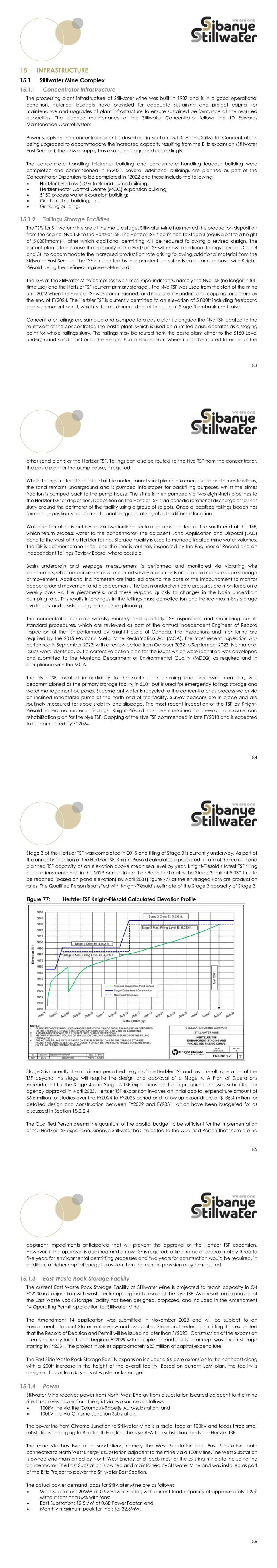 183 INFRASTRUCTURE Stillwater Mine Complex Concentrator Infrastructure The processing plant infrastructure at Stillwater Mine was built in 1987 and is in a good operational condition. Historical budgets have provided for adequate sustaining and project capital for maintenance and upgrades of plant infrastructure to ensure sustained performance at the required capacities. The planned maintenance of the Stillwater Concentrator follows the JD Edwards Maintenance Control system. Power supply to the concentrator plant is described in Section 15.1.4. As the Stillwater Concentrator is being upgraded to accommodate the increased capacity resulting from the Blitz expansion (Stillwater East Section), the power supply has also been upgraded accordingly. The concentrate handling thickener building and concentrate handling loadout building were completed and commissioned in FY2021. Several additional buildings are planned as part of the Concentrator Expansion to be completed in F2022 and these include the following:  Hertzler Overflow (O/F) tank and pump building;  Hertzler Motor Control Centre (MCC) expansion building;  5150 process water expansion building;  Ore handling building; and  Grinding building. Tailings Storage Facilities The TSFs for Stillwater Mine are at the mature stage. Stillwater Mine has moved the production deposition from the original Nye TSF to the Hertzler TSF. The Hertzler TSF is permitted to Stage 3 (equivalent to a height of 5 030ftmamsl), after which additional permitting will be required following a revised design. The current plan is to increase the capacity of the Hertzler TSF with new, additional tailings storage (Cells 4 and 5), to accommodate the increased production rate arising following additional material from the Stillwater East Section. The TSF is inspected by independent consultants on an annual basis, with Knight- Piésold being the defined Engineer-of-Record. The TSFs at the Stillwater Mine comprises two slimes impoundments, namely the Nye TSF (no longer in full- time use) and the Hertzler TSF (current primary storage). The Nye TSF was used from the start of the mine until 2002 when the Hertzler TSF was commissioned, and it is currently undergoing capping for closure by the end of FY2024. The Hertzler TSF is currently permitted to an elevation of 5 030ft including freeboard and supernatant pond, which is the maximum extent of the current Stage 3 embankment raise. Concentrator tailings are sampled and pumped to a paste plant alongside the Nye TSF located to the southwest of the concentrator. The paste plant, which is used on a limited basis, operates as a staging point for whole tailings slurry. The tailings may be routed from the paste plant either to the 5150 Level underground sand plant or to the Hertzler Pump House, from where it can be routed to either of the 184 other sand plants or the Hertzler TSF. Tailings can also be routed to the Nye TSF from the concentrator, the paste plant or the pump house, if required. Whole tailings material is classified at the underground sand plants into coarse sand and slimes fractions, the sand remains underground and is pumped into stopes for backfilling purposes, whilst the slimes fraction is pumped back to the pump house. The slime is then pumped via two eight-inch pipelines to the Hertzler TSF for deposition. Deposition on the Hertzler TSF is via periodic rotational discharge of tailings slurry around the perimeter of the facility using a group of spigots. Once a localised tailings beach has formed, deposition is transferred to another group of spigots at a different location. Water reclamation is achieved via two inclined reclaim pumps located at the south end of the TSF, which return process water to the concentrator. The adjacent Land Application and Disposal (LAD) pond to the west of the Hertzler Tailings Storage Facility is used to manage treated mine water volumes. The TSF is geomembrane lined, and the liner is routinely inspected by the Engineer of Record and an Independent Tailings Review Board, where possible. Basin underdrain and seepage measurement is performed and monitored via vibrating wire piezometers, whilst embankment crest-mounted survey monuments are used to measure slope slippage or movement. Additional inclinometers are installed around the base of the impoundment to monitor deeper ground movement and displacement. The basin underdrain pore pressures are monitored on a weekly basis via the piezometers, and these respond quickly to changes in the basin underdrain pumping rate. This results in changes in the tailings mass consolidation and hence maximises storage availability and assists in long-term closure planning. The concentrator performs weekly, monthly and quarterly TSF inspections and monitoring per its standard procedures, which are reviewed as part of the annual independent Engineer of Record inspection of the TSF performed by Knight-Piésold of Canada. The inspections and monitoring are required by the 2015 Montana Metal Mine Reclamation Act (MCA). The most recent inspection was performed in September 2023, with a review period from October 2022 to September 2023. No material issues were identified, but a corrective action plan for the issues which were identified was developed and submitted to the Montana Department of Environmental Quality (MDEQ) as required and in compliance with the MCA. The Nye TSF, located immediately to the south of the mining and processing complex, was decommissioned as the primary storage facility in 2001 but is used for emergency tailings storage and water management purposes. Supernatant water is recycled to the concentrator as process water via an inclined retractable pump at the north end of the facility. Survey beacons are in place and are routinely measured for slope stability and slippage. The most recent inspection of the TSF by Knight- Piésold raised no material findings. Knight-Piésold has been retained to develop a closure and rehabil