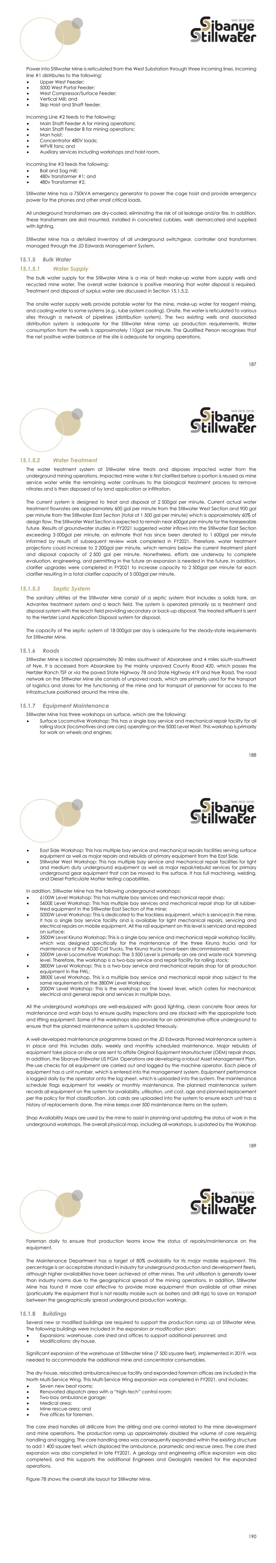 187 Power into Stillwater Mine is reticulated from the West Substation through three incoming lines. Incoming line #1 distributes to the following:  Upper West Feeder;  5000 West Portal Feeder;  West Compressor/Surface Feeder;  Vertical Mill; and  Skip Hoist and Shaft feeder. Incoming Line #2 feeds to the following:  Main Shaft Feeder A for mining operations;  Main Shaft Feeder B for mining operations;  Man hoist;  Concentrator 480V loads;  WFVR fans; and  Auxiliary services including workshops and hoist room. Incoming line #3 feeds the following:  Ball and Sag mill;  480v transformer #1; and  480v Transformer #2. Stillwater Mine has a 750kVA emergency generator to power the cage hoist and provide emergency power for the phones and other small critical loads. All underground transformers are dry-cooled, eliminating the risk of oil leakage and/or fire. In addition, these transformers are skid mounted, installed in concreted cubbies, well- demarcated and supplied with lighting. Stillwater Mine has a detailed inventory of all underground switchgear, controller and transformers managed through the JD Edwards Management System. Bulk Water 15.1.5.1 Water Supply The bulk water supply for the Stillwater Mine is a mix of fresh make-up water from supply wells and recycled mine water. The overall water balance is positive meaning that water disposal is required. Treatment and disposal of surplus water are discussed in Section 15.1.5.2. The onsite water supply wells provide potable water for the mine, make-up water for reagent mixing, and cooling water to some systems (e.g., lube system cooling). Onsite, the water is reticulated to various sites through a network of pipelines (distribution system). The two existing wells and associated distribution system is adequate for the Stillwater Mine ramp up production requirements. Water consumption from the wells is approximately 110gal per minute. The Qualified Person recognises that the net positive water balance at the site is adequate for ongoing operations. 188 15.1.5.2 Water Treatment The water treatment system at Stillwater Mine treats and disposes impacted water from the underground mining operations. Impacted mine water is first clarified before a portion is reused as mine service water while the remaining water continues to the biological treatment process to remove nitrates and is then disposed of by land application or infiltration. The current system is designed to treat and disposal of 2 500gal per minute. Current actual water treatment flowrates are approximately 600 gal per minute from the Stillwater West Section and 900 gal per minute from the Stillwater East Section (total of 1 500 gal per minute) which is approximately 60% of design flow. The Stillwater West Section is expected to remain near 600gal per minute for the foreseeable future. Results of groundwater studies in FY2021 suggested water inflows into the Stillwater East Section exceeding 3 000gal per minute, an estimate that has since been derated to 1 600gal per minute informed by results of subsequent review work completed in FY2021. Therefore, water treatment projections could increase to 2 200gal per minute, which remains below the current treatment plant and disposal capacity of 2 500 gal per minute. Nonetheless, efforts are underway to complete evaluation, engineering, and permitting in the future an expansion is needed in the future. In addition, clarifier upgrades were completed in FY2021 to increase capacity to 2 500gal per minute for each clarifier resulting in a total clarifier capacity of 5 000gal per minute. 15.1.5.3 Septic System The sanitary utilities at the Stillwater Mine consist of a septic system that includes a solids tank, an Advantex treatment system and a leach field. The system is operated primarily as a treatment and disposal system with the leach field providing secondary or back-up disposal. The treated effluent is sent to the Hertzler Land Application Disposal system for disposal. The capacity of the septic system of 18 000gal per day is adequate for the steady-state requirements for Stillwater Mine. Roads Stillwater Mine is located approximately 30 miles southwest of Absarokee and 4 miles south-southwest of Nye. It is accessed from Absarokee by the mainly unpaved County Road 420, which passes the Hertzler Ranch TSF or via the paved State Highway 78 and State Highway 419 and Nye Road. The road network on the Stillwater Mine site consists of unpaved roads, which are primarily used for the transport of logistics and stores for the functioning of the mine and for transport of personnel for access to the infrastructure positioned around the mine site. Equipment Maintenance Stillwater Mine has three workshops on surface, which are the following:  Surface Locomotive Workshop: This has a single bay service and mechanical repair facility for all rolling stock (locomotives and ore cars) operating on the 5000 Level West. This workshop is primarily for work on wheels and engines; 189  East Side Workshop: This has multiple bay service and mechanical repairs facilities serving surface equipment as well as major repairs and rebuilds of primary equipment from the East Side.  Stillwater West Workshop: This has multiple bay service and mechanical repair facilities for light and medium duty underground equipment as well as major repair/rebuild services for primary underground gear equipment that can be moved to the surface. It has full machining, welding, and Diesel Particulate Matter testing capabilities. In addition, Stillwater Mine has the following underground workshops:  6100W Level Workshop: This has multiple bay services and mechanical repair shop;  5600E Level Workshop: This has multiple bay services and mechanical repair shop for all rubber- tired equipment in the Stillwater East Section of the mine;  5000W Level Workshop: This is dedicated to the trackless equipment, which is serviced in the mine. It has