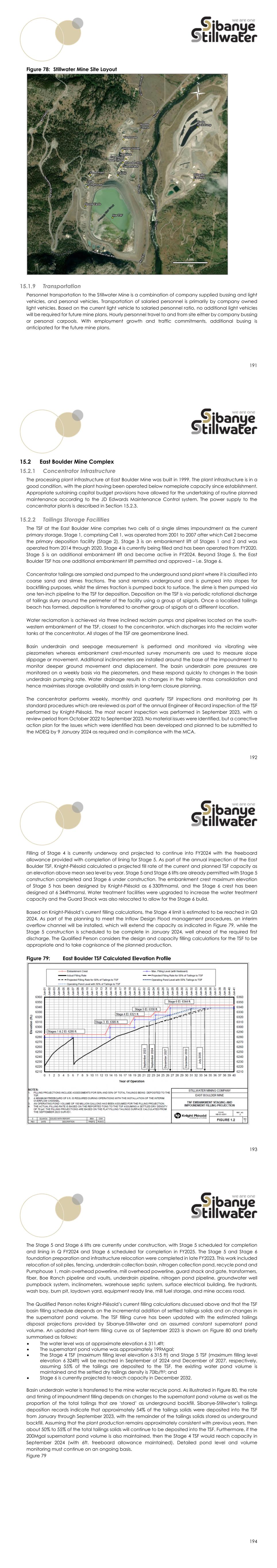 191 Figure 78: Stillwater Mine Site Layout Transportation Personnel transportation to the Stillwater Mine is a combination of company supplied bussing and light vehicles, and personal vehicles. Transportation of salaried personnel is primarily by company owned light vehicles. Based on the current light vehicle to salaried personnel ratio, no additional light vehicles will be required for future mine plans. Hourly personnel travel to and from site either by company bussing or personal carpools. With employment growth and traffic commitments, additional busing is anticipated for the future mine plans. 192 East Boulder Mine Complex Concentrator Infrastructure The processing plant infrastructure at East Boulder Mine was built in 1999. The plant infrastructure is in a good condition, with the plant having been operated below nameplate capacity since establishment. Appropriate sustaining capital budget provisions have allowed for the undertaking of routine planned maintenance according to the JD Edwards Maintenance Control system. The power supply to the concentrator plants is described in Section 15.2.3. Tailings Storage Facilities The TSF at the East Boulder Mine comprises two cells of a single slimes impoundment as the current primary storage. Stage 1, comprising Cell 1, was operated from 2001 to 2007 after which Cell 2 became the primary deposition facility (Stage 2). Stage 3 is an embankment lift of Stages 1 and 2 and was operated from 2014 through 2020. Stage 4 is currently being filled and has been operated from FY2020. Stage 5 is an additional embankment lift and become active in FY2024. Beyond Stage 5, the East Boulder TSF has one additional embankment lift permitted and approved – i.e. Stage 6. Concentrator tailings are sampled and pumped to the underground sand plant where it is classified into coarse sand and slimes fractions. The sand remains underground and is pumped into stopes for backfilling purposes, whilst the slimes fraction is pumped back to surface. The slime is then pumped via one ten-inch pipeline to the TSF for deposition. Deposition on the TSF is via periodic rotational discharge of tailings slurry around the perimeter of the facility using a group of spigots. Once a localised tailings beach has formed, deposition is transferred to another group of spigots at a different location. Water reclamation is achieved via three inclined reclaim pumps and pipelines located on the south- western embankment of the TSF, closest to the concentrator, which discharges into the reclaim water tanks at the concentrator. All stages of the TSF are geomembrane lined. Basin underdrain and seepage measurement is performed and monitored via vibrating wire piezometers whereas embankment crest-mounted survey monuments are used to measure slope slippage or movement. Additional inclinometers are installed around the base of the impoundment to monitor deeper ground movement and displacement. The basin underdrain pore pressures are monitored on a weekly basis via the piezometers, and these respond quickly to changes in the basin underdrain pumping rate. Water drainage results in changes in the tailings mass consolidation and hence maximises storage availability and assists in long-term closure planning. The concentrator performs weekly, monthly and quarterly TSF inspections and monitoring per its standard procedures which are reviewed as part of the annual Engineer of Record inspection of the TSF performed by Knight-Piésold. The most recent inspection was performed in September 2023, with a review period from October 2022 to September 2023. No material issues were identified, but a corrective action plan for the issues which were identified has been developed and planned to be submitted to the MDEQ by 9 January 2024 as required and in compliance with the MCA. 193 Filling of Stage 4 is currently underway and projected to continue into FY2024 with the freeboard allowance provided with completion of lining for Stage 5. As part of the annual inspection of the East Boulder TSF, Knight-Piésold calculated a projected fill rate of the current and planned TSF capacity as an elevation above mean sea level by year. Stage 5 and Stage 6 lifts are already permitted with Stage 5 construction completed and Stage 6 under construction. The embankment crest maximum elevation of Stage 5 has been designed by Knight-Piésold as 6 330ftmamsl, and the Stage 6 crest has been designed at 6 344ftmamsl. Water treatment facilities were upgraded to increase the water treatment capacity and the Guard Shack was also relocated to allow for the Stage 6 build. Based on Knight-Piésold’s current filling calculations, the Stage 4 limit is estimated to be reached in Q3 2024. As part of the planning to meet the Inflow Design Flood management procedures, an interim overflow channel will be installed, which will extend the capacity as indicated in Figure 79, while the Stage 5 construction is scheduled to be complete in January 2024, well ahead of the required first discharge. The Qualified Person considers the design and capacity filling calculations for the TSF to be appropriate and to take cognisance of the planned production. Figure 79: East Boulder TSF Calculated Elevation Profile 194 The Stage 5 and Stage 6 lifts are currently under construction, with Stage 5 scheduled for completion and lining in Q FY2024 and Stage 6 scheduled for completion in FY2025. The Stage 5 and Stage 6 foundation preparation and infrastructure relocation were completed in late FY2023. This work included relocation of soil piles, fencing, underdrain collection basin, nitrogen collection pond, recycle pond and Pumphouse 1, main overhead powerline, mill overhead powerline, guard shack and gate, transformers, fiber, Boe Ranch pipeline and vaults, underdrain pipeline, nitrogen pond pipeline, groundwater well pumpback system, inclinometers, warehouse septic system, surface electrical building, fire hydrants, wash bay, burn pit, laydown yard, equipment ready 