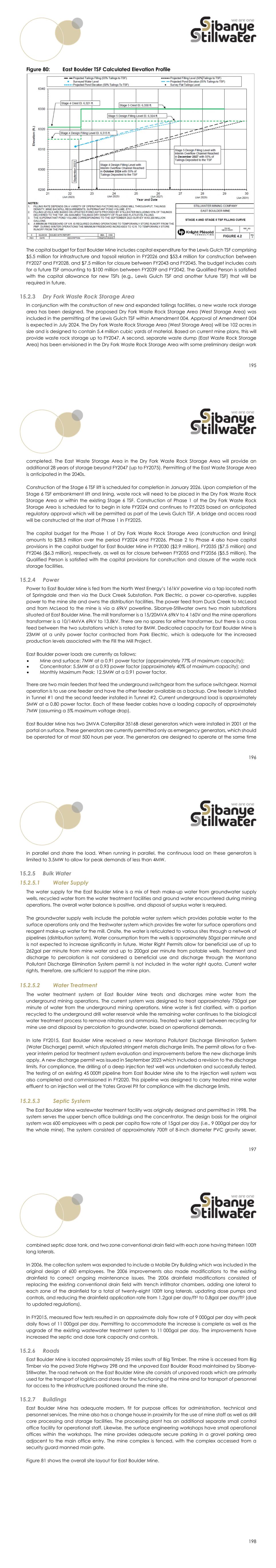 195 Figure 80: East Boulder TSF Calculated Elevation Profile The capital budget for East Boulder Mine includes capital expenditure for the Lewis Gulch TSF comprising $5.5 million for infrastructure and topsoil relation in FY2026 and $53.4 million for construction between FY2027 and FY2028, and $7.5 million for closure between FY2043 and FY2045. The budget includes costs for a future TSF amounting to $100 million between FY2039 and FY2042. The Qualified Person is satisfied with the capital allowance for new TSFs (e.g., Lewis Gulch TSF and another future TSF) that will be required in future. Dry Fork Waste Rock Storage Area In conjunction with the construction of new and expanded tailings facilities, a new waste rock storage area has been designed. The proposed Dry Fork Waste Rock Storage Area (West Storage Area) was included in the permitting of the Lewis Gulch TSF within Amendment 004. Approval of Amendment 004 is expected in July 2024. The Dry Fork Waste Rock Storage Area (West Storage Area) will be 102 acres in size and is designed to contain 5.4 million cubic yards of material. Based on current mine plans, this will provide waste rock storage up to FY2047. A second, separate waste dump (East Waste Rock Storage Area) has been envisioned in the Dry Fork Waste Rock Storage Area with some preliminary design work 196 completed. The East Waste Storage Area in the Dry Fork Waste Rock Storage Area will provide an additional 28 years of storage beyond FY2047 (up to FY2075). Permitting of the East Waste Storage Area is anticipated in the 2040s. Construction of the Stage 6 TSF lift is scheduled for completion in January 2026. Upon completion of the Stage 6 TSF embankment lift and lining, waste rock will need to be placed in the Dry Fork Waste Rock Storage Area or within the existing Stage 6 TSF. Construction of Phase 1 of the Dry Fork Waste Rock Storage Area is scheduled for to begin in late FY2024 and continues to FY2025 based on anticipated regulatory approval which will be permitted as part of the Lewis Gulch TSF. A bridge and access road will be constructed at the start of Phase 1 in FY2025. The capital budget for the Phase 1 of Dry Fork Waste Rock Storage Area (construction and lining) amounts to $28.5 million over the period FY2024 and FY2026. Phase 2 to Phase 4 also have capital provisions in the capital budget for East Boulder Mine in FY2030 ($2.9 million), FY2035 ($7.5 million) and FY2046 ($6.3 million), respectively, as well as for closure between FY2055 and FY2056 ($5.5 million). The Qualified Person is satisfied with the capital provisions for construction and closure of the waste rock storage facilities. Power Power to East Boulder Mine is fed from the North West Energy’s 161kV powerline via a tap located north of Springdale and then via the Duck Creek Substation. Park Electric, a power co-operative, supplies power to the mine site and owns the distribution facilities. The power feed from Duck Creek to McLeod and from McLeod to the mine is via a 69kV powerline. Sibanye-Stillwater owns two main substations situated at East Boulder Mine. The mill transformer is a 15/20MVA 69kV to 4 160V and the mine operations transformer is a 10/14MVA 69kV to 13.8kV. There are no spares for either transformer, but there is a cross feed between the two substations which is rated for 8MW. Dedicated capacity for East Boulder Mine is 23MW at a unity power factor contracted from Park Electric, which is adequate for the increased production levels associated with the Fill the Mill Project. East Boulder power loads are currently as follows:  Mine and surface: 7MW at a 0.91 power factor (approximately 77% of maximum capacity);  Concentrator: 5.5MW at a 0.93 power factor (approximately 40% of maximum capacity); and  Monthly Maximum Peak: 12.5MW at a 0.91 power factor. There are two main feeders that feed the underground switchgear from the surface switchgear. Normal operation is to use one feeder and have the other feeder available as a backup. One feeder is installed in Tunnel #1 and the second feeder installed in Tunnel #2. Current underground load is approximately 5MW at a 0.80 power factor. Each of these feeder cables have a loading capacity of approximately 7MW (assuming a 5% maximum voltage drop). East Boulder Mine has two 2MVA Caterpillar 3516B diesel generators which were installed in 2001 at the portal on surface. These generators are currently permitted only as emergency generators, which should be operated for at most 500 hours per year. The generators are designed to operate at the same time 197 in parallel and share the load. When running in parallel, the continuous load on these generators is limited to 3.5MW to allow for peak demands of less than 4MW. Bulk Water 15.2.5.1 Water Supply The water supply for the East Boulder Mine is a mix of fresh make-up water from groundwater supply wells, recycled water from the water treatment facilities and ground water encountered during mining operations. The overall water balance is positive, and disposal of surplus water is required. The groundwater supply wells include the potable water system which provides potable water to the surface operations only and the freshwater system which provides fire water for surface operations and reagent make-up water for the mill. Onsite, the water is reticulated to various sites through a network of pipelines (distribution system). Water consumption from the wells is approximately 50gal per minute and is not expected to increase significantly in future. Water Right Permits allow for beneficial use of up to 262gal per minute from mine water and up to 200gal per minute from potable wells. Treatment and discharge to percolation is not considered a beneficial use and discharge through the Montana Pollutant Discharge Elimination System permit is not included in the water right quota. Current water rights, therefore, are sufficient to support the mine plan. 15.2.5.2 Water Treatment The water treatment system at Eas