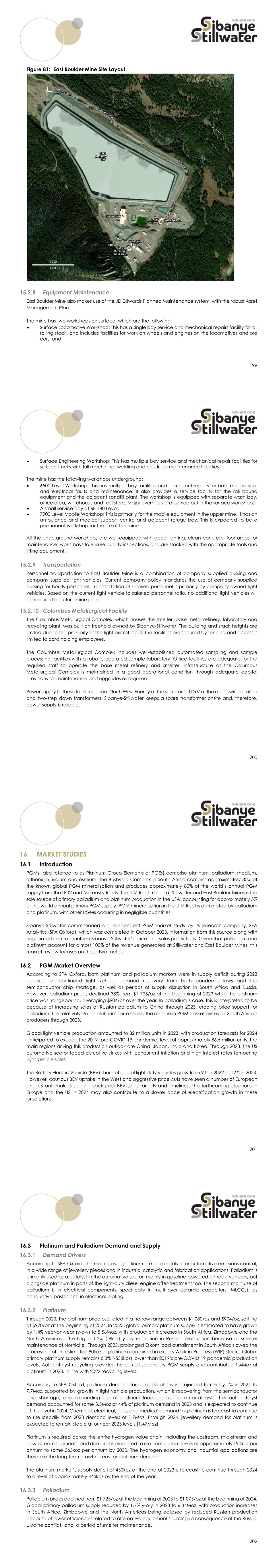 199 Figure 81: East Boulder Mine Site Layout Equipment Maintenance East Boulder Mine also makes use of the JD Edwards Planned Maintenance system, with the robust Asset Management Plan. The mine has two workshops on surface, which are the following:  Surface Locomotive Workshop: This has a single bay service and mechanical repairs facility for all rolling stock, and includes facilities for work on wheels and engines on the locomotives and ore cars; and 200  Surface Engineering Workshop: This has multiple bay service and mechanical repair facilities for surface trucks with full machining, welding and electrical maintenance facilities. The mine has the following workshops underground:  6500 Level Workshop: This has multiple-bay facilities and carries out repairs for both mechanical and electrical faults and maintenance. It also provides a service facility for the rail bound equipment and the adjacent sandfill plant. The workshop is equipped with separate wash bay, office area, warehouse and fuel store. Major overhauls are carried out in the surface workshops;  A small service bay at 68 780 Level.  7900 Level Mobile Workshop: This is primarily for the mobile equipment in the upper mine. It has an ambulance and medical support centre and adjacent refuge bay. This is expected to be a permanent workshop for the life of the mine. All the underground workshops are well-equipped with good lighting, clean concrete floor areas for maintenance, wash bays to ensure quality inspections, and are stocked with the appropriate tools and lifting equipment. Transportation Personnel transportation to East Boulder Mine is a combination of company supplied bussing and company supplied light vehicles. Current company policy mandates the use of company supplied bussing for hourly personnel. Transportation of salaried personnel is primarily by company owned light vehicles. Based on the current light vehicle to salaried personnel ratio, no additional light vehicles will be required for future mine plans. Columbus Metallurgical Facility The Columbus Metallurgical Complex, which houses the smelter, base metal refinery, laboratory and recycling plant, was built on freehold owned by Sibanye-Stillwater. The building and stack heights are limited due to the proximity of the light aircraft field. The facilities are secured by fencing and access is limited to card holding employees. The Columbus Metallurgical Complex includes well-established automated sampling and sample processing facilities with a robotic operated sample laboratory. Office facilities are adequate for the required staff to operate the base metal refinery and smelter. Infrastructure at the Columbus Metallurgical Complex is maintained in a good operational condition through adequate capital provisions for maintenance and upgrades as required. Power supply to these facilities is from North West Energy at the standard 100kV at the main switch station and two-step down transformers. Sibanye-Stillwater keeps a spare transformer onsite and, therefore, power supply is reliable. 201 MARKET STUDIES Introduction PGMs (also referred to as Platinum Group Elements or PGEs) comprise platinum, palladium, rhodium, ruthenium, iridium and osmium. The Bushveld Complex in South Africa contains approximately 80% of the known global PGM mineralisation and produces approximately 80% of the world’s annual PGM supply from the UG2 and Merensky Reefs. The J-M Reef mined at Stillwater and East Boulder Mines is the sole source of primary palladium and platinum production in the USA, accounting for approximately 5% of the world annual primary PGM supply. PGM mineralisation in the J-M Reef is dominated by palladium and platinum, with other PGMs occurring in negligible quantities. Sibanye-Stillwater commissioned an independent PGM market study by its research company, SFA Analytics (SFA Oxford), which was completed in October 2023. Information from this source along with negotiated contracts inform Sibanye-Stillwater’s price and sales predictions. Given that palladium and platinum account for almost 100% of the revenue generated at Stillwater and East Boulder Mines, this market review focuses on these two metals. PGM Market Overview According to SFA Oxford, both platinum and palladium markets were in supply deficit during 2023 because of continued light vehicle demand recovery from both pandemic lows and the semiconductor chip shortage, as well as periods of supply disruption in South Africa and Russia. However, palladium prices declined 38% from $1 725/oz at the beginning of 2023 while the platinum price was rangebound, averaging $904/oz over the year. In palladium’s case, this is interpreted to be because of increasing sales of Russian palladium to China through 2023, eroding price support for palladium. The relatively stable platinum price belied the decline in PGM basket prices for South African producers through 2023. Global light vehicle production amounted to 82 million units in 2023, with production forecasts for 2024 anticipated to exceed the 2019 (pre-COVID-19 pandemic) level of approximately 86.5 million units. The main regions driving this production outlook are China, Japan, India and Korea. Through 2023, the US automotive sector faced disruptive strikes with concurrent inflation and high interest rates tempering light vehicle sales. The Battery Electric Vehicle (BEV) share of global light duty vehicles grew from 9% in 2022 to 12% in 2023. However, cautious BEV uptake in the West and aggressive price cuts have seen a number of European and US automakers scaling back prior BEV sales targets and timelines. The forthcoming elections in Europe and the US in 2024 may also contribute to a slower pace of electrification growth in these jurisdictions. 202 Platinum and Palladium Demand and Supply Demand Drivers According to SFA Oxford, the main uses of platinum are as a catalyst for automotive emissions control, in a wide range of jewellery pieces and in industr