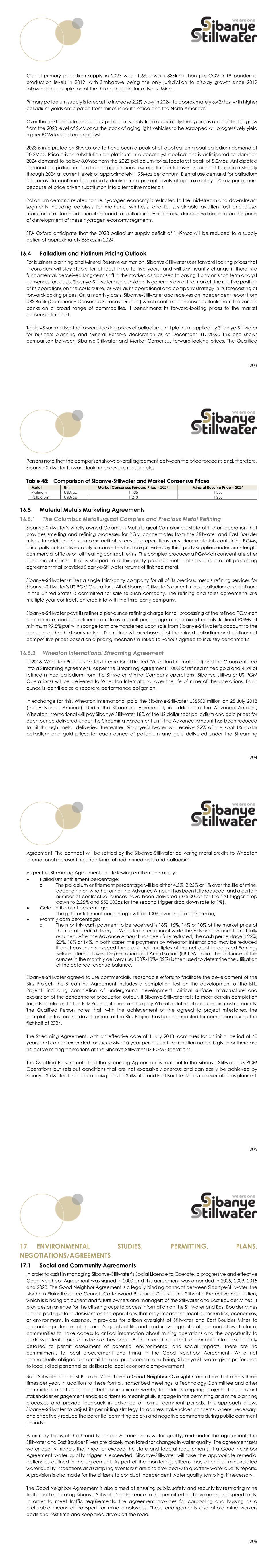 203 Global primary palladium supply in 2023 was 11.6% lower (-836koz) than pre-COVID 19 pandemic production levels in 2019, with Zimbabwe being the only jurisdiction to display growth since 2019 following the completion of the third concentrator at Ngezi Mine. Primary palladium supply is forecast to increase 2.2% y-o-y in 2024, to approximately 6.42Moz, with higher palladium yields anticipated from mines in South Africa and the North Americas. Over the next decade, secondary palladium supply from autocatalyst recycling is anticipated to grow from the 2023 level of 2.4Moz as the stock of aging light vehicles to be scrapped will progressively yield higher PGM loaded autocatalyst. 2023 is interpreted by SFA Oxford to have been a peak of all-application global palladium demand at 10.2Moz. Price-driven substitution for platinum in autocatalyst applications is anticipated to dampen 2024 demand to below 8.0Moz from the 2023 palladium-for-autocatalyst peak of 8.2Moz. Anticipated demand for palladium in all other applications, except for dental uses, is forecast to remain steady through 2024 at current levels of approximately 1.95Moz per annum. Dental use demand for palladium is forecast to continue to gradually decline from present levels of approximately 170koz per annum because of price driven substitution into alternative materials. Palladium demand related to the hydrogen economy is restricted to the mid-stream and downstream segments including catalysts for methanol synthesis, and for sustainable aviation fuel and diesel manufacture. Some additional demand for palladium over the next decade will depend on the pace of development of these hydrogen economy segments. SFA Oxford anticipate that the 2023 palladium supply deficit of 1.49Moz will be reduced to a supply deficit of approximately 855koz in 2024. Palladium and Platinum Pricing Outlook For business planning and Mineral Reserve estimation, Sibanye-Stillwater uses forward looking prices that it considers will stay stable for at least three to five years, and will significantly change if there is a fundamental, perceived long-term shift in the market, as opposed to basing it only on short term analyst consensus forecasts. Sibanye-Stillwater also considers its general view of the market, the relative position of its operations on the costs curve, as well as its operational and company strategy in its forecasting of forward-looking prices. On a monthly basis, Sibanye-Stillwater also receives an independent report from UBS Bank (Commodity Consensus Forecasts Report) which contains consensus outlooks from the various banks on a broad range of commodities. It benchmarks its forward-looking prices to the market consensus forecast. Table 48 summarises the forward-looking prices of palladium and platinum applied by Sibanye-Stillwater for business planning and Mineral Reserve declaration as at December 31, 2023. This also shows comparison between Sibanye-Stillwater and Market Consensus forward-looking prices. The Qualified 204 Persons note that the comparison shows overall agreement between the price forecasts and, therefore, Sibanye-Stillwater forward-looking prices are reasonable. Table 48: Comparison of Sibanye-Stillwater and Market Consensus Prices Metal Unit Market Consensus Forward Price – 2024 Mineral Reserve Price – 2024 Platinum USD/oz 1 135 1 250 Palladium USD/oz 1 213 1 250 Material Metals Marketing Agreements The Columbus Metallurgical Complex and Precious Metal Refining Sibanye-Stillwater’s wholly owned Columbus Metallurgical Complex is a state-of-the-art operation that provides smelting and refining processes for PGM concentrates from the Stillwater and East Boulder mines. In addition, the complex facilitates recycling operations for various materials containing PGMs, principally automotive catalytic converters that are provided by third-party suppliers under arms-length commercial offtake or toll treating contract terms. The complex produces a PGM-rich concentrate after base metal refining that is shipped to a third-party precious metal refinery under a toll processing agreement that provides Sibanye-Stillwater returns of finished metal. Sibanye-Stillwater utilises a single third-party company for all of its precious metals refining services for Sibanye-Stillwater’s US PGM Operations. All of Sibanye-Stillwater’s current mined palladium and platinum in the United States is committed for sale to such company. The refining and sales agreements are multiple year contracts entered into with the third-party company. Sibanye-Stillwater pays its refiner a per-ounce refining charge for toll processing of the refined PGM-rich concentrate, and the refiner also retains a small percentage of contained metals. Refined PGMs of minimum 99.5% purity in sponge form are transferred upon sale from Sibanye-Stillwater’s account to the account of the third-party refiner. The refiner will purchase all of the mined palladium and platinum at competitive prices based on a pricing mechanism linked to various agreed to industry benchmarks. Wheaton International Streaming Agreement In 2018, Wheaton Precious Metals International Limited (Wheaton International) and the Group entered into a Streaming Agreement. As per the Streaming Agreement, 100% of refined mined gold and 4.5% of refined mined palladium from the Stillwater Mining Company operations (Sibanye-Stillwater US PGM Operations) will be delivered to Wheaton International over the life of mine of the operations. Each ounce is identified as a separate performance obligation. In exchange for this, Wheaton International paid the Sibanye-Stillwater US$500 million on 25 July 2018 (the Advance Amount). Under the Streaming Agreement, in addition to the Advance Amount, Wheaton International will pay Sibanye-Stillwater 18% of the US dollar spot palladium and gold prices for each ounce delivered under the Streaming Agreement until the Advance Amount has been reduced to nil through metal deliveries. Therea