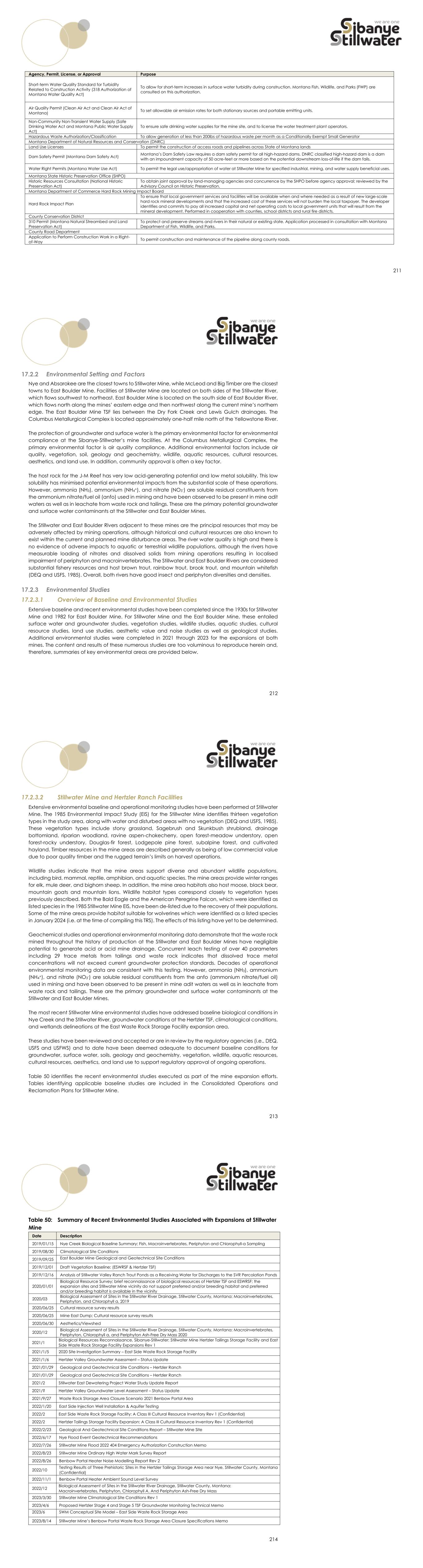 211 Agency, Permit, License, or Approval Purpose Short-term Water Quality Standard for Turbidity Related to Construction Activity (318 Authorization of Montana Water Quality Act) To allow for short-term increases in surface water turbidity during construction. Montana Fish, Wildlife, and Parks (FWP) are consulted on this authorization. Air Quality Permit (Clean Air Act and Clean Air Act of Montana) To set allowable air emission rates for both stationary sources and portable emitting units. Non-Community Non-Transient Water Supply (Safe Drinking Water Act and Montana Public Water Supply Act) To ensure safe drinking water supplies for the mine site, and to license the water treatment plant operators. Hazardous Waste Authorization/Classification To allow generation of less than 200lbs of hazardous waste per month as a Conditionally Exempt Small Generator Montana Department of Natural Resources and Conservation (DNRC) Land Use Licenses To permit the construction of access roads and pipelines across State of Montana lands Dam Safety Permit (Montana Dam Safety Act) Montana’s Dam Safety Law requires a dam safety permit for all high-hazard dams. DNRC classified high-hazard dam is a dam with an impoundment capacity of 50 acre-feet or more based on the potential downstream loss-of-life if the dam fails. Water Right Permits (Montana Water Use Act) To permit the legal use/appropriation of water at Stillwater Mine for specified industrial, mining, and water supply beneficial uses. Montana State Historic Preservation Office (SHPO) Historic Resources Consultation (National Historic Preservation Act) To obtain joint approval by land-managing agencies and concurrence by the SHPO before agency approval; reviewed by the Advisory Council on Historic Preservation. Montana Department of Commerce Hard Rock Mining Impact Board Hard Rock Impact Plan To ensure that local government services and facilities will be available when and where needed as a result of new large-scale hard rock mineral developments and that the increased cost of these services will not burden the local taxpayer. The developer identifies and commits to pay all increased capital and net operating costs to local government units that will result from the mineral development. Performed in cooperation with counties, school districts and rural fire districts. County Conservation District 310 Permit (Montana Natural Streambed and Land Preservation Act) To protect and preserve streams and rivers in their natural or existing state. Application processed in consultation with Montana Department of Fish, Wildlife, and Parks. County Road Department Application to Perform Construction Work in a Right- of-Way To permit construction and maintenance of the pipeline along county roads. 212 Environmental Setting and Factors Nye and Absarokee are the closest towns to Stillwater Mine, while McLeod and Big Timber are the closest towns to East Boulder Mine. Facilities at Stillwater Mine are located on both sides of the Stillwater River, which flows southwest to northeast. East Boulder Mine is located on the south side of East Boulder River, which flows north along the mines’ eastern edge and then northwest along the current mine’s northern edge. The East Boulder Mine TSF lies between the Dry Fork Creek and Lewis Gulch drainages. The Columbus Metallurgical Complex is located approximately one-half mile north of the Yellowstone River. The protection of groundwater and surface water is the primary environmental factor for environmental compliance at the Sibanye-Stillwater’s mine facilities. At the Columbus Metallurgical Complex, the primary environmental factor is air quality compliance. Additional environmental factors include air quality, vegetation, soil, geology and geochemistry, wildlife, aquatic resources, cultural resources, aesthetics, and land use. In addition, community approval is often a key factor. The host rock for the J-M Reef has very low acid-generating potential and low metal solubility. This low solubility has minimised potential environmental impacts from the substantial scale of these operations. However, ammonia (NH3), ammonium (NH4+), and nitrate (NO3-) are soluble residual constituents from the ammonium nitrate/fuel oil (anfo) used in mining and have been observed to be present in mine adit waters as well as in leachate from waste rock and tailings. These are the primary potential groundwater and surface water contaminants at the Stillwater and East Boulder Mines. The Stillwater and East Boulder Rivers adjacent to these mines are the principal resources that may be adversely affected by mining operations, although historical and cultural resources are also known to exist within the current and planned mine disturbance areas. The river water quality is high and there is no evidence of adverse impacts to aquatic or terrestrial wildlife populations, although the rivers have measurable loading of nitrates and dissolved solids from mining operations resulting in localised impairment of periphyton and macroinvertebrates. The Stillwater and East Boulder Rivers are considered substantial fishery resources and host brown trout, rainbow trout, brook trout, and mountain whitefish (DEQ and USFS, 1985). Overall, both rivers have good insect and periphyton diversities and densities. Environmental Studies 17.2.3.1 Overview of Baseline and Environmental Studies Extensive baseline and recent environmental studies have been completed since the 1930s for Stillwater Mine and 1982 for East Boulder Mine. For Stillwater Mine and the East Boulder Mine, these entailed surface water and groundwater studies, vegetation studies, wildlife studies, aquatic studies, cultural resource studies, land use studies, aesthetic value and noise studies as well as geological studies. Additional environmental studies were completed in 2021 through 2023 for the expansions at both mines. The content and results of these numerous studies are too voluminous to reproduce herein a