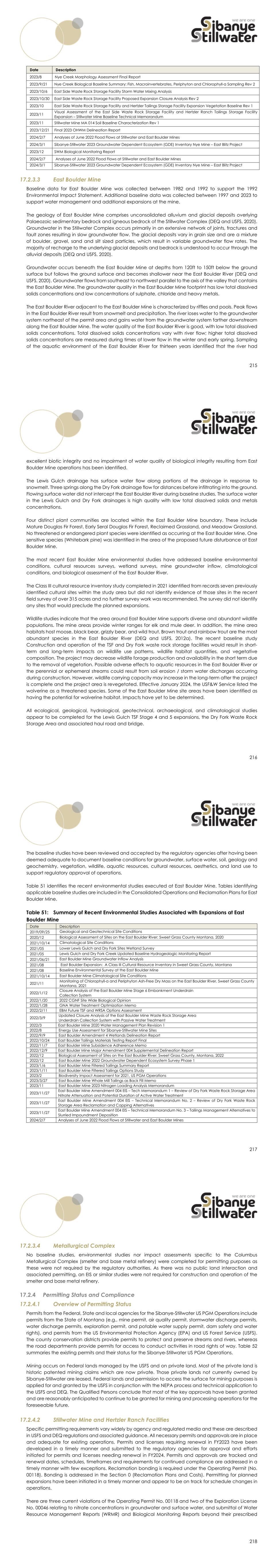 215 Date Description 2023/8 Nye Creek Morphology Assessment Final Report 2023/9/21 Nye Creek Biological Baseline Summary: Fish, Macroinvertebrates, Periphyton and Chlorophyll-a Sampling Rev 2 2023/10/6 East Side Waste Rock Storage Facility Storm Water Mixing Analysis 2023/10/30 East Side Waste Rock Storage Facility Proposed Expansion Closure Analysis Rev 2 2023/10 East Side Waste Rock Storage Facility and Hertzler Tailings Storage Facility Expansion Vegetation Baseline Rev 1 2023/11 Visual Assessment of the East Side Waste Rock Storage Facility and Hertzler Ranch Tailings Storage Facility Expansion – Stillwater Mine Baseline Technical Memorandum 2023/11 Stillwater Mine MA 014 Soil Baseline Characterization Rev 1 2023/12/21 Final 2023 OHWM Delineation Report 2024/2/7 Analyses of June 2022 Flood Flows at Stillwater and East Boulder Mines 2024/3/1 Sibanye-Stillwater 2023 Groundwater Dependent Ecosystem (GDE) Inventory Nye Mine – East Blitz Project 2023/12 SWM Biological Monitoring Report 2024/2/7 Analyses of June 2022 Flood Flows at Stillwater and East Boulder Mines 2024/3/1 Sibanye-Stillwater 2023 Groundwater Dependent Ecosystem (GDE) Inventory Nye Mine – East Blitz Project 17.2.3.3 East Boulder Mine Baseline data for East Boulder Mine was collected between 1982 and 1992 to support the 1992 Environmental Impact Statement. Additional baseline data was collected between 1997 and 2023 to support water management and additional expansions at the mine. The geology of East Boulder Mine comprises unconsolidated alluvium and glacial deposits overlying Palaeozoic sedimentary bedrock and igneous bedrock of the Stillwater Complex (DEQ and USFS, 2020). Groundwater in the Stillwater Complex occurs primarily in an extensive network of joints, fractures and fault zones resulting in slow groundwater flow. The glacial deposits vary in grain size and are a mixture of boulder, gravel, sand and silt sized particles, which result in variable groundwater flow rates. The majority of recharge to the underlying glacial deposits and bedrock is understood to occur through the alluvial deposits (DEQ and USFS, 2020). Groundwater occurs beneath the East Boulder Mine at depths from 120ft to 150ft below the ground surface but follows the ground surface and becomes shallower near the East Boulder River (DEQ and USFS, 2020). Groundwater flows from southeast to northwest parallel to the axis of the valley that contains the East Boulder Mine. The groundwater quality in the East Boulder Mine footprint has low total dissolved solids concentrations and low concentrations of sulphate, chloride and heavy metals. The East Boulder River adjacent to the East Boulder Mine is characterized by riffles and pools. Peak flows in the East Boulder River result from snowmelt and precipitation. The river loses water to the groundwater system northeast of the permit area and gains water from the groundwater system farther downstream along the East Boulder Mine. The water quality of the East Boulder River is good, with low total dissolved solids concentrations. Total dissolved solids concentrations vary with river flow; higher total dissolved solids concentrations are measured during times of lower flow in the winter and early spring. Sampling of the aquatic environment of the East Boulder River for thirteen years identified that the river had 216 excellent biotic integrity and no impairment of water quality of biological integrity resulting from East Boulder Mine operations has been identified. The Lewis Gulch drainage has surface water flow along portions of the drainage in response to snowmelt. Three springs along the Dry Fork drainage flow for distances before infiltrating into the ground. Flowing surface water did not intercept the East Boulder River during baseline studies. The surface water in the Lewis Gulch and Dry Fork drainages is high quality with low total dissolved solids and metals concentrations. Four distinct plant communities are located within the East Boulder Mine boundary. These include Mature Douglas Fir Forest, Early Seral Douglas Fir Forest, Reclaimed Grassland, and Meadow Grassland. No threatened or endangered plant species were identified as occurring at the East Boulder Mine. One sensitive species (Whitebark pine) was identified in the area of the proposed future disturbance at East Boulder Mine. The most recent East Boulder Mine environmental studies have addressed baseline environmental conditions, cultural resources surveys, wetland surveys, mine groundwater inflow, climatological conditions, and biological assessment of the East Boulder River. The Class III cultural resource inventory study completed in 2021 identified from records seven previously identified cultural sites within the study area but did not identify evidence of those sites in the recent field survey of over 315 acres and no further survey work was recommended. The survey did not identify any sites that would preclude the planned expansions. Wildlife studies indicate that the area around East Boulder Mine supports diverse and abundant wildlife populations. The mine areas provide winter ranges for elk and mule deer. In addition, the mine area habitats host moose, black bear, grizzly bear, and wild trout. Brown trout and rainbow trout are the most abundant species in the East Boulder River (DEQ and USFS, 2012a). The recent baseline study Construction and operation of the TSF and Dry Fork waste rock storage facilities would result in short- term and long-term impacts on wildlife use patterns, wildlife habitat quantities, and vegetative composition. The project may decrease wildlife forage production and availability in the short term due to the removal of vegetation. Possible adverse effects to aquatic resources in the East Boulder River or the perennial or ephemeral streams could result from soil erosion / storm water discharges occurring during construction. However, wildlife carrying capacity may increase in the long-term after the project is