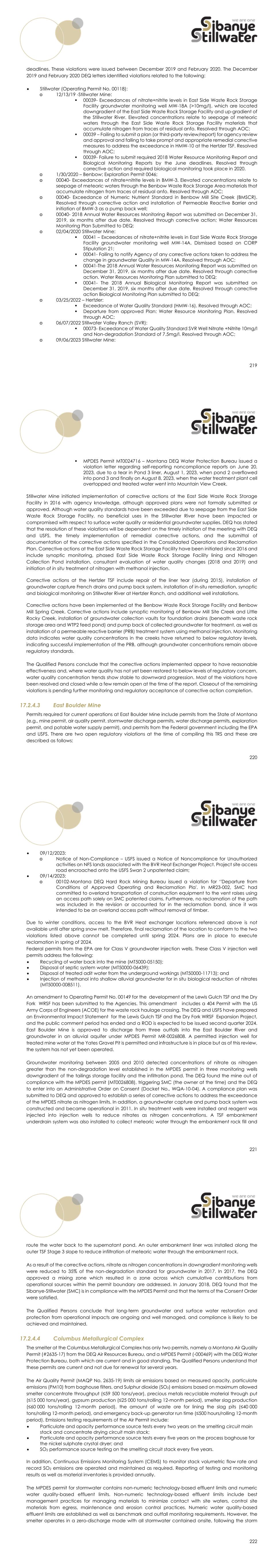 219 deadlines. These violations were issued between December 2019 and February 2020. The December 2019 and February 2020 DEQ letters identified violations related to the following:  Stillwater (Operating Permit No. 00118): o 12/13/19 -Stillwater Mine:  00039- Exceedances of nitrate+nitrite levels in East Side Waste Rock Storage Facility groundwater monitoring well MW-18A (>10mg/l), which are located downgradient of the East Side Waste Rock Storage Facility and up-gradient of the Stillwater River. Elevated concentrations relate to seepage of meteoric waters through the East Side Waste Rock Storage Facility materials that accumulate nitrogen from traces of residual anfo. Resolved through AOC;  00039 – Failing to submit a plan (or third-party review/report) for agency review and approval and falling to take prompt and appropriate remedial corrective measures to address the exceedance in HMW-10 at the Hertzler TSF. Resolved through AOC;  00039- Failure to submit required 2018 Water Resource Monitoring Report and Biological Monitoring Reports by the June deadlines. Resolved through corrective action and required biological monitoring took place in 2020. o 1/30/2020 – Benbow; Exploration Permit 0046; o 00040- Exceedances of nitrate+nitrite levels in BMW-3. Elevated concentrations relate to seepage of meteoric waters through the Benbow Waste Rock Storage Area materials that accumulate nitrogen from traces of residual anfo. Resolved through AOC; o 00040- Exceedance of Numeric Nutrient Standard in Benbow Mill Site Creek (BMSCR). Resolved through corrective action and installation of Permeable Reactive Barrier and initiation of BMW-3 as a pump back well; o 00040- 2018 Annual Water Resources Monitoring Report was submitted on December 31, 2019, six months after due date. Resolved through corrective action; Water Resources Monitoring Plan Submitted to DEQ; o 02/04/2020 Stillwater Mine:  00041 – Exceedances of nitrate+nitrite levels in East Side Waste Rock Storage Facility groundwater monitoring well MW-14A. Dismissed based on CORP Stipulation 21;  00041- Failing to notify Agency of any corrective actions taken to address the change in groundwater Quality in MW-14A. Resolved through AOC;  00041-The 2018 Annual Water Resources Monitoring Report was submitted on December 31, 2019, six months after due date. Resolved through corrective action. Water Resources Monitoring Plan submitted to DEQ;  00041- The 2018 Annual Biological Monitoring Report was submitted on December 31, 2019, six months after due date. Resolved through corrective action Biological Monitoring Plan submitted to DEQ; o 03/25/2022 – Hertzler:  Exceedance of Water Quality Standard (HMW-16). Resolved through AOC;  Departure from approved Plan: Water Resource Monitoring Plan. Resolved through AOC; o 06/07/2022 Stillwater Valley Ranch (SVR):  00073- Exceedance of Water Quality Standard SVR Well Nitrate +Nitrite 10mg/l and Non-degradation Standard of 7.5mg/l. Resolved through AOC; o 09/06/2023 Stillwater Mine: 220  MPDES Permit MT0024716 – Montana DEQ Water Protection Bureau issued a violation letter regarding self-reporting noncompliance reports on June 20, 2023, due to a tear in Pond 3 liner, August 1, 2023, when pond 2 overflowed into pond 3 and finally on August 8, 2023, when the water treatment plant cell overtopped and treated water went into Mountain View Creek. Stillwater Mine initiated implementation of corrective actions at the East Side Waste Rock Storage Facility in 2016 with agency knowledge, although approved plans were not formally submitted or approved. Although water quality standards have been exceeded due to seepage from the East Side Waste Rock Storage Facility, no beneficial uses in the Stillwater River have been impacted or compromised with respect to surface water quality or residential groundwater supplies. DEQ has stated that the resolution of these violations will be dependent on the timely initiation of the meeting with DEQ and USFS, the timely implementation of remedial corrective actions, and the submittal of documentation of the corrective actions specified in the Consolidated Operations and Reclamation Plan. Corrective actions at the East Side Waste Rock Storage Facility have been initiated since 2016 and include synoptic monitoring, phased East Side Waste Rock Storage Facility lining and Nitrogen Collection Pond installation, consultant evaluation of water quality changes (2018 and 2019) and initiation of in situ treatment of nitrogen with methanol injection. Corrective actions at the Hertzler TSF include repair of the liner tear (during 2015), installation of groundwater capture French drains and pump back system, installation of in-situ remediation, synoptic and biological monitoring on Stillwater River at Hertzler Ranch, and additional well installations. Corrective actions have been implemented at the Benbow Waste Rock Storage Facility and Benbow Mill Spring Creek. Corrective actions include synoptic monitoring of Benbow Mill Site Creek and Little Rocky Creek, installation of groundwater collection vaults for foundation drains (beneath waste rock storage area and WTP2 feed pond) and pump back of collected groundwater for treatment, as well as installation of a permeable reactive barrier (PRB) treatment system using methanol injection. Monitoring data indicates water quality concentrations in the creeks have returned to below regulatory levels, indicating successful implementation of the PRB, although groundwater concentrations remain above regulatory standards. The Qualified Persons conclude that the corrective actions implemented appear to have reasonable effectiveness and, where water quality has not yet been restored to below levels of regulatory concern, water quality concentration trends show stable to downward progression. Most of the violations have been resolved and closed while a few remain open at the time of the report. Closeout of the remaining viol