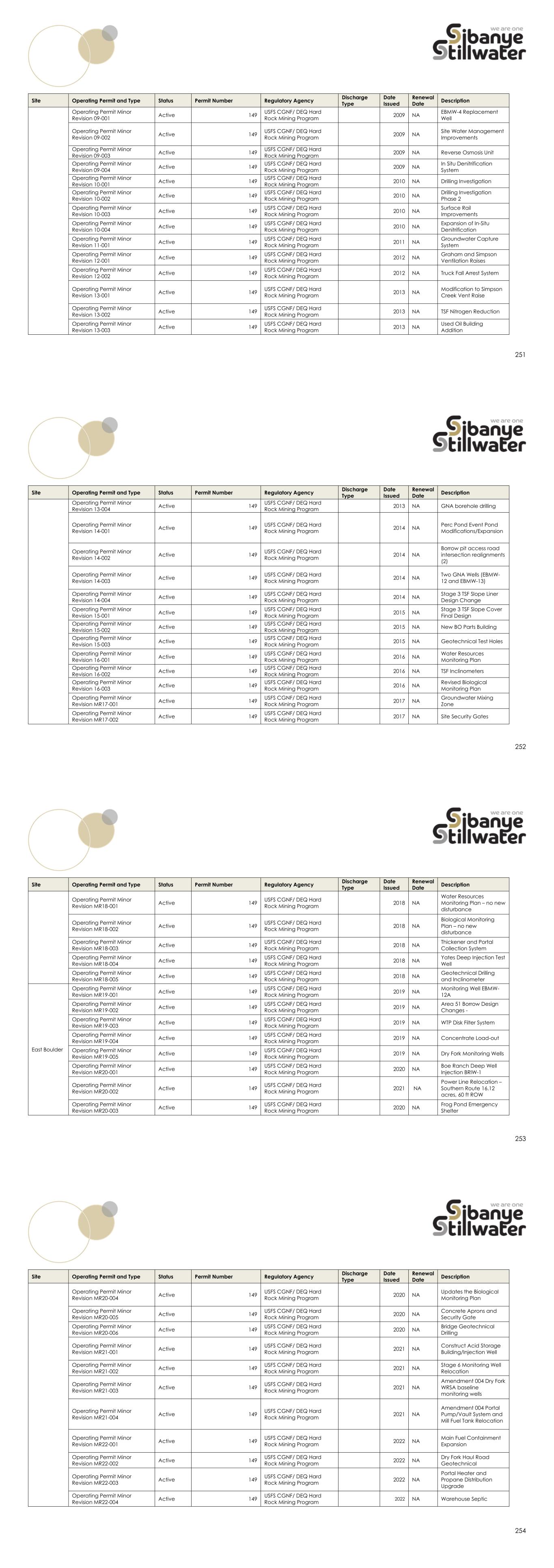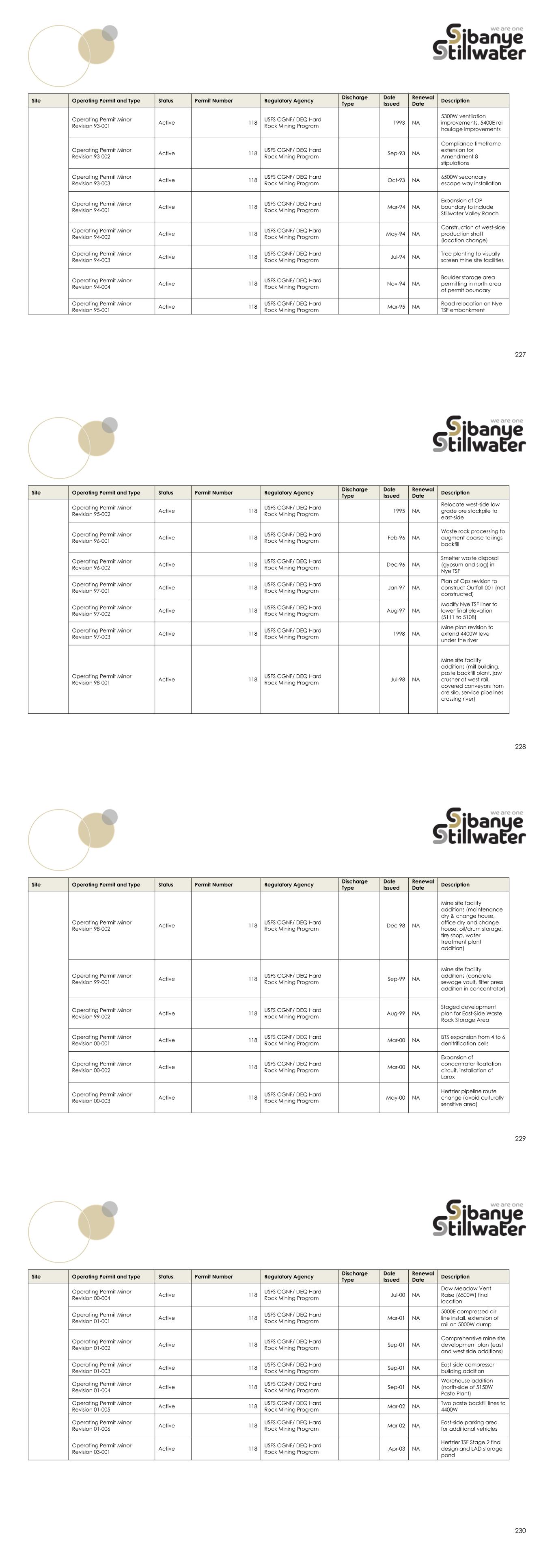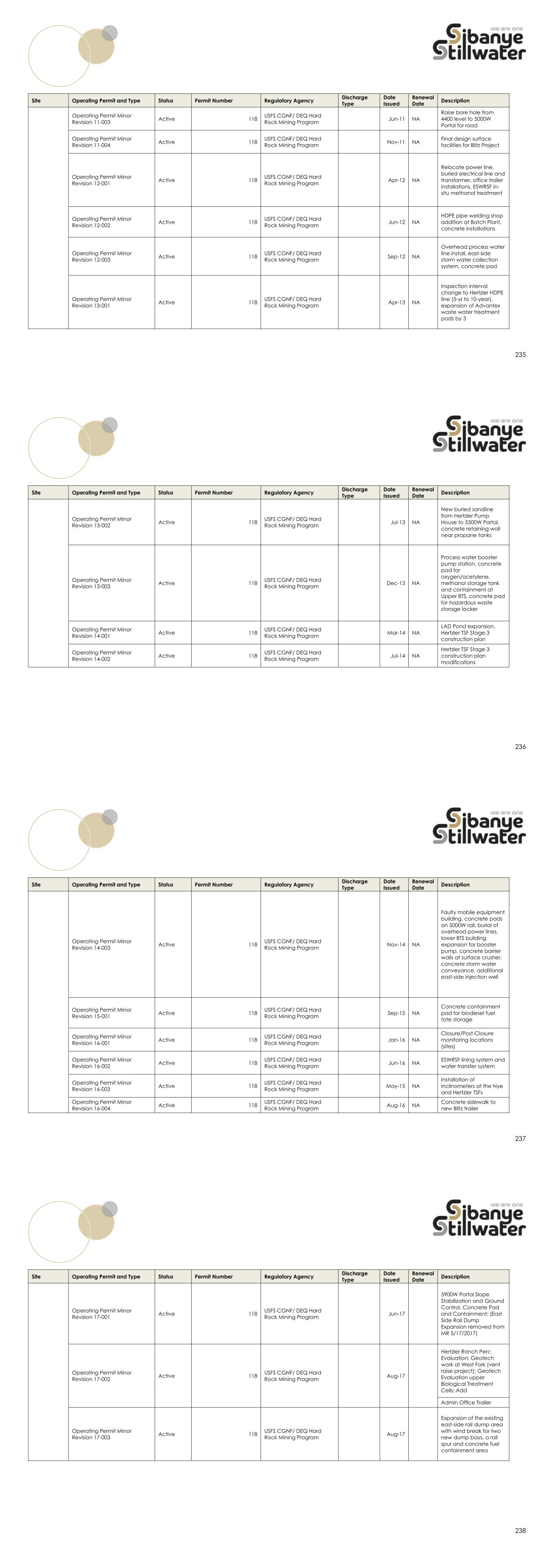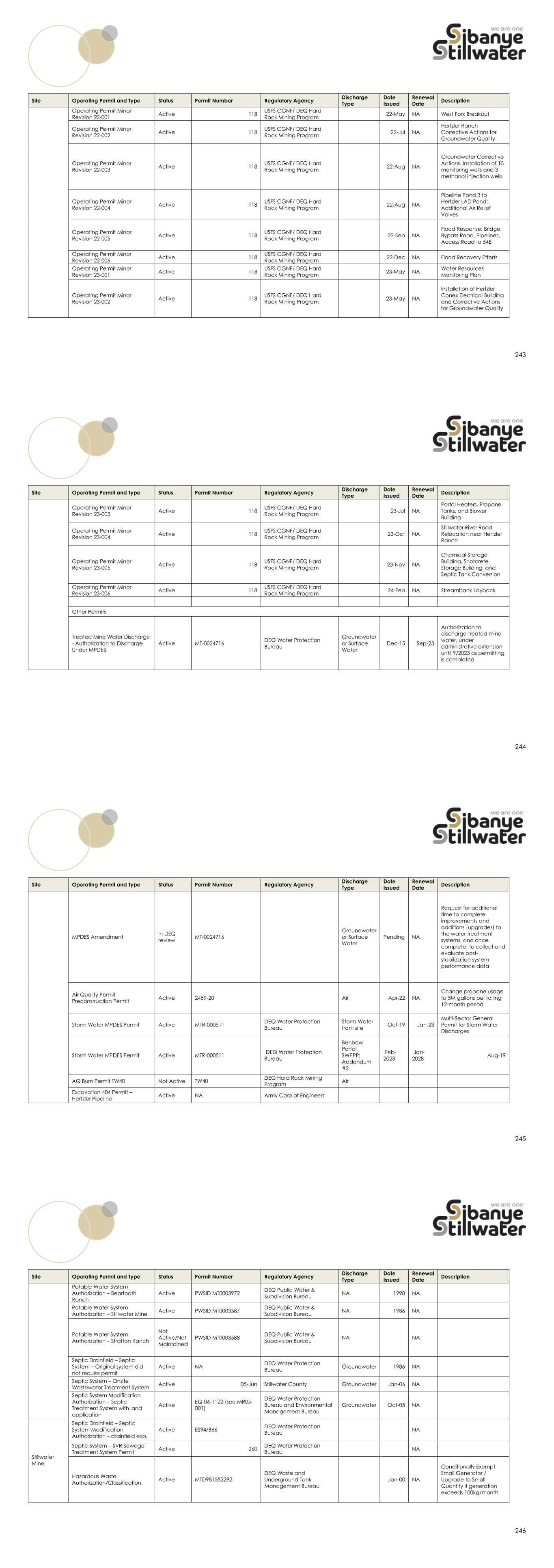 223 water pollution prevention plan and best management practices with all storm water retained via use of berms, ditches and percolation ponds. All permits have been renewed or revised in a timely manner. There are no performance or reclamation bonds associated with this facility. 224 Table 52: Permits Status Summary for the Sibanye-Stillwater US PGM Operations Site Operating Permit and Type Status Permit Number Regulatory Agency Discharge Type Date Issued Renewal Date Description Stillwater Mine Operating Permit and Type Status Permit Number Regulatory Agency Discharge Type Date Issued Renewal Date Description Original Permits Plan of Operations (POO) Active 118 USFS Custer Gallatin National Forest (CGNF)/ DEQ Hard Rock Mining Program Feb-90 NA Plan of Operations Original (EIS) Record of Decision Active 118 USFS CGNF/ DEQ Hard Rock Mining Program Jan-86 NA Mine Permit Stillwater Mine Operating Permit Active 118 USFS CGNF/ DEQ Hard Rock Mining Program Jan-86 NA Operating Permit #00118 - Approved by ROD in December 1985 Amendments Operating Permit Amendment No. 1 Active 118 USFS CGNF/ DEQ Hard Rock Mining Program Jun-86 NA Plant site relocation Operating Permit Amendment No. 2 Active 118 USFS CGNF/ DEQ Hard Rock Mining Program Sep-86 NA Sand borrow area approved Operating Permit Amendment No. 3 Active 118 USFS CGNF/ DEQ Hard Rock Mining Program Jan-87 NA Second sand borrow area approved Operating Permit Amendment No. 4 Active 118 USFS CGNF/ DEQ Hard Rock Mining Program Feb-87 NA Nye Tailings Impoundment toe dike relocation Operating Permit Amendment No. 5 Active 118 USFS CGNF/ DEQ Hard Rock Mining Program Mar-89 NA East-side development approved (increase permit area) Operating Permit Amendment No. 6 Active 118 USFS CGNF/ DEQ Hard Rock Mining Program Jul-89 NA Temporary sand pipeline approved 225 Site Operating Permit and Type Status Permit Number Regulatory Agency Discharge Type Date Issued Renewal Date Description Operating Permit Amendment No. 7 Active 118 USFS CGNF/ DEQ Hard Rock Mining Program Nov-90 NA Adit relocated, 3 perc ponds added, 5 monitoring wells added Operating Permit Amendment No. 8 Active 118 USFS CGNF/ DEQ Hard Rock Mining Program Sep-92 NA Facilities expansion, production increase to 2000 ton/day Operating Permit Amendment No. 9 Active 118 USFS CGNF/ DEQ Hard Rock Mining Program Mar-96 NA East-West mining areas connected with haulage way (mining under Stillwater River) Operating Permit Amendment No. 10 Active 118 USFS CGNF/ DEQ Hard Rock Mining Program Nov-98 NA Hertzler expansion approved and production cap eliminated Operating Permit Amendment No. 11 Active 118 USFS CGNF/ DEQ Hard Rock Mining Program Aug-12 NA Revised Water Management Plan at Stillwater, Hertzler LAD (closure/post-closure), Boe Ranch LAD (operations/closure/post- closure) Stillwater Mine Operating Permit Amendment No. 12 Active 118 USFS CGNF/ DEQ Hard Rock Mining Program Jul-10 NA Addition of Hertzler LAD Pivot #7 226 Site Operating Permit and Type Status Permit Number Regulatory Agency Discharge Type Date Issued Renewal Date Description Operating Permit Amendment No. 13 Active 118 USFS CGNF/ DEQ Hard Rock Mining Program May-23 NA Incorporated the Benbow Exploration Project into Mine Permit 00118 Operating Permit Amendment No. 14 Pending 118 USFS CGNF/ DEQ Hard Rock Mining Program Pending Minor Revisions Operating Permit Minor Revision 89-001 Active 118 USFS CGNF/ DEQ Hard Rock Mining Program Dec-89 NA Waste rock haulage railroad spur at 5150W Adit Operating Permit Minor Revision 90-001 Active 118 USFS CGNF/ DEQ Hard Rock Mining Program Jul-90 NA 5200E Ventilation Adit with auxiliary facilities Operating Permit Minor Revision 90-002 Active 118 USFS CGNF/ DEQ Hard Rock Mining Program Sep-90 NA Sediment basin construction (no new permit area) Operating Permit Minor Revision 91-001 Active 118 USFS CGNF/ DEQ Hard Rock Mining Program Jun-91 NA 5200E Portal, spur road, laydown, and access road Operating Permit Minor Revision 91-002 Active 118 USFS CGNF/ DEQ Hard Rock Mining Program Oct-91 NA Compressor pipeline crossing at Stillwater River Bridge Operating Permit Minor Revision 92-001 Active 118 USFS CGNF/ DEQ Hard Rock Mining Program Mar-92 NA 5000E loci haul rail track extension Operating Permit Minor Revision 92-002 Active 118 USFS CGNF/ DEQ Hard Rock Mining Program 1992 Permanent 5400E waste rock pile, eliminate laydown