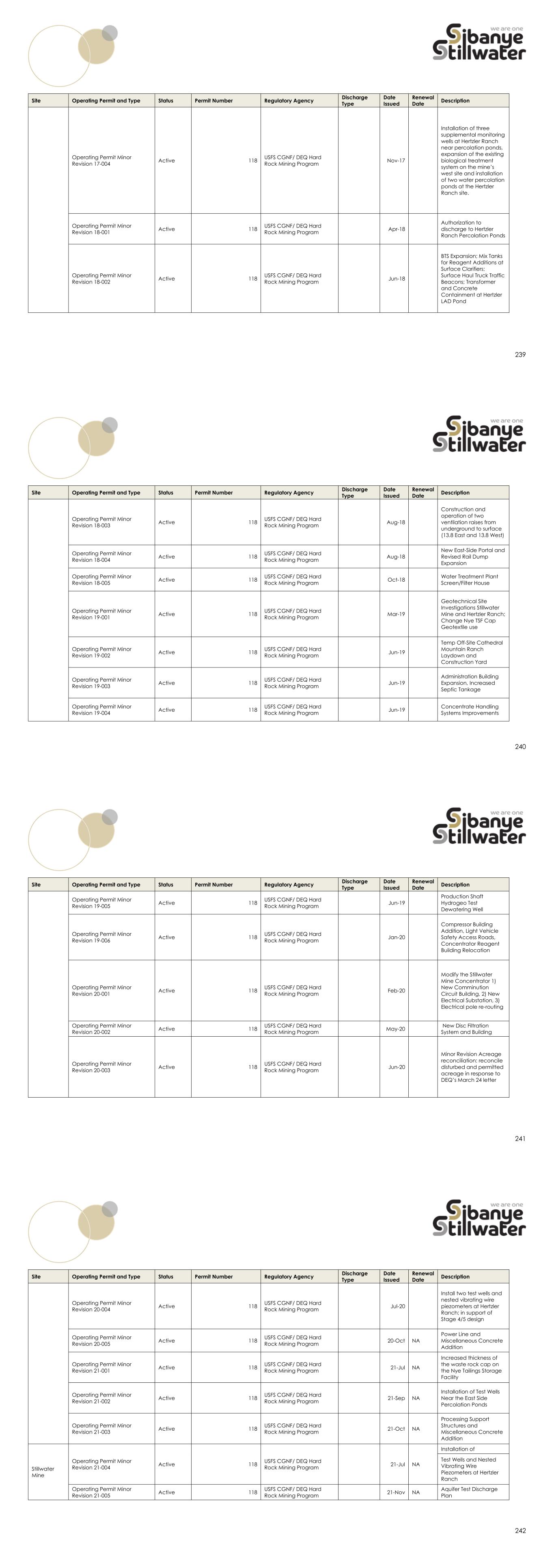 239 Site Operating Permit and Type Status Permit Number Regulatory Agency Discharge Type Date Issued Renewal Date Description Operating Permit Minor Revision 17-004 Active 118 USFS CGNF/ DEQ Hard Rock Mining Program Nov-17 Installation of three supplemental monitoring wells at Hertzler Ranch near percolation ponds, expansion of the existing biological treatment system on the mine’s west site and installation of two water percolation ponds at the Hertzler Ranch site. Operating Permit Minor Revision 18-001 Active 118 USFS CGNF/ DEQ Hard Rock Mining Program Apr-18 Authorization to discharge to Hertzler Ranch Percolation Ponds Operating Permit Minor Revision 18-002 Active 118 USFS CGNF/ DEQ Hard Rock Mining Program Jun-18 BTS Expansion; Mix Tanks for Reagent Additions at Surface Clarifiers; Surface Haul Truck Traffic Beacons; Transformer and Concrete Containment at Hertzler LAD Pond 240 Site Operating Permit and Type Status Permit Number Regulatory Agency Discharge Type Date Issued Renewal Date Description Operating Permit Minor Revision 18-003 Active 118 USFS CGNF/ DEQ Hard Rock Mining Program Aug-18 Construction and operation of two ventilation raises from underground to surface (13.8 East and 13.8 West) Operating Permit Minor Revision 18-004 Active 118 USFS CGNF/ DEQ Hard Rock Mining Program Aug-18 New East-Side Portal and Revised Rail Dump Expansion Operating Permit Minor Revision 18-005 Active 118 USFS CGNF/ DEQ Hard Rock Mining Program Oct-18 Water Treatment Plant Screen/Filter House Operating Permit Minor Revision 19-001 Active 118 USFS CGNF/ DEQ Hard Rock Mining Program Mar-19 Geotechnical Site Investigations Stillwater Mine and Hertzler Ranch; Change Nye TSF Cap Geotextile use Operating Permit Minor Revision 19-002 Active 118 USFS CGNF/ DEQ Hard Rock Mining Program Jun-19 Temp Off-Site Cathedral Mountain Ranch Laydown and Construction Yard Operating Permit Minor Revision 19-003 Active 118 USFS CGNF/ DEQ Hard Rock Mining Program Jun-19 Administration Building Expansion, Increased Septic Tankage Operating Permit Minor Revision 19-004 Active 118 USFS CGNF/ DEQ Hard Rock Mining Program Jun-19 Concentrate Handling Systems Improvements 241 Site Operating Permit and Type Status Permit Number Regulatory Agency Discharge Type Date Issued Renewal Date Description Operating Permit Minor Revision 19-005 Active 118 USFS CGNF/ DEQ Hard Rock Mining Program Jun-19 Production Shaft Hydrogeo Test Dewatering Well Operating Permit Minor Revision 19-006 Active 118 USFS CGNF/ DEQ Hard Rock Mining Program Jan-20 Compressor Building Addition, Light Vehicle Safety Access Roads, Concentrator Reagent Building Relocation Operating Permit Minor Revision 20-001 Active 118 USFS CGNF/ DEQ Hard Rock Mining Program Feb-20 Modify the Stillwater Mine Concentrator 1) New Comminution Circuit Building, 2) New Electrical Substation, 3) Electrical pole re-routing Operating Permit Minor Revision 20-002 Active 118 USFS CGNF/ DEQ Hard Rock Mining Program May-20 New Disc Filtration System and Building Operating Permit Minor Revision 20-003 Active 118 USFS CGNF/ DEQ Hard Rock Mining Program Jun-20 Minor Revision Acreage reconciliation: reconcile disturbed and permitted acreage in response to DEQ’s March 24 letter 242 Site Operating Permit and Type Status Permit Number Regulatory Agency Discharge Type Date Issued Renewal Date Description Operating Permit Minor Revision 20-004 Active 118 USFS CGNF/ DEQ Hard Rock Mining Program Jul-20 Install two test wells and nested vibrating wire piezometers at Hertzler Ranch; in support of Stage 4/5 design Operating Permit Minor Revision 20-005 Active 118 USFS CGNF/ DEQ Hard Rock Mining Program 20-Oct NA Power Line and Miscellaneous Concrete Addition Operating Permit Minor Revision 21-001 Active 118 USFS CGNF/ DEQ Hard Rock Mining Program 21-Jul NA Increased thickness of the waste rock cap on the Nye Tailings Storage Facility Operating Permit Minor Revision 21-002 Active 118 USFS CGNF/ DEQ Hard Rock Mining Program 21-Sep NA Installation of Test Wells Near the East Side Percolation Ponds Operating Permit Minor Revision 21-003 Active 118 USFS CGNF/ DEQ Hard Rock Mining Program 21-Oct NA Processing Support Structures and Miscellaneous Concrete Addition Stillwater Mine Operating Permit Minor Revision 21-004 Active 118 USFS CGNF/ DEQ Hard Rock Mining Program 21-Jul NA Installation of Test Wells and Nested Vibrating Wire Piezometers at Hertzler Ranch Operating Permit Minor Revision 21-005 Active 118 USFS CGNF/ DEQ Hard Rock Mining Program 21-Nov NA Aquifer Test Discharge Plan