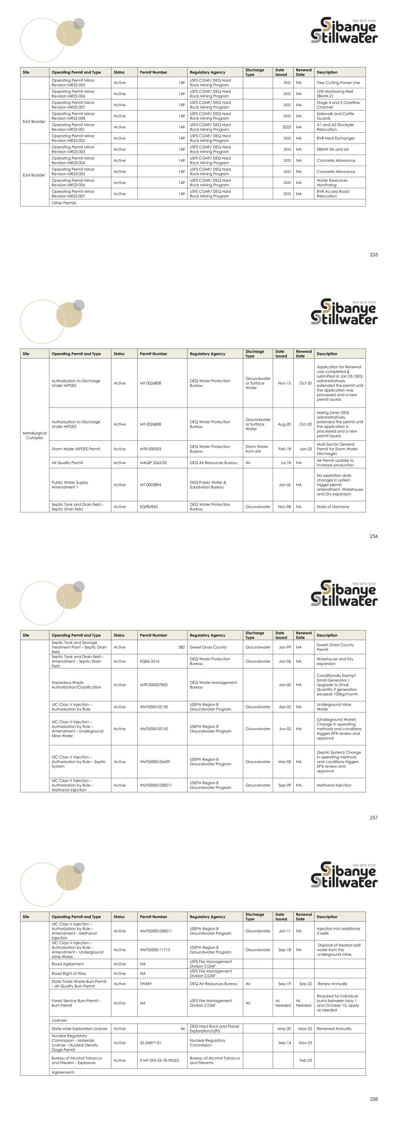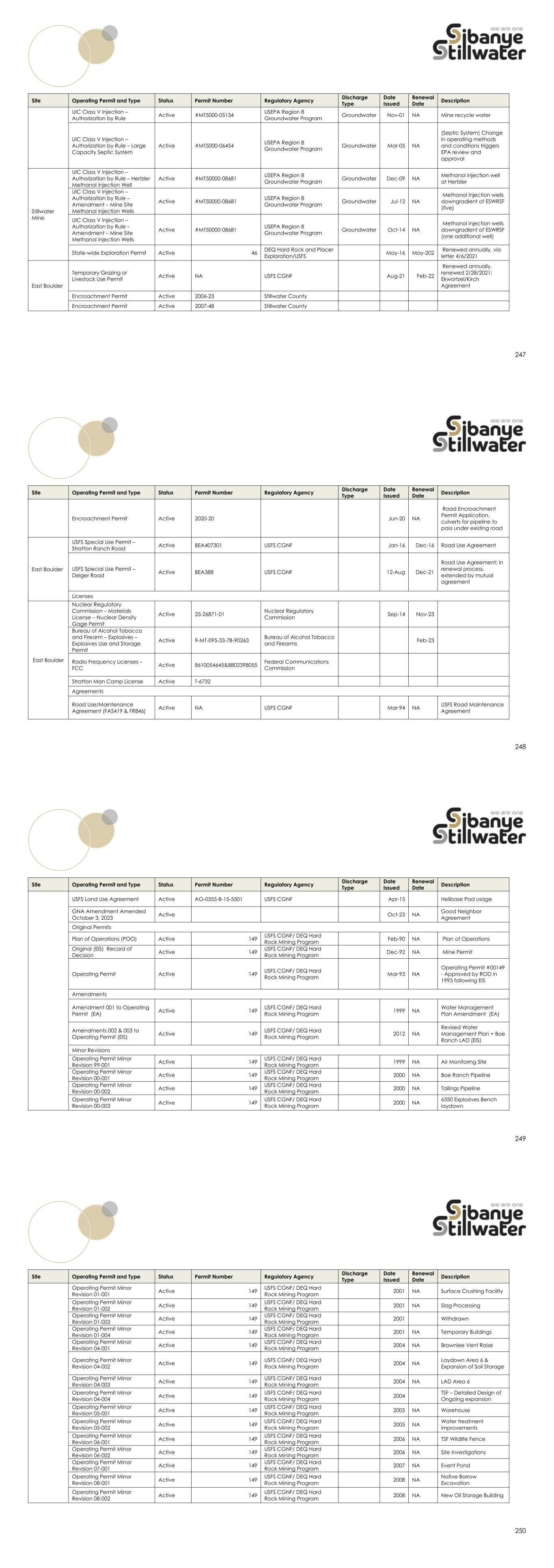 247 Site Operating Permit and Type Status Permit Number Regulatory Agency Discharge Type Date Issued Renewal Date Description UIC Class V Injection – Authorization by Rule Active #MT5000-05134 USEPA Region 8 Groundwater Program Groundwater Nov-01 NA Mine recycle water UIC Class V Injection – Authorization by Rule – Large Capacity Septic System Active #MT5000-06454 USEPA Region 8 Groundwater Program Groundwater Mar-05 NA (Septic System) Change in operating methods and conditions triggers EPA review and approval Stillwater Mine UIC Class V Injection – Authorization by Rule – Hertzler Methanol Injection Well Active #MT50000-08681 USEPA Region 8 Groundwater Program Groundwater Dec-09 NA Methanol injection well at Hertzler UIC Class V Injection – Authorization by Rule – Amendment – Mine Site Methanol Injection Wells Active #MT50000-08681 USEPA Region 8 Groundwater Program Groundwater Jul-12 NA Methanol injection wells downgradient of ESWRSF (five) UIC Class V Injection – Authorization by Rule – Amendment – Mine Site Methanol Injection Wells Active #MT50000-08681 USEPA Region 8 Groundwater Program Groundwater Oct-14 NA Methanol injection wells downgradient of ESWRSF (one additional well) State-wide Exploration Permit Active 46 DEQ Hard Rock and Placer Exploration/USFS May-16 May-202 Renewed annually, via letter 4/6/2021 East Boulder Temporary Grazing or Livestock Use Permit Active NA USFS CGNF Aug-21 Feb-22 Renewed annually, renewed 2/28/2021; Ekwortzel/Kirch Agreement Encroachment Permit Active 2006-23 Stillwater County Encroachment Permit Active 2007-48 Stillwater County 248 Site Operating Permit and Type Status Permit Number Regulatory Agency Discharge Type Date Issued Renewal Date Description Encroachment Permit Active 2020-20 Jun-20 NA Road Encroachment Permit Application, culverts for pipeline to pass under existing road East Boulder USFS Special Use Permit – Stratton Ranch Road Active BEA407301 USFS CGNF Jan-16 Dec-16 Road Use Agreement USFS Special Use Permit – Delger Road Active BEA388 USFS CGNF 12-Aug Dec-21 Road Use Agreement; in renewal process, extended by mutual agreement Licenses East Boulder Nuclear Regulatory Commission – Materials License – Nuclear Density Gage Permit Active 25-26871-01 Nuclear Regulatory Commission Sep-14 Nov-23 Bureau of Alcohol Tobacco and Firearm – Explosives – Explosives Use and Storage Permit Active 9-MT-095-33-7B-90263 Bureau of Alcohol Tobacco and Firearms Feb-23 Radio Frequency Licenses – FCC Active 8610054645&8802398055 Federal Communications Commission Stratton Man Camp License Active T-6732 Agreements Road Use/Maintenance Agreement (FAS419 & FR846) Active NA USFS CGNF Mar-94 NA USFS Road Maintenance Agreement 249 Site Operating Permit and Type Status Permit Number Regulatory Agency Discharge Type Date Issued Renewal Date Description USFS Land Use Agreement Active AG-0355-B-15-5501 USFS CGNF Apr-15 Helibase Pad usage GNA Amendment Amended October 3, 2023 Active Oct-23 NA Good Neighbor Agreement Original Permits Plan of Operations (POO) Active 149 USFS CGNF/ DEQ Hard Rock Mining Program Feb-90 NA Plan of Operations Original (EIS) Record of Decision Active 149 USFS CGNF/ DEQ Hard Rock Mining Program Dec-92 NA Mine Permit Operating Permit Active 149 USFS CGNF/ DEQ Hard Rock Mining Program Mar-93 NA Operating Permit #00149 - Approved by ROD in 1993 following EIS Amendments Amendment 001 to Operating Permit (EA) Active 149 USFS CGNF/ DEQ Hard Rock Mining Program 1999 NA Water Management Plan Amendment (EA) Amendments 002 & 003 to Operating Permit (EIS) Active 149 USFS CGNF/ DEQ Hard Rock Mining Program 2012 NA Revised Water Management Plan + Boe Ranch LAD (EIS) Minor Revisions Operating Permit Minor Revision 99-001 Active 149 USFS CGNF/ DEQ Hard Rock Mining Program 1999 NA Air Monitoring Site Operating Permit Minor Revision 00-001 Active 149 USFS CGNF/ DEQ Hard Rock Mining Program 2000 NA Boe Ranch Pipeline Operating Permit Minor Revision 00-002 Active 149 USFS CGNF/ DEQ Hard Rock Mining Program 2000 NA Tailings Pipeline Operating Permit Minor Revision 00-003 Active 149 USFS CGNF/ DEQ Hard Rock Mining Program 2000 NA 6350 Explosives Bench laydown 250 Site Operating Permit and Type Status Permit Number Regulatory Agency Discharge Type Date Issued Renewal Date Description Operating Permit Minor Revision 01-001 Active 149 USFS CGNF/ DEQ Hard Rock Mining Program 2001 NA Surface Crushing Facility Operating Permit Minor Revision 01-002 Active 149 USFS CGNF/ DEQ Hard Rock Mining Program 2001 NA Slag Processing Operating Permit Minor Revision 01-003 Active 149 USFS CGNF/ DEQ Hard Rock Mining Program 2001 Withdrawn Operating Permit Minor Revision 01-004 Active 149 USFS CGNF/ DEQ Hard Rock Mining Program 2001 NA Temporary Buildings Operating Permit Minor Revision 04-001 Active 149 USFS CGNF/ DEQ Hard Rock Mining Program 2004 NA Brownlee Vent Raise Operating Permit Minor Revision 04-002 Active 149 USFS CGNF/ DEQ Hard Rock Mining Program 2004 NA Laydown Area 6 & Expansion of Soil Storage Operating Permit Minor Revision 04-003 Active 149 USFS CGNF/ DEQ Hard Rock Mining Program 2004 NA LAD Area 6 Operating Permit Minor Revision 04-004 Active 149 USFS CGNF/ DEQ Hard Rock Mining Program 2004 TSF – Detailed Design of Ongoing expansion Operating Permit Minor Revision 05-001 Active 149 USFS CGNF/ DEQ Hard Rock Mining Program 2005 NA Warehouse Operating Permit Minor Revision 05-002 Active 149 USFS CGNF/ DEQ Hard Rock Mining Program 2005 NA Water treatment improvements Operating Permit Minor Revision 06-001 Active 149 USFS CGNF/ DEQ Hard Rock Mining Program 2006 NA TSF Wildlife Fence Operating Permit Minor Revision 06-002 Active 149 USFS CGNF/ DEQ Hard Rock Mining Program 2006 NA Site Investigations Operating Permit Minor Revision 07-001 Active 149 USFS CGNF/ DEQ Hard Rock Mining Program 2007 NA Event Pond Operating Permit Minor Revision 08-001 Active 149 USFS CGNF/ DEQ Hard Rock Mining Program 2008 NA Native Borrow Excavation Operating