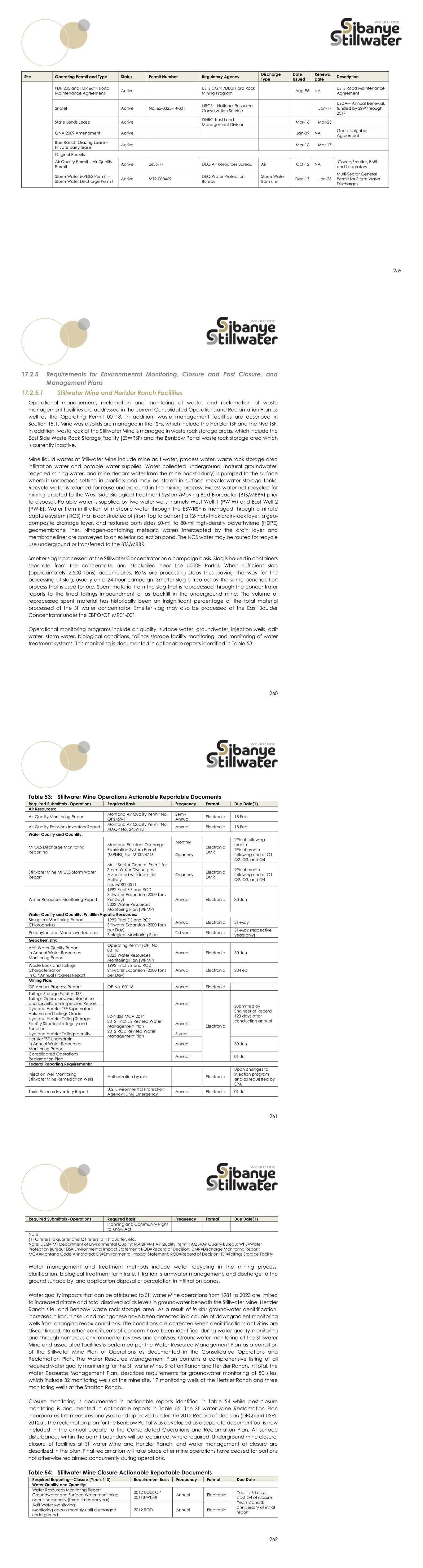 259 Site Operating Permit and Type Status Permit Number Regulatory Agency Discharge Type Date Issued Renewal Date Description FDR 205 and FDR 6644 Road Maintenance Agreement Active USFS CGNF/DEQ Hard Rock Mining Program Aug-96 NA USFS Road Maintenance Agreement Snotel Active No. 65-0325-14-001 NRCS–- National Resource Conservation Service Jan-17 USDA–- Annual Renewal, funded by SSW through 2017 State Lands Lease Active DNRC Trust Land Management Division Mar-16 Mar-23 GNA 2009 Amendment Active Jan-09 NA Good Neighbor Agreement Boe Ranch Grazing Lease – Private party lease Active Mar-16 Mar-17 Original Permits Air Quality Permit – Air Quality Permit Active 2635-17 DEQ Air Resources Bureau Air Oct-12 NA Covers Smelter, BMR, and Laboratory Storm Water MPDES Permit – Storm Water Discharge Permit Active MTR-000469 DEQ Water Protection Bureau Storm Water from site Dec-13 Jan-23 Multi-Sector General Permit for Storm Water Discharges 260 Requirements for Environmental Monitoring, Closure and Post Closure, and Management Plans 17.2.5.1 Stillwater Mine and Hertzler Ranch Facilities Operational management, reclamation and monitoring of wastes and reclamation of waste management facilities are addressed in the current Consolidated Operations and Reclamation Plan as well as the Operating Permit 00118. In addition, waste management facilities are described in Section 15.1. Mine waste solids are managed in the TSFs, which include the Hertzler TSF and the Nye TSF. In addition, waste rock at the Stillwater Mine is managed in waste rock storage areas, which include the East Side Waste Rock Storage Facility (ESWRSF) and the Benbow Portal waste rock storage area which is currently inactive. Mine liquid wastes at Stillwater Mine include mine adit water, process water, waste rock storage area infiltration water and potable water supplies. Water collected underground (natural groundwater, recycled mining water, and mine decant water from the mine backfill slurry) is pumped to the surface where it undergoes settling in clarifiers and may be stored in surface recycle water storage tanks. Recycle water is returned for reuse underground in the mining process. Excess water not recycled for mining is routed to the West-Side Biological Treatment System/Moving Bed Bioreactor (BTS/MBBR) prior to disposal. Potable water is supplied by two water wells, namely West Well 1 (PW-W) and East Well 2 (PW-E). Water from infiltration of meteoric water through the ESWRSF is managed through a nitrate capture system (NCS) that is constructed of (from top to bottom) a 12-inch-thick drain-rock layer, a geo- composite drainage layer, and textured both sides 60-mil to 80-mil high-density polyethylene (HDPE) geomembrane liner. Nitrogen-containing meteoric waters intercepted by the drain layer and membrane liner are conveyed to an exterior collection pond. The NCS water may be routed for recycle use underground or transferred to the BTS/MBBR. Smelter slag is processed at the Stillwater Concentrator on a campaign basis. Slag is hauled in containers separate from the concentrate and stockpiled near the 5000E Portal. When sufficient slag (approximately 2 500 tons) accumulates, RoM ore processing stops thus paving the way for the processing of slag, usually on a 24-hour campaign. Smelter slag is treated by the same beneficiation process that is used for ore. Spent material from the slag that is reprocessed through the concentrator reports to the lined tailings impoundment or as backfill in the underground mine. The volume of reprocessed spent material has historically been an insignificant percentage of the total material processed at the Stillwater concentrator. Smelter slag may also be processed at the East Boulder Concentrator under the EBPO/OP MR01-001. Operational monitoring programs include air quality, surface water, groundwater, injection wells, adit water, storm water, biological conditions, tailings storage facility monitoring, and monitoring of water treatment systems. This monitoring is documented in actionable reports identified in Table 53. 261 Table 53: Stillwater Mine Operations Actionable Reportable Documents Required Submittals -Operations Required Basis Frequency Format Due Date(1) Air Resources: Air Quality Monitoring Report Montana Air Quality Permit No. OP2459-11 Semi- Annual Electronic 15-Feb Air Quality Emissions Inventory Report Montana Air Quality Permit No. MAQP No. 2459-18 Annual Electronic 15-Feb Water Quality and Quantity: MPDES Discharge Monitoring Reporting Montana Pollutant Discharge Elimination System Permit (MPDES) No. MT0024716 Monthly Electronic DMR 28th of following month Quarterly 28th of month following end of Q1, Q2, Q3, and Q4 Stillwater Mine MPDES Storm Water Report Multi-Sector General Permit for Storm Water Discharges Associated with Industrial Activity No. MTR000511 Quarterly Electronic DMR 28th of month following end of Q1, Q2, Q3, and Q4 Water Resources Monitoring Report 1992 Final EIS and ROD Stillwater Expansion (2000 Tons Per Day) 2023 Water Resources Monitoring Plan (WRMP) Annual Electronic 30-Jun Water Quality and Quantity; Wildlife/Aquatic Resources: Biological Monitoring Report 1992 Final EIS and ROD Stillwater Expansion (2000 Tons per Day) Biological Monitoring Plan Annual Electronic 31-May Chlorophyll-a Periphyton and Macroinvertebrates 2nd year Electronic 31-May (respective years only) Geochemistry: Adit Water Quality Report in Annual Water Resources Monitoring Report Operating Permit (OP) No. 00118 2023 Water Resources Monitoring Plan (WRMP) Annual Electronic 30-Jun Waste Rock and Tailings Characterization in OP Annual Progress Report 1992 Final EIS and ROD Stillwater Expansion (2000 Tons per Day) Annual Electronic 28-Feb Mining Plan: OP Annual Progress Report OP No. 00118 Annual Electronic Electronic Submitted by Engineer of Record 120 days after conducting annual Tailings Storage Facility (TSF) Tailings Operations, Maintenance and Surveillance Inspection Report 82-4-336 MC
