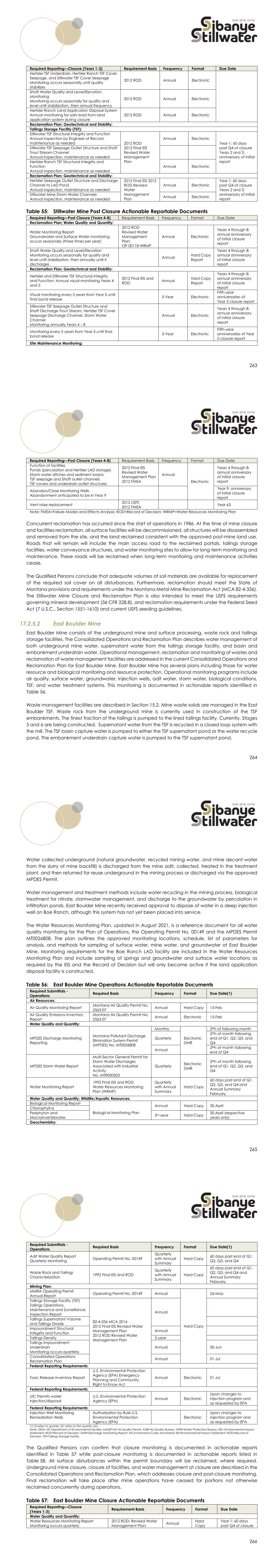 263 Required Reporting—Closure (Years 1-3) Requirement Basis Frequency Format Due Date Hertzler TSF Underdrain, Hertzler Ranch TSF Cover Seepage, and Stillwater TSF Cover Seepage Monitoring occurs seasonally until quality stabilizes 2012 ROD Annual Electronic Shaft Water Quality and Level/Elevation Monitoring Monitoring occurs seasonally for quality and level until stabilization, then annual frequency 2012 ROD Annual Electronic Hertzler Ranch Land Application Disposal System Annual monitoring for salts load from land application system during closure 2012 ROD Annual Electronic Reclamation Plan; Geotechnical and Stability: Tailings Storage Facility (TSF): Stillwater TSF Structural Integrity and Function Annual inspection by Engineer of Record, maintenance as needed 2012 ROD 2012 Final EIS Revised Water Management Plan Annual Electronic Year 1: 60 days past Q4 of closure Years 2 and 3: anniversary of initial report Stillwater TSF Seepage Outlet Structure and Shaft Trout Stream Channel Annual inspection, maintenance as needed Hertzler Ranch TSF Structural Integrity and Function Annual inspection, maintenance as needed Annual Electronic Reclamation Plan; Geotechnical and Stability: Hertzler Seepage Outlet Structure and Discharge Channel to LAD Pond Annual inspection, maintenance as needed 2012 Final EIS 2012 ROD Revised Water Management Plan Annual Electronic Year 1: 60 days past Q4 of closure Years 2 and 3: anniversary of initial report Stillwater Mine Storm Water Channels Annual inspection, maintenance as needed Annual Electronic Table 55: Stillwater Mine Post Closure Actionable Reportable Documents Required Reporting—Post Closure (Years 4-8) Requirement Basis Frequency Format Due Date Reclamation Plan; Water Quality and Quantity: Water Monitoring Report Groundwater and Surface Water monitoring occurs seasonally (three times per year) 2012 ROD Revised Water Management Plan; OP 00118 WRMP Annual Electronic Years 4 through 8: annual anniversary of initial closure report Shaft Water Quality and Level/Elevation Monitoring occurs seasonally for quality and level until stabilization, then annually until it discharges Annual Hard Copy Report Years 4 through 8: annual anniversary of initial closure report Reclamation Plan; Geotechnical and Stability: Hertzler and Stillwater TSF Structural Integrity and Function; Annual visual monitoring Years 4 and 5 2012 Final EIS and ROD Annual Hard Copy Report Years 4 through 8: annual anniversary of initial closure report Visual monitoring every 5 years from Year 5 until final bond release 5-Year Electronic Fifth-year anniversaries of Year 5 closure report Stillwater TSF Seepage Outlet Structure and Shaft Discharge Trout Stream, Hertzler TSF Cover Seepage Discharge Channel, Storm Water Channel Monitoring annually Years 4 – 8 Annual Electronic Years 4 through 8: annual anniversary of initial closure report Monitoring every 5 years from Year 5 until final bond release 5-Year Electronic Fifth-year anniversaries of Year 5 closure report Site Maintenance Monitoring: 264 Required Reporting—Post Closure (Years 4-8) Requirement Basis Frequency Format Due Date Function of facilities Ponds (percolation and Hertzler LAD storage) Storm water ditches and sediment basins TSF seepage and Shaft outlet channels TSF covers and underdrain outlet structures 2012 Final EIS Revised Water Management Plan 2012 FMEA Annual Electronic Years 4 through 8: annual anniversary of initial closure report Abandon/Close Monitoring Wells Abandonment anticipated to be in Year 9 Year 9: anniversary of initial closure report Vent raise replacement 2012 USFS 2012 FMEA Year 63 Note: FMEA=Failure Modes and Effects Analysis; ROD=Record of Decision; WRMP=Water Resources Monitoring Plan Concurrent reclamation has occurred since the start of operations in 1986. At the time of mine closure and facilities reclamation, all surface facilities will be decommissioned, all structures will be disassembled and removed from the site, and the land reclaimed consistent with the approved post-mine land use. Roads that will remain will include the main access road to the reclaimed portals, tailings storage facilities, water conveyance structures, and water monitoring sites to allow for long-term monitoring and maintenance. These roads will be reclaimed when long-term monitoring and maintenance activities cease. The Qualified Persons conclude that adequate volumes of soil materials are available for replacement of the required soil cover on all disturbances. Furthermore, reclamation should meet the State of Montana provisions and requirements under the Montana Metal Mine Reclamation Act (MCA 82-4-336). The Stillwater Mine Closure and Reclamation Plan is also intended to meet the USFS requirements governing mineral development (36 CFR 228.8), and reclamation requirements under the Federal Seed Act (7 U.S.C., Section 1551-1610) and current USFS seeding guidelines. 17.2.5.2 East Boulder Mine East Boulder Mine consists of the underground mine and surface processing, waste rock and tailings storage facilities. The Consolidated Operations and Reclamation Plan describes water management of both underground mine water, supernatant water from the tailings storage facility, and basin and embankment underdrain water. Operational management, reclamation and monitoring of wastes and reclamation of waste management facilities are addressed in the current Consolidated Operations and Reclamation Plan for East Boulder Mine. East Boulder Mine has several plans including those for water resource and biological monitoring and resource protection. Operational monitoring programs include air quality, surface water, groundwater, injection wells, adit water, storm water, biological conditions, TSF, and water treatment systems. This monitoring is documented in actionable reports identified in Table 56. Waste management facilities are described in Section 15.2. Mine waste solids are managed in the East Boulder TSF. Waste rock from the un