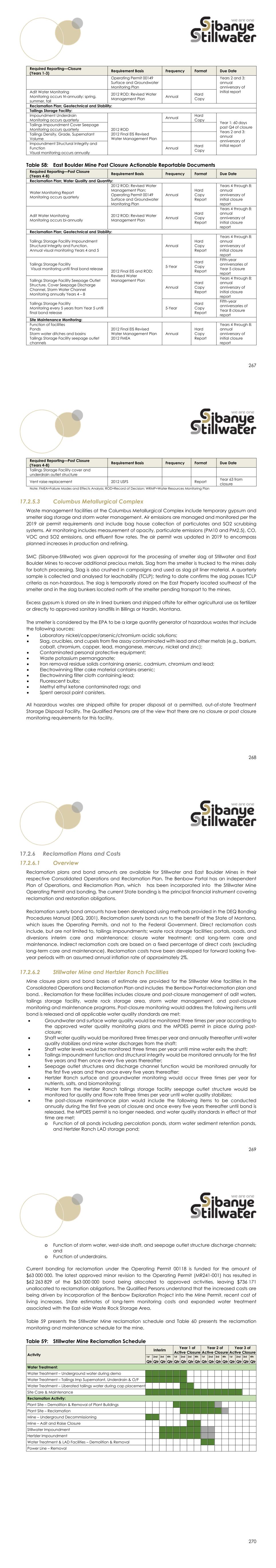 267 Required Reporting—Closure (Years 1-3) Requirement Basis Frequency Format Due Date Operating Permit 00149 Surface and Groundwater Monitoring Plan Years 2 and 3: annual anniversary of initial report Adit Water Monitoring Monitoring occurs tri-annually: spring, summer, fall 2012 ROD; Revised Water Management Plan Annual Hard Copy Reclamation Plan; Geotechnical and Stability: Tailings Storage Facility: Impoundment Underdrain Monitoring occurs quarterly 2012 ROD 2012 Final EIS Revised Water Management Plan Annual Hard Copy Year 1: 60 days past Q4 of closure Years 2 and 3: annual anniversary of initial report Tailings Impoundment Cover Seepage Monitoring occurs quarterly Tailings Density, Grade, Supernatant Volume Impoundment Structural Integrity and Function Visual monitoring occurs annually Annual Hard Copy Table 58: East Boulder Mine Post Closure Actionable Reportable Documents Required Reporting—Post Closure (Years 4-8) Requirement Basis Frequency Format Due Date Reclamation Plan; Water Quality and Quantity: Water Monitoring Report Monitoring occurs quarterly 2012 ROD; Revised Water Management Plan; Operating Permit 00149 Surface and Groundwater Monitoring Plan Annual Hard Copy Report Years 4 through 8: annual anniversary of initial closure report Adit Water Monitoring Monitoring occurs bi-annually 2012 ROD; Revised Water Management Plan Annual Hard Copy Report Years 4 through 8: annual anniversary of initial closure report Reclamation Plan; Geotechnical and Stability: Tailings Storage Facility Impoundment Structural Integrity and Function. Annual visual monitoring Years 4 and 5 2012 Final EIS and ROD; Revised Water Management Plan Annual Hard Copy Report Years 4 through 8: annual anniversary of initial closure report Tailings Storage Facility Visual monitoring until final bond release 5-Year Hard Copy Report Fifth-year anniversaries of Year 5 closure report Tailings Storage Facility Seepage Outlet Structure, Cover Seepage Discharge Channel, Storm Water Channel Monitoring annually Years 4 – 8 Annual Hard Copy Report Years 4 through 8: annual anniversary of initial closure report Tailings Storage Facility Monitoring every 5 years from Year 5 until final bond release 5-Year Hard Copy Report Fifth-year anniversaries of Year 8 closure report Site Maintenance Monitoring: Function of facilities Ponds Storm water ditches and basins Tailings Storage Facility seepage outlet channels 2012 Final EIS Revised Water Management Plan 2012 FMEA Annual Hard Copy Report Years 4 through 8: annual anniversary of initial closure report 268 Required Reporting—Post Closure (Years 4-8) Requirement Basis Frequency Format Due Date Tailings Storage Facility cover and underdrain outlet structure Vent raise replacement 2012 USFS Report Year 63 from closure Note: FMEA=Failure Modes and Effects Analysis; ROD=Record of Decision; WRMP=Water Resources Monitoring Plan 17.2.5.3 Columbus Metallurgical Complex Waste management facilities at the Columbus Metallurgical Complex include temporary gypsum and smelter slag storage and storm water management. Air emissions are managed and monitored per the 2019 air permit requirements and include bag house collection of particulates and SO2 scrubbing systems. Air monitoring includes measurement of opacity, particulate emissions (PM10 and PM2.5), CO, VOC and SO2 emissions, and effluent flow rates. The air permit was updated in 2019 to encompass planned increases in production and refining. SMC (Sibanye-Stillwater) was given approval for the processing of smelter slag at Stillwater and East Boulder Mines to recover additional precious metals. Slag from the smelter is trucked to the mines daily for batch processing. Slag is also crushed in campaigns and used as slag pit liner material. A quarterly sample is collected and analysed for leachability (TCLP); testing to date confirms the slag passes TCLP criteria as non-hazardous. The slag is temporarily stored on the East Property located southeast of the smelter and in the slag bunkers located north of the smelter pending transport to the mines. Excess gypsum is stored on site in lined bunkers and shipped offsite for either agricultural use as fertilizer or directly to approved sanitary landfills in Billings or Hardin, Montana. The smelter is considered by the EPA to be a large quantity generator of hazardous wastes that include the following sources:  Laboratory nickel/copper/arsenic/chromium acidic solutions;  Slag, crucibles, and cupels from fire assay contaminated with lead and other metals (e.g., barium, cobalt, chromium, copper, lead, manganese, mercury, nickel and zinc);  Contaminated personal protective equipment;  Waste potassium permanganate;  Iron removal residue solids containing arsenic, cadmium, chromium and lead;  Electrowinning filter cake material contains arsenic;  Electrowinning filter cloth containing lead;  Fluorescent bulbs;  Methyl ethyl ketone contaminated rags; and  Spent aerosol paint canisters. All hazardous wastes are shipped offsite for proper disposal at a permitted, out-of-state Treatment Storage Disposal Facility. The Qualified Persons are of the view that there are no closure or post closure monitoring requirements for this facility. 269 Reclamation Plans and Costs 17.2.6.1 Overview Reclamation plans and bond amounts are available for Stillwater and East Boulder Mines in their respective Consolidated Operations and Reclamation Plan. The Benbow Portal has an independent Plan of Operations, and Reclamation Plan, which has been incorporated into the Stillwater Mine Operating Permit and bonding. The current State bonding is the principal financial instrument covering reclamation and restoration obligations. Reclamation surety bond amounts have been developed using methods provided in the DEQ Bonding Procedures Manual (DEQ, 2001). Reclamation surety bonds run to the benefit of the State of Montana, which issues the Operating Permits, and not to the Federal Government. Dir