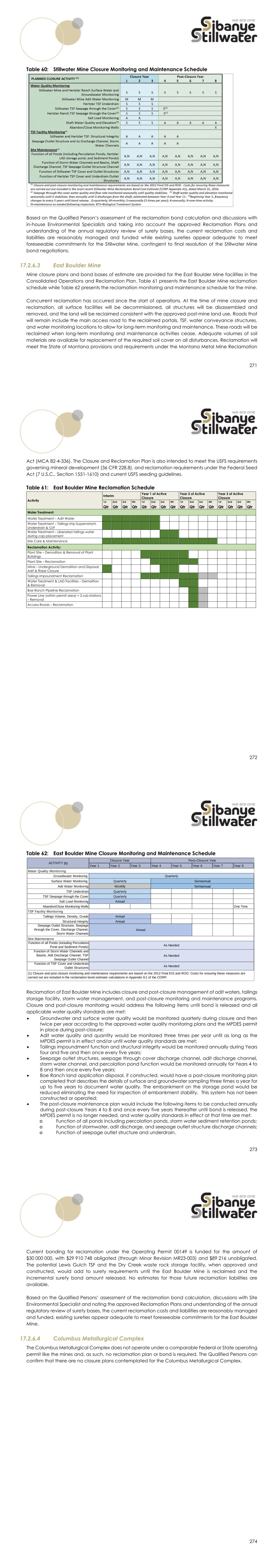 271 Table 60: Stillwater Mine Closure Monitoring and Maintenance Schedule Based on the Qualified Person’s assessment of the reclamation bond calculation and discussions with in-house Environmental Specialists and taking into account the approved Reclamation Plans and understanding of the annual regulatory review of surety bases, the current reclamation costs and liabilities are reasonably managed and funded while existing sureties appear adequate to meet foreseeable commitments for the Stillwater Mine, contingent to final resolution of the Stillwater Mine bond negotiations. 17.2.6.3 East Boulder Mine Mine closure plans and bond bases of estimate are provided for the East Boulder Mine facilities in the Consolidated Operations and Reclamation Plan. Table 61 presents the East Boulder Mine reclamation schedule while Table 62 presents the reclamation monitoring and maintenance schedule for the mine. Concurrent reclamation has occurred since the start of operations. At the time of mine closure and reclamation, all surface facilities will be decommissioned, all structures will be disassembled and removed, and the land will be reclaimed consistent with the approved post-mine land use. Roads that will remain include the main access road to the reclaimed portals, TSF, water conveyance structures, and water monitoring locations to allow for long-term monitoring and maintenance. These roads will be reclaimed when long-term monitoring and maintenance activities cease. Adequate volumes of soil materials are available for replacement of the required soil cover on all disturbances. Reclamation will meet the State of Montana provisions and requirements under the Montana Metal Mine Reclamation 272 Act (MCA 82-4-336). The Closure and Reclamation Plan is also intended to meet the USFS requirements governing mineral development (36 CFR 228.8), and reclamation requirements under the Federal Seed Act (7 U.S.C., Section 1551-1610) and current USFS seeding guidelines. Table 61: East Boulder Mine Reclamation Schedule Activity Interim Year 1 of Active Closure Year 2 of Active Closure Year 3 of Active Closure 1st Qtr 2nd Qtr 3rd Qtr 4th Qtr 1st Qtr 2nd Qtr 3rd Qtr 4th Qtr 1st Qtr 2nd Qtr 3rd Qtr 4th Qtr 1st Qtr 2nd Qtr 3rd Qtr 4th Qtr Water Treatment: Water Treatment – Adit Water Water Treatment – Tailings Imp Supernatant, Underdrain & O/F Water Treatment – Liberated tailings water during cap placement Site Care & Maintenance Reclamation Activity: Plant Site – Demolition & Removal of Plant Buildings ` Plant Site – Reclamation Mine – Underground Demolition and Disposal; Adit & Raise Closure Tailings Impoundment Reclamation Water Treatment & LAD Facilities – Demolition & Removal Boe Ranch Pipeline Reclamation Power Line (within permit area) + 2 sub-stations – Removal Access Roads – Reclamation 273 Table 62: East Boulder Mine Closure Monitoring and Maintenance Schedule Reclamation of East Boulder Mine includes closure and post-closure management of adit waters, tailings storage facility, storm water management, and post-closure monitoring and maintenance programs. Closure and post-closure monitoring would address the following items until bond is released and all applicable water quality standards are met:  Groundwater and surface water quality would be monitored quarterly during closure and then twice per year according to the approved water quality monitoring plans and the MPDES permit in place during post-closure;  Adit water quality and quantity would be monitored three times per year until as long as the MPDES permit is in effect and/or until water quality standards are met;  Tailings impoundment function and structural integrity would be monitored annually during Years four and five and then once every five years;  Seepage outlet structures, seepage through cover discharge channel, adit discharge channel, storm water channel, and percolation pond function would be monitored annually for Years 4 to 8 and then once every five years;  Boe Ranch land application disposal, if constructed, would have a post-closure monitoring plan completed that describes the details of surface and groundwater sampling three times a year for up to five years to document water quality. The embankment on the storage pond would be reduced eliminating the need for inspection of embankment stability. This system has not been constructed or operated;  The post-closure maintenance plan would include the following items to be conducted annually during post-closure Years 4 to 8 and once every five years thereafter until bond is released, the MPDES permit is no longer needed, and water quality standards in effect at that time are met: o Function of all ponds including percolation ponds, storm water sediment retention ponds; o Function of stormwater, adit discharge, and seepage outlet structure discharge channels; o Function of seepage outlet structure and underdrain. Year 1 Year 2 Year 3 Year 4 Year 5 Year 6 Year 7 Year 8 Groundwater Monitoring Surface Water Monitoring Adit Water Monitoring TSF Underdrain TSF Seepage through the Cover Salt Load Monitoring Abandon/Close Monitoring Wells One Time Tailings Volume, Density, Grade Structural Integrity Seepage Outlet Structure, Seepage through the Cover, Discharge Channel, Storm Water Channels Function of all Ponds (including Percolation Pond and Sediment Ponds) Function of Storm Water Channels and Basins, Adit Discharge Channel, TSF Seepage Outlet Channel Function of TSF Cover and Underdrain Outlet Structures Quarterly Quarterly Annual Closure Year ACTIVITY (1) Annual Annual (1) Closure and post‐closure monitoring and maintenance requirements are based on the 2012 Final EIS and ROD. Costs for ensuring these measures are carried out are included in the reclamation bond estimate calculations in Appendix G1 of the CORP. Post‐Closure Year Quarterly As Needed As Needed As Needed Site Maintenance Water Quality Monitoring Semiannual Monthly Semiannual Annual TSF Fa