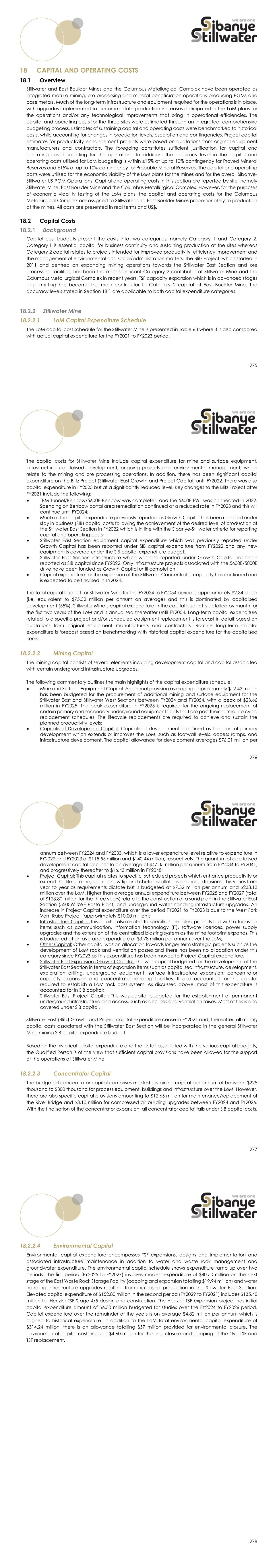275 CAPITAL AND OPERATING COSTS Overview Stillwater and East Boulder Mines and the Columbus Metallurgical Complex have been operated as integrated mature mining, ore processing and mineral beneficiation operations producing PGMs and base metals. Much of the long-term infrastructure and equipment required for the operations is in place, with upgrades implemented to accommodate production increases anticipated in the LoM plans for the operations and/or any technological improvements that bring in operational efficiencies. The capital and operating costs for the three sites were estimated through an integrated, comprehensive budgeting process. Estimates of sustaining capital and operating costs were benchmarked to historical costs, while accounting for changes in production levels, escalation and contingencies. Project capital estimates for productivity enhancement projects were based on quotations from original equipment manufacturers and contractors. The foregoing constitutes sufficient justification for capital and operating cost budgeting for the operations. In addition, the accuracy level in the capital and operating costs utilised for LoM budgeting is within ±15% at up to 10% contingency for Proved Mineral Reserves and ±15% at up to 10% contingency for Probable Mineral Reserves. The capital and operating costs were utilised for the economic viability of the LoM plans for the mines and for the overall Sibanye- Stillwater US PGM Operations. Capital and operating costs in this section are reported by site, namely Stillwater Mine, East Boulder Mine and the Columbus Metallurgical Complex. However, for the purposes of economic viability testing of the LoM plans, the capital and operating costs for the Columbus Metallurgical Complex are assigned to Stillwater and East Boulder Mines proportionately to production at the mines. All costs are presented in real terms and US$. Capital Costs Background Capital cost budgets present the costs into two categories, namely Category 1 and Category 2. Category 1 is essential capital for business continuity and sustaining production at the sites whereas Category 2 capital relates to projects intended for improved productivity, efficiency improvement and the management of environmental and social/administration matters. The Blitz Project, which started in 2011 and centred on expanding mining operations towards the Stillwater East Section and ore processing facilities, has been the most significant Category 2 contributor at Stillwater Mine and the Columbus Metallurgical Complex in recent years. TSF capacity expansion which is in advanced stages of permitting has become the main contributor to Category 2 capital at East Boulder Mine. The accuracy levels stated in Section 18.1 are applicable to both capital expenditure categories. Stillwater Mine 18.2.2.1 LoM Capital Expenditure Schedule The LoM capital cost schedule for the Stillwater Mine is presented in Table 63 where it is also compared with actual capital expenditure for the FY2021 to FY2023 period. 276 The capital costs for Stillwater Mine include capital expenditure for mine and surface equipment, infrastructure, capitalised development, ongoing projects and environmental management, which relate to the mining and ore processing operations. In addition, there has been significant capital expenditure on the Blitz Project (Stillwater East Growth and Project Capital) until FY2022. There was also capital expenditure in FY2023 but at a significantly reduced level. Key changes to the Blitz Project after FY2021 include the following:  TBM Tunnel/Benbow/5600E-Benbow was completed and the 5600E FWL was connected in 2022. Spending on Benbow portal area remediation continued at a reduced rate in FY2023 and this will continue until FY2024;  Much of the capital expenditure previously reported as Growth Capital has been reported under stay in business (SIB) capital costs following the achievement of the desired level of production at the Stillwater East Section in FY2022 which is in line with the Sibanye-Stillwater criteria for reporting capital and operating costs;  Stillwater East Section equipment capital expenditure which was previously reported under Growth Capital has been reported under SIB capital expenditure from FY2022 and any new equipment is covered under the SIB capital expenditure budget;  Stillwater East Section infrastructure which was also reported under Growth Capital has been reported as SIB capital since FY2022. Only infrastructure projects associated with the 5600E/5000E drive have been funded as Growth Capital until completion;  Capital expenditure for the expansion of the Stillwater Concentrator capacity has continued and is expected to be finalised in FY2024. The total capital budget for Stillwater Mine for the FY2024 to FY2054 period is approximately $2.34 billion (i.e. equivalent to $75.32 million per annum on average) and this is dominated by capitalised development (55%). Stillwater Mine’s capital expenditure in the capital budget is detailed by month for the first two years of the LoM and is annualised thereafter until FY2054. Long-term capital expenditure related to a specific project and/or scheduled equipment replacement is forecast in detail based on quotations from original equipment manufacturers and contractors. Routine long-term capital expenditure is forecast based on benchmarking with historical capital expenditure for the capitalised items. 18.2.2.2 Mining Capital The mining capital consists of several elements including development capital and capital associated with certain underground infrastructure upgrades. The following commentary outlines the main highlights of the capital expenditure schedule:  Mine and Surface Equipment Capital: An annual provision averaging approximately $12.42 million has been budgeted for the procurement of additional mining and surface equipment for the Stillwater East and Stillwater West Sections between FY2024 and FY2054, wi