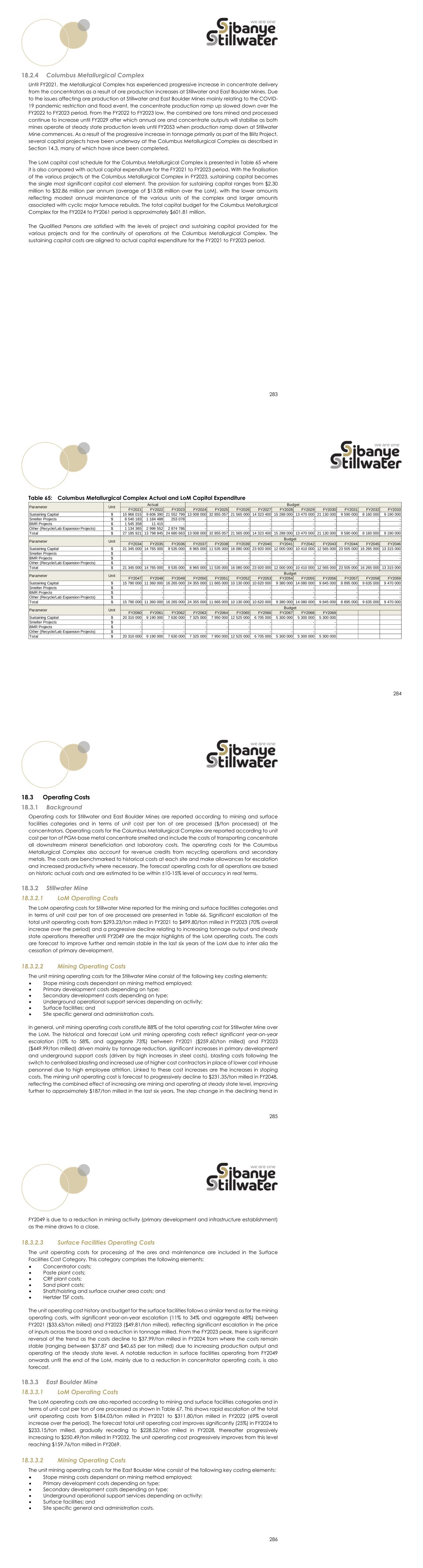 283 Columbus Metallurgical Complex Until FY2021, the Metallurgical Complex has experienced progressive increase in concentrate delivery from the concentrators as a result of ore production increases at Stillwater and East Boulder Mines. Due to the issues affecting ore production at Stillwater and East Boulder Mines mainly relating to the COVID- 19 pandemic restriction and flood event, the concentrate production ramp up slowed down over the FY2022 to FY2023 period. From the FY2022 to FY2023 low, the combined ore tons mined and processed continue to increase until FY2029 after which annual ore and concentrate outputs will stabilise as both mines operate at steady state production levels until FY2053 when production ramp down at Stillwater Mine commences. As a result of the progressive increase in tonnage primarily as part of the Blitz Project, several capital projects have been underway at the Columbus Metallurgical Complex as described in Section 14.3, many of which have since been completed. The LoM capital cost schedule for the Columbus Metallurgical Complex is presented in Table 65 where it is also compared with actual capital expenditure for the FY2021 to FY2023 period. With the finalisation of the various projects at the Columbus Metallurgical Complex in FY2023, sustaining capital becomes the single most significant capital cost element. The provision for sustaining capital ranges from $2.30 million to $32.86 million per annum (average of $13.08 million over the LoM), with the lower amounts reflecting modest annual maintenance of the various units of the complex and larger amounts associated with cyclic major furnace rebuilds. The total capital budget for the Columbus Metallurgical Complex for the FY2024 to FY2061 period is approximately $601.81 million. The Qualified Persons are satisfied with the levels of project and sustaining capital provided for the various projects and for the continuity of operations at the Columbus Metallurgical Complex. The sustaining capital costs are aligned to actual capital expenditure for the FY2021 to FY2023 period. 284 Table 65: Columbus Metallurgical Complex Actual and LoM Capital Expenditure FY2021 FY2022 FY2023 FY2024 FY2025 FY2026 FY2027 FY2028 FY2029 FY2030 FY2031 FY2032 FY2033 Sustaining Capital $ 15 966 015 9 606 390 21 552 799 13 008 000 32 855 057 21 565 000 14 323 400 15 288 000 13 470 000 21 130 000 9 590 000 8 160 000 9 190 000 Smelter Projects $ 8 540 183 1 184 488 253 078 - - - - - - - - - - BMR Projects $ 1 545 358 11 415 - - - - - - - - - - - Other (Recycle/Lab Expansion Projects) $ 1 134 365 2 996 552 2 874 786 - - - - - - - - - - Total $ 27 185 921 13 798 845 24 680 663 13 008 000 32 855 057 21 565 000 14 323 400 15 288 000 13 470 000 21 130 000 9 590 000 8 160 000 9 190 000 FY2034 FY2035 FY2036 FY2037 FY2038 FY2039 FY2040 FY2041 FY2042 FY2043 FY2044 FY2045 FY2046 Sustaining Capital $ 21 345 000 14 765 000 9 535 000 8 965 000 11 535 000 16 080 000 23 920 000 12 000 000 10 410 000 12 565 000 23 505 000 16 265 000 13 315 000 Smelter Projects $ - - - - - - - - - - - - - BMR Projects $ - - - - - - - - - - - - - Other (Recycle/Lab Expansion Projects) $ - - - - - - - - - - - - - Total $ 21 345 000 14 765 000 9 535 000 8 965 000 11 535 000 16 080 000 23 920 000 12 000 000 10 410 000 12 565 000 23 505 000 16 265 000 13 315 000 FY2047 FY2048 FY2049 FY2050 FY2051 FY2052 FY2053 FY2054 FY2055 FY2056 FY2057 FY2058 FY2059 Sustaining Capital $ 15 790 000 11 360 000 16 265 000 24 355 000 11 665 000 10 130 000 10 620 000 9 380 000 14 080 000 9 845 000 8 895 000 9 635 000 9 470 000 Smelter Projects $ - - - - - - - - - - - - - BMR Projects $ - - - - - - - - - - - - - Other (Recycle/Lab Expansion Projects) $ - - - - - - - - - - - - - Total $ 15 790 000 11 360 000 16 265 000 24 355 000 11 665 000 10 130 000 10 620 000 9 380 000 14 080 000 9 845 000 8 895 000 9 635 000 9 470 000 FY2060 FY2061 FY2062 FY2063 FY2064 FY2065 FY2066 FY2067 FY2068 FY2069 Sustaining Capital $ 20 310 000 9 190 000 7 630 000 7 325 000 7 950 000 12 525 000 6 705 000 5 300 000 5 300 000 5 300 000 Smelter Projects $ - - - - - - - - - - BMR Projects $ - - - - - - - - - - Other (Recycle/Lab Expansion Projects) $ - - - - - - - - - - Total $ 20 310 000 9 190 000 7 630 000 7 325 000 7 950 000 12 525 000 6 705 000 5 300 000 5 300 000 5 300 000 Parameter Unit Budget Budget Budget Budget Unit Parameter Actual Parameter Parameter Unit Unit 285 Operating Costs Background Operating costs for Stillwater and East Boulder Mines are reported according to mining and surface facilities categories and in terms of unit cost per ton of ore processed ($/ton processed) at the concentrators. Operating costs for the Columbus Metallurgical Complex are reported according to unit cost per ton of PGM-base metal concentrate smelted and include the costs of transporting concentrate all downstream mineral beneficiation and laboratory costs. The operating costs for the Columbus Metallurgical Complex also account for revenue credits from recycling operations and secondary metals. The costs are benchmarked to historical costs at each site and make allowances for escalation and increased productivity where necessary. The forecast operating costs for all operations are based on historic actual costs and are estimated to be within ±10-15% level of accuracy in real terms. Stillwater Mine 18.3.2.1 LoM Operating Costs The LoM operating costs for Stillwater Mine reported for the mining and surface facilities categories and in terms of unit cost per ton of ore processed are presented in Table 66. Significant escalation of the total unit operating costs from $293.23/ton milled in FY2021 to $499.80/ton milled in FY2023 (70% overall increase over the period) and a progressive decline relating to increasing tonnage output and steady state operations thereafter until FY2049 are the major highlights of the LoM operating costs. The costs are forecast to improve further and remain stable in the last six years of the LoM due to inte