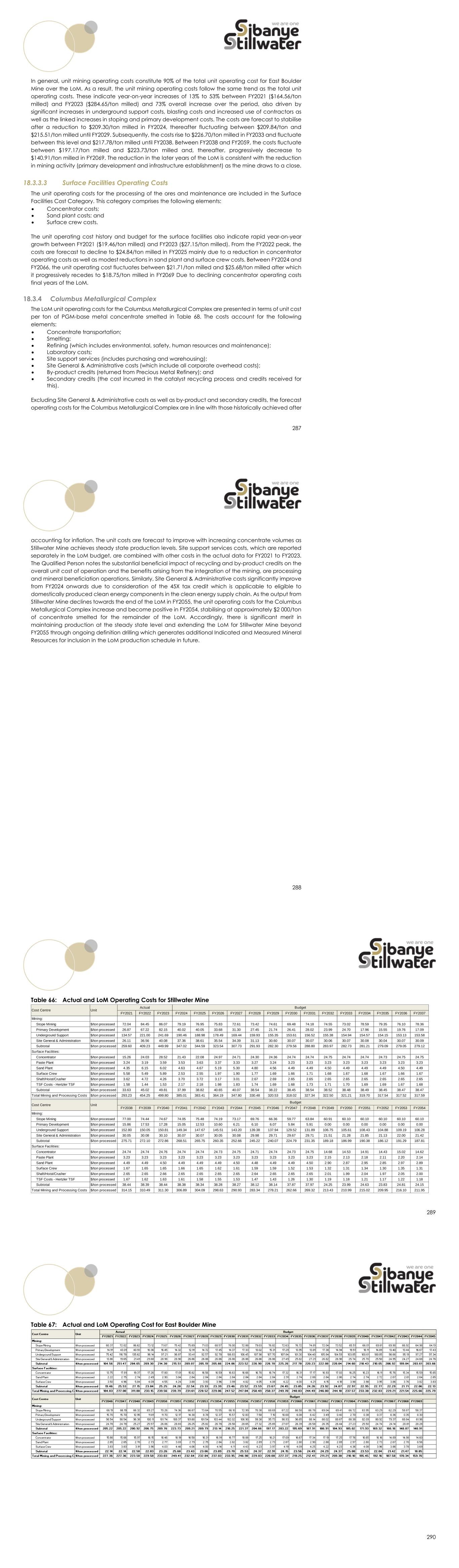 287 In general, unit mining operating costs constitute 90% of the total unit operating cost for East Boulder Mine over the LoM. As a result, the unit mining operating costs follow the same trend as the total unit operating costs. These indicate year-on-year increases of 13% to 53% between FY2021 ($164.56/ton milled) and FY2023 ($284.65/ton milled) and 73% overall increase over the period, also driven by significant increases in underground support costs, blasting costs and increased use of contractors as well as the linked increases in stoping and primary development costs. The costs are forecast to stabilise after a reduction to $209.30/ton milled in FY2024, thereafter fluctuating between $209.84/ton and $215.51/ton milled until FY2029. Subsequently, the costs rise to $226.70/ton milled in FY2033 and fluctuate between this level and $217.78/ton milled until FY2038. Between FY2038 and FY2059, the costs fluctuate between $197.17/ton milled and $223.73/ton milled and, thereafter, progressively decrease to $140.91/ton milled in FY2069. The reduction in the later years of the LoM is consistent with the reduction in mining activity (primary development and infrastructure establishment) as the mine draws to a close. 18.3.3.3 Surface Facilities Operating Costs The unit operating costs for the processing of the ores and maintenance are included in the Surface Facilities Cost Category. This category comprises the following elements:  Concentrator costs;  Sand plant costs; and  Surface crew costs. The unit operating cost history and budget for the surface facilities also indicate rapid year-on-year growth between FY2021 ($19.46/ton milled) and FY2023 ($27.15/ton milled). From the FY2022 peak, the costs are forecast to decline to $24.84/ton milled in FY2025 mainly due to a reduction in concentrator operating costs as well as modest reductions in sand plant and surface crew costs. Between FY2024 and FY2066, the unit operating cost fluctuates between $21.71/ton milled and $25.68/ton milled after which it progressively recedes to $18.75/ton milled in FY2069 Due to declining concentrator operating costs final years of the LoM. Columbus Metallurgical Complex The LoM unit operating costs for the Columbus Metallurgical Complex are presented in terms of unit cost per ton of PGM-base metal concentrate smelted in Table 68. The costs account for the following elements:  Concentrate transportation;  Smelting;  Refining (which includes environmental, safety, human resources and maintenance);  Laboratory costs;  Site support services (includes purchasing and warehousing);  Site General & Administrative costs (which include all corporate overhead costs);  By-product credits (returned from Precious Metal Refinery); and  Secondary credits (the cost incurred in the catalyst recycling process and credits received for this). Excluding Site General & Administrative costs as well as by-product and secondary credits, the forecast operating costs for the Columbus Metallurgical Complex are in line with those historically achieved after 288 accounting for inflation. The unit costs are forecast to improve with increasing concentrate volumes as Stillwater Mine achieves steady state production levels. Site support services costs, which are reported separately in the LoM budget, are combined with other costs in the actual data for FY2021 to FY2023. The Qualified Person notes the substantial beneficial impact of recycling and by-product credits on the overall unit cost of operation and the benefits arising from the integration of the mining, ore processing and mineral beneficiation operations. Similarly, Site General & Administrative costs significantly improve from FY2024 onwards due to consideration of the 45X tax credit which is applicable to eligible to domestically produced clean energy components in the clean energy supply chain. As the output from Stillwater Mine declines towards the end of the LoM in FY2055, the unit operating costs for the Columbus Metallurgical Complex increase and become positive in FY2054, stabilising at approximately $2 000/ton of concentrate smelted for the remainder of the LoM. Accordingly, there is significant merit in maintaining production at the steady state level and extending the LoM for Stillwater Mine beyond FY2055 through ongoing definition drilling which generates additional Indicated and Measured Mineral Resources for inclusion in the LoM production schedule in future. 289 Table 66: Actual and LoM Operating Costs for Stillwater Mine FY2021 FY2022 FY2023 FY2024 FY2025 FY2026 FY2027 FY2028 FY2029 FY2030 FY2031 FY2032 FY2033 FY2034 FY2035 FY2036 FY2037 Mining: Stope Mining $/ton processed 72.04 84.45 86.07 79.19 76.95 75.83 72.61 73.42 74.61 69.48 74.18 74.55 73.02 78.59 79.35 76.10 78.36 Primary Development $/ton processed 26.87 67.22 82.15 40.02 40.05 33.68 31.30 27.45 21.74 26.41 28.02 23.99 24.70 17.96 15.55 19.76 17.09 Underground Support $/ton processed 134.57 221.00 241.69 190.46 188.98 178.49 169.44 159.93 155.35 153.61 156.52 155.38 154.94 154.57 154.15 153.13 153.58 Site General & Administration $/ton processed 26.11 36.56 40.08 37.36 38.61 35.54 34.39 31.13 30.60 30.07 30.07 30.06 30.07 30.08 30.04 30.07 30.09 Subtotal $/ton processed 259.60 409.23 449.99 347.02 344.59 323.54 307.73 291.93 282.30 279.56 288.80 283.97 282.73 281.21 279.09 279.05 279.12 Surface Facilities: Concentrator $/ton processed 15.26 24.03 28.52 21.43 22.08 24.97 24.71 24.30 24.36 24.74 24.74 24.75 24.74 24.74 24.73 24.75 24.75 Paste Plant $/ton processed 3.24 3.19 3.59 3.53 3.63 3.37 3.33 3.27 3.24 3.23 3.23 3.23 3.23 3.23 3.23 3.23 3.23 Sand Plant $/ton processed 4.35 6.15 6.02 4.63 4.67 5.19 5.30 4.80 4.56 4.49 4.49 4.50 4.49 4.49 4.49 4.50 4.49 Surface Crew $/ton processed 5.58 5.49 5.89 2.53 2.55 1.97 1.90 1.77 1.69 1.66 1.71 1.68 1.67 1.68 1.67 1.66 1.67 Shaft/Hoist/Crusher $/ton processed 3.62 4.72 4.26 3.70 3.72 3.17 3.01 2.67 2.69 2.65 2.65 2.65 2.65 2.65 2.65 2.65 