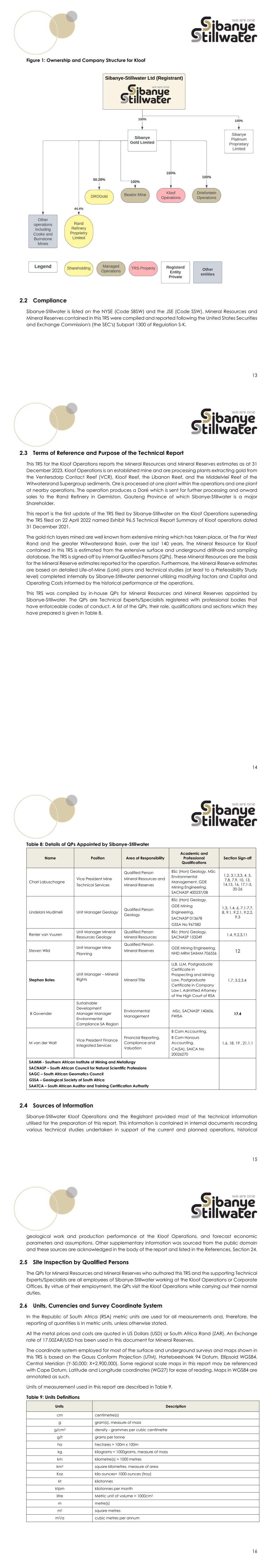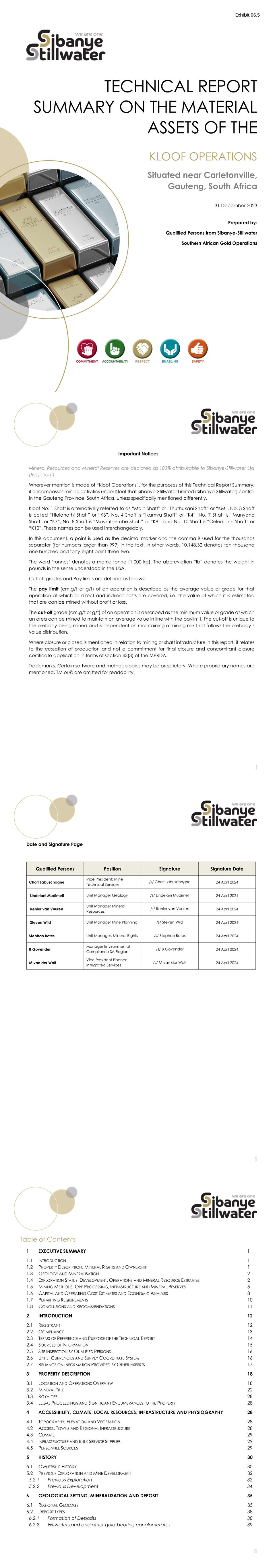 13 Figure 1: Ownership and Company Structure for Kloof 2.2 Compliance Sibanye-Stillwater is listed on the NYSE (Code SBSW) and the JSE (Code SSW). Mineral Resources and Mineral Reserves contained in this TRS were compiled and reported following the United States Securities and Exchange Commission's (the SEC's) Subpart 1300 of Regulation S-K. 14 2.3 Terms of Reference and Purpose of the Technical Report This TRS for the Kloof Operations reports the Mineral Resources and Mineral Reserves estimates as at 31 December 2023. Kloof Operations is an established mine and ore processing plants extracting gold from the Ventersdorp Contact Reef (VCR), Kloof Reef, the Libanon Reef, and the Middelvlei Reef of the Witwatersrand Supergroup sediments. Ore is processed at one plant within the operations and one plant at nearby operations. The operation produces a Doré which is sent for further processing and onward sales to the Rand Refinery in Germiston, Gauteng Province of which Sibanye-Stillwater is a major Shareholder. This report is the first update of the TRS filed by Sibanye-Stillwater on the Kloof Operations superseding the TRS filed on 22 April 2022 named Exhibit 96.5 Technical Report Summary of Kloof operations dated 31 December 2021. The gold rich layers mined are well known from extensive mining which has taken place, at The Far West Rand and the greater Witwatersrand Basin, over the last 140 years. The Mineral Resource for Kloof contained in this TRS is estimated from the extensive surface and underground drillhole and sampling database. The TRS is signed-off by internal Qualified Persons (QPs). These Mineral Resources are the basis for the Mineral Reserve estimates reported for the operation. Furthermore, the Mineral Reserve estimates are based on detailed Life-of-Mine (LoM) plans and technical studies (at least to a Prefeasibility Study level) completed internally by Sibanye-Stillwater personnel utilizing modifying factors and Capital and Operating Costs informed by the historical performance at the operations. This TRS was compiled by in-house QPs for Mineral Resources and Mineral Reserves appointed by Sibanye-Stillwater. The QPs are Technical Experts/Specialists registered with professional bodies that have enforceable codes of conduct. A list of the QPs, their role, qualifications and sections which they have prepared is given in Table 8. 15 Table 8: Details of QPs Appointed by Sibanye-Stillwater Name Position Area of Responsibility Academic and Professional Qualifications Section Sign-off Charl Labuschagne Vice President Mine Technical Services Qualified Person Mineral Resources and Mineral Reserves BSc (Hon) Geology, MSc Environmental Management, GDE Mining Engineering, SACNASP 400237/08 1,2, 3.1,3.3, 4, 5, 7.8, 7.9, 10, 13, 14,15, 16, 17.1-3, 20-26 Lindelani Mudimeli Unit Manager Geology Qualified Person Geology BSc (Hon) Geology, GDE Mining Engineering. SACNASP 013678 GSSA No 967582 1.3, 1.4, 6, 7.1-7.7, 8, 9.1, 9.2.1, 9.2.2, 9.3 Renier van Vuuren Unit Manager Mineral Resources Geology Qualified Person Mineral Resources BSc (Hon) Geology, SACNASP 153249 1.4, 9.2.3,11 Steven Wild Unit Manager Mine Planning Qualified Person Mineral Reserves GDE Mining Engineering, NHD MRM SAIMM 706556 12 Stephan Botes Unit Manager – Mineral Rights Mineral Title LLB, LLM, Postgraduate Certificate in Prospecting and Mining Law, Postgraduate Certificate in Company Law I, Admitted Attorney of the High Court of RSA 1.7, 3.2,3.4 B Govender Sustainable Development Manager Manager Environmental Compliance SA Region Environmental Management MSc, SACNASP 140606, FWISA 17.4 M van der Walt Vice President Finance Integrated Services Financial Reporting, Compliance and Valuation B Com Accounting, B Com Honours Accounting, CA(SA), SAICA No 20026270 1.6, 18, 19 , 21.1.1 SAIMM - Southern African Institute of Mining and Metallurgy SACNASP – South African Council for Natural Scientific Professions SAGC – South African Geomatics Council GSSA – Geological Society of South Africa SAATCA – South African Auditor and Training Certification Authority 2.4 Sources of Information Sibanye-Stillwater Kloof Operations and the Registrant provided most of the technical information utilised for the preparation of this report. This information is contained in internal documents recording various technical studies undertaken in support of the current and planned operations, historical 16 geological work and production performance at the Kloof Operations, and forecast economic parameters and assumptions. Other supplementary information was sourced from the public domain and these sources are acknowledged in the body of the report and listed in the References, Section 24. 2.5 Site Inspection by Qualified Persons The QPs for Mineral Resources and Mineral Reserves who authored this TRS and the supporting Technical Experts/Specialists are all employees of Sibanye-Stillwater working at the Kloof Operations or Corporate Offices. By virtue of their employment, the QPs visit the Kloof Operations while carrying out their normal duties. 2.6 Units, Currencies and Survey Coordinate System In the Republic of South Africa (RSA) metric units are used for all measurements and, therefore, the reporting of quantities is in metric units, unless otherwise stated. All the metal prices and costs are quoted in US Dollars (USD) or South Africa Rand (ZAR). An Exchange rate of 17.00ZAR/USD has been used in this document for Mineral Reserves. The coordinate system employed for most of the surface and underground surveys and maps shown in this TRS is based on the Gauss Conform Projection (UTM), Hartebeeshoek 94 Datum, Ellipsoid WGS84, Central Meridian (Y-50,000; X+2,900,000). Some regional scale maps in this report may be referenced with Cape Datum, Latitude and Longitude coordinates (WG27) for ease of reading. Maps in WGS84 are annotated as such. Units of measurement used in this report are described in Table 9. Table 9: Units Definitions Units Descriptio