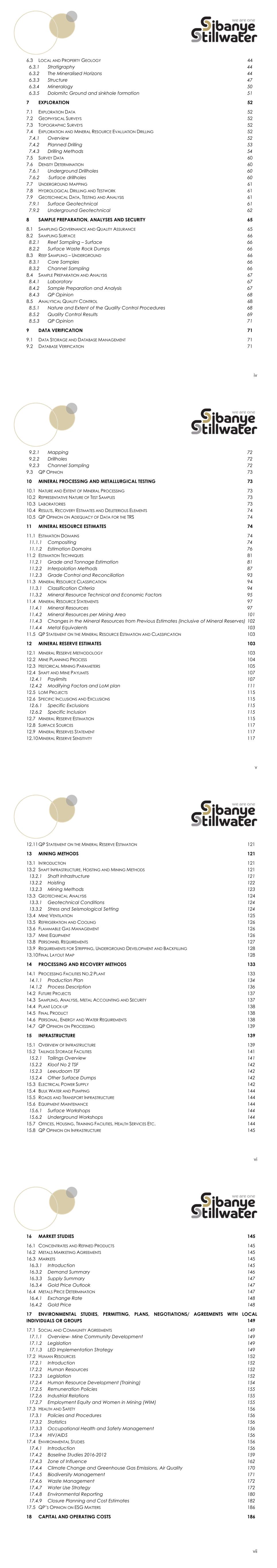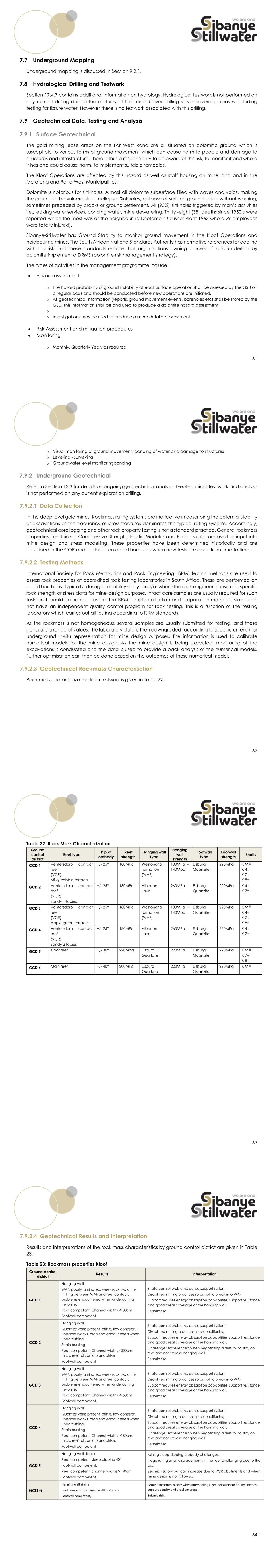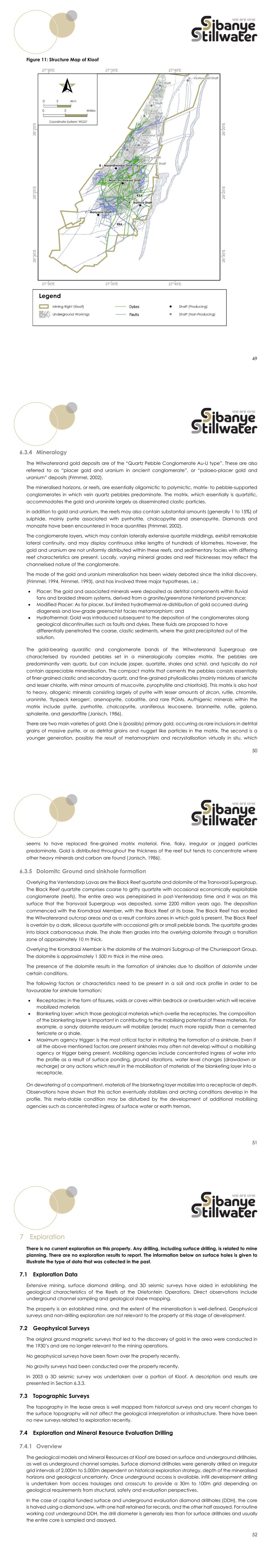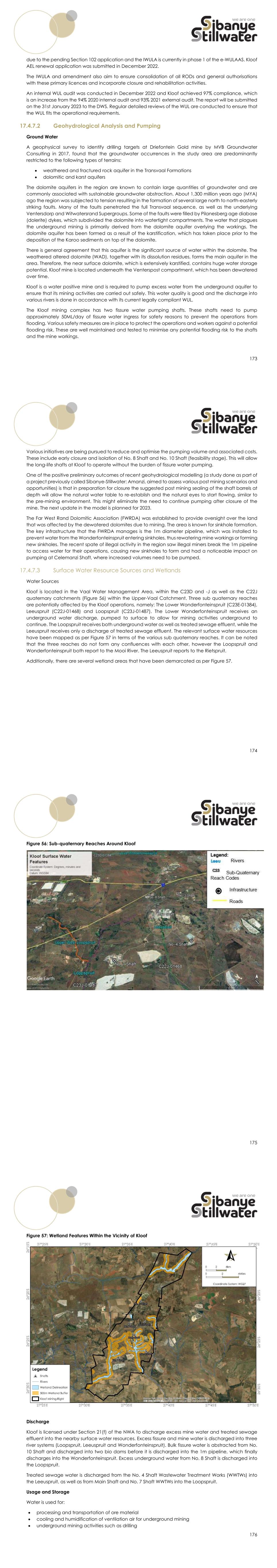 173 due to the pending Section 102 application and the IWULA is currently in phase 1 of the e-WULAAS. Kloof AEL renewal application was submitted in December 2022. The IWULA and amendment also aim to ensure consolidation of all RODs and general authorisations with these primary licences and incorporate closure and rehabilitation activities. An internal WUL audit was conducted in December 2022 and Kloof achieved 97% compliance, which is an increase from the 94% 2020 internal audit and 93% 2021 external audit. The report will be submitted on the 31st January 2023 to the DWS. Regular detailed reviews of the WUL are conducted to ensure that the WUL fits the operational requirements. 17.4.7.2 Geohydrological Analysis and Pumping Ground Water A geophysical survey to identify drilling targets at Driefontein Gold mine by MVB Groundwater Consulting in 2017, found that the groundwater occurrences in the study area are predominantly restricted to the following types of terrains:  weathered and fractured rock aquifer in the Transvaal Formations  dolomitic and karst aquifers The dolomite aquifers in the region are known to contain large quantities of groundwater and are commonly associated with sustainable groundwater abstraction. About 1,300 million years ago (MYA) ago the region was subjected to tension resulting in the formation of several large north to north-easterly striking faults. Many of the faults penetrated the full Transvaal sequence, as well as the underlying Ventersdorp and Witwatersrand Supergroups. Some of the faults were filled by Pilanesberg age diabase (dolerite) dykes, which subdivided the dolomite into watertight compartments. The water that plagues the underground mining is primarily derived from the dolomite aquifer overlying the workings. The dolomite aquifer has been formed as a result of the karstification, which has taken place prior to the deposition of the Karoo sediments on top of the dolomite. There is general agreement that this aquifer is the significant source of water within the dolomite. The weathered altered dolomite (WAD), together with its dissolution residues, forms the main aquifer in the area. Therefore, the near surface dolomite, which is extensively karstified, contains huge water storage potential. Kloof mine is located underneath the Venterspost compartment, which has been dewatered over time. Kloof is a water positive mine and is required to pump excess water from the underground aquifer to ensure that its mining activities are carried out safely. This water quality is good and the discharge into various rivers is done in accordance with its current legally compliant WUL. The Kloof mining complex has two fissure water pumping shafts. These shafts need to pump approximately 50ML/day of fissure water ingress for safety reasons to prevent the operations from flooding. Various safety measures are in place to protect the operations and workers against a potential flooding risk. These are well maintained and tested to minimise any potential flooding risk to the shafts and the mine workings. 174 Various initiatives are being pursued to reduce and optimise the pumping volume and associated costs. These include early closure and isolation of No. 8 Shaft and No. 10 Shaft (feasibility stage). This will allow the long-life shafts at Kloof to operate without the burden of fissure water pumping. One of the positive preliminary outcomes of recent geohydrological modelling (a study done as part of a project previously called Sibanye-Stillwater: Amanzi, aimed to assess various post mining scenarios and opportunities) is that in preparation for closure the suggested post mining sealing of the shaft barrels at depth will allow the natural water table to re-establish and the natural eyes to start flowing, similar to the pre-mining environment. This might eliminate the need to continue pumping after closure of the mine. The next update in the model is planned for 2023. The Far West Rand Dolomitic Association (FWRDA) was established to provide oversight over the land that was affected by the dewatered dolomites due to mining. The area is known for sinkhole formation. The key infrastructure that the FWRDA manages is the 1m diameter pipeline, which was installed to prevent water from the Wonderfonteinspruit entering sinkholes, thus rewatering mine workings or forming new sinkholes. The recent spate of illegal activity in the region saw illegal miners break the 1m pipeline to access water for their operations, causing new sinkholes to form and had a noticeable impact on pumping at Celemanzi Shaft, where increased volumes need to be pumped. 17.4.7.3 Surface Water Resource Sources and Wetlands Water Sources Kloof is located in the Vaal Water Management Area, within the C23D and -J as well as the C22J quaternary catchments (Figure 56) within the Upper-Vaal Catchment. Three sub quaternary reaches are potentially affected by the Kloof operations, namely: The Lower Wonderfonteinspruit (C23E-01384), Leeuspruit (C22J-01468) and Loopspruit (C23J-01487). The Lower Wonderfonteinspruit receives an underground water discharge, pumped to surface to allow for mining activities underground to continue. The Loopspruit receives both underground water as well as treated sewage effluent, while the Leeuspruit receives only a discharge of treated sewage effluent. The relevant surface water resources have been mapped as per Figure 57 in terms of the various sub quaternary reaches. It can be noted that the three reaches do not form any confluences with each other, however the Loopspruit and Wonderfonteinspruit both report to the Mooi River. The Leeuspruit reports to the Rietspruit. Additionally, there are several wetland areas that have been demarcated as per Figure 57. 175 Figure 56: Sub-quaternary Reaches Around Kloof 176 Figure 57: Wetland Features Within the Vicinity of Kloof Discharge Kloof is licensed under Section 21(f) of the NWA to discharge excess mine water and treated sewage effluent 