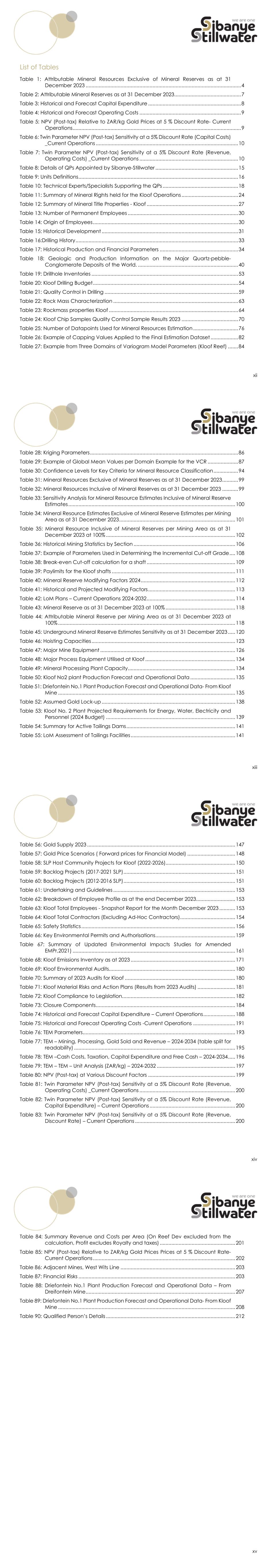 xii List of Tables Table 1: Attributable Mineral Resources Exclusive of Mineral Reserves as at 31 December 2023 ........................................................................................................... 4 Table 2: Attributable Mineral Reserves as at 31 December 2023 .............................................. 7 Table 3: Historical and Forecast Capital Expenditure ................................................................ 8 Table 4: Historical and Forecast Operating Costs ...................................................................... 9 Table 5: NPV (Post-tax) Relative to ZAR/kg Gold Prices at 5 % Discount Rate- Current Operations .................................................................................................................... 9 Table 6: Twin Parameter NPV (Post-tax) Sensitivity at a 5% Discount Rate (Capital Costs) _Current Operations .................................................................................................. 10 Table 7: Twin Parameter NPV (Post-tax) Sensitivity at a 5% Discount Rate (Revenue, Operating Costs) _Current Operations .................................................................... 10 Table 8: Details of QPs Appointed by Sibanye-Stillwater ......................................................... 15 Table 9: Units Definitions .............................................................................................................. 16 Table 10: Technical Experts/Specialists Supporting the QPs .................................................... 18 Table 11: Summary of Mineral Rights held for the Kloof Operations ....................................... 24 Table 12: Summary of Mineral Title Properties - Kloof ............................................................... 27 Table 13: Number of Permanent Employees ............................................................................ 30 Table 14: Origin of Employees .................................................................................................... 30 Table 15: Historical Development .............................................................................................. 31 Table 16:Drilling History ................................................................................................................ 33 Table 17: Historical Production and Financial Parameters ...................................................... 34 Table 18: Geologic and Production Information on the Major Quartz-pebble- Conglomerate Deposits of the World. ..................................................................... 40 Table 19: Drillhole Inventories ..................................................................................................... 53 Table 20: Kloof Drilling Budget .................................................................................................... 54 Table 21: Quality Control in Drilling ............................................................................................ 59 Table 22: Rock Mass Characterization ...................................................................................... 63 Table 23: Rockmass properties Kloof ......................................................................................... 64 Table 24: Kloof Chip Samples Quality Control Sample Results 2023 ....................................... 70 Table 25: Number of Datapoints Used for Mineral Resources Estimation ............................... 76 Table 26: Example of Capping Values Applied to the Final Estimation Dataset ................... 82 Table 27: Example from Three Domains of Variogram Model Parameters (Kloof Reef) ....... 84 xiii Table 28: Kriging Parameters ...................................................................................................... 86 Table 29: Example of Global Mean Values per Domain Example for the VCR ..................... 87 Table 30: Confidence Levels for Key Criteria for Mineral Resource Classification ................. 94 Table 31: Mineral Resources Exclusive of Mineral Reserves as at 31 December 2023 ........... 99 Table 32: Mineral Resources Inclusive of Mineral Reserves as at 31 December 2023 ........... 99 Table 33: Sensitivity Analysis for Mineral Resource Estimates Inclusive of Mineral Reserve Estimates ................................................................................................................... 100 Table 34: Mineral Resource Estimates Exclusive of Mineral Reserve Estimates per Mining Area as at 31 December 2023 ................................................................................ 101 Table 35: Mineral Resource Inclusive of Mineral Reserves per Mining Area as at 31 December 2023 at 100% ......................................................................................... 102 Table 36: Historical Mining Statistics by Section ...................................................................... 106 Table 37: Example of Parameters Used in Determining the Incremental Cut-off Grade .... 108 Table 38: Break-even Cut-off calculation for a shaft ............................................................. 109 Table 39: Paylimits for the Kloof shafts ..................................................................................... 111 Table 40: Mineral Reserve Modifying Factors 2024 ................................................................. 112 Table 41: Historical and Projected Modifying Factors ............................................................ 113 Table 42: LoM Plans – Current Operations 2024-2032 ............................................................. 114 Table 43: Mineral Reserve as at 31 December 2023 at 100% ................................................ 118 Table 44: Attributable Mineral Reserve per Mining Area as at 31 December 2023 at 100% .......................................................................................................................... 118 Table 45: Undergroun
