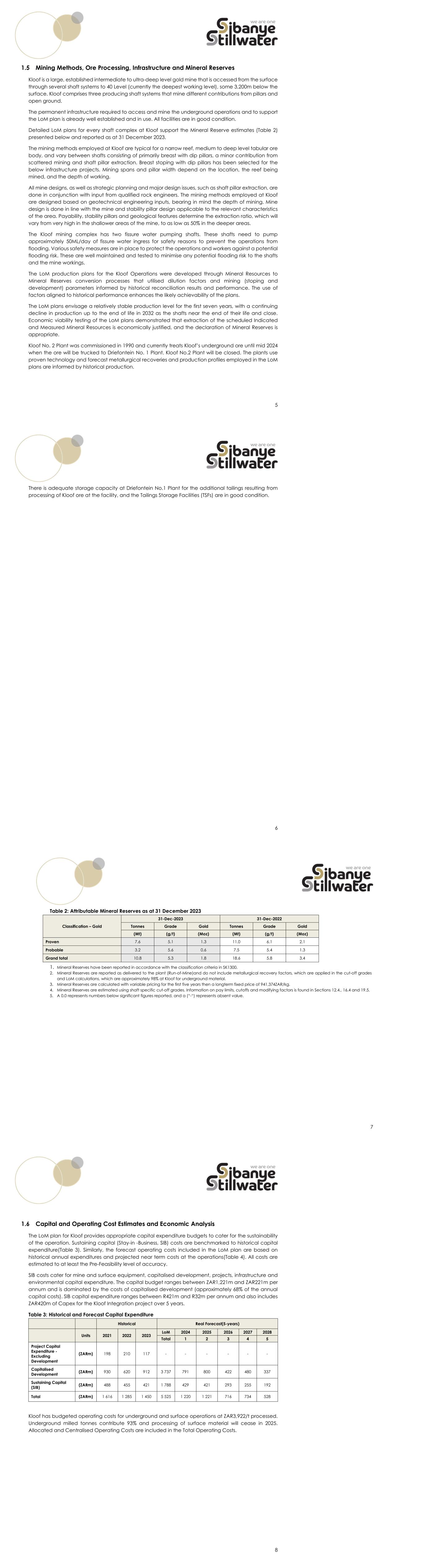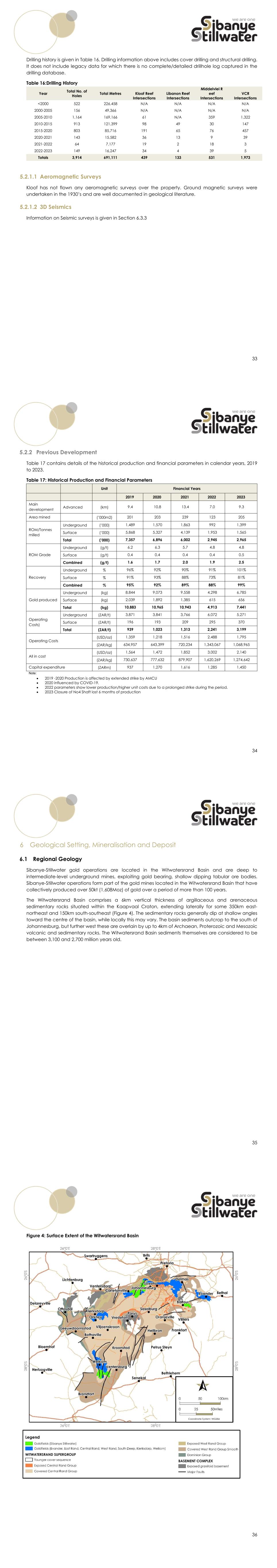 33 Drilling history is given in Table 16. Drilling information above includes cover drilling and structural drilling. It does not include legacy data for which there is no complete/detailed drillhole log captured in the drilling database. Table 16:Drilling History Year Total No. of Holes Total Metres Kloof Reef Intersections Libanon Reef Intersections Middelvlei R eef Intersections VCR Intersections <2000 522 226,458 N/A N/A N/A N/A 2000-2005 156 49,366 N/A N/A N/A N/A 2005-2010 1,164 169,166 61 N/A 359 1,322 2010-2015 913 121,399 98 49 30 147 2015-2020 803 85,716 191 65 76 457 2020-2021 143 15,582 36 13 9 39 2021-2022 64 7,177 19 2 18 3 2022-2023 149 16,247 34 4 39 5 Totals 3,914 691,111 439 133 531 1,973 5.2.1.1 Aeromagnetic Surveys Kloof has not flown any aeromagnetic surveys over the property. Ground magnetic surveys were undertaken in the 1930’s and are well documented in geological literature. 5.2.1.2 3D Seismics Information on Seismic surveys is given in Section 6.3.3 34 5.2.2 Previous Development Table 17 contains details of the historical production and financial parameters in calendar years, 2019 to 2023. Table 17: Historical Production and Financial Parameters Unit Financial Years 2019 2020 2021 2022 2023 Main development Advanced (km) 9.4 10.8 13.4 7.0 9.3 Area mined (’000m2) 201 203 239 123 205 ROM/Tonnes milled Underground (’000) 1,489 1,570 1,863 992 1,399 Surface (’000) 5,868 5,327 4,139 1,953 1,565 Total (’000) 7,357 6,896 6,002 2,945 2,965 ROM Grade Underground (g/t) 6.2 6.3 5.7 4.8 4.8 Surface (g/t) 0.4 0.4 0.4 0.4 0.5 Combined (g/t) 1.6 1.7 2.0 1.9 2.5 Recovery Underground % 96% 92% 90% 91% 101% Surface % 91% 93% 88% 73% 81% Combined % 95% 92% 89% 88% 99% Gold produced Underground (kg) 8,844 9,073 9,558 4,298 6,785 Surface (kg) 2,039 1,892 1,385 615 656 Total (kg) 10,883 10,965 10,943 4,913 7,441 Operating Costs) Underground (ZAR/t) 3,871 3,841 3,766 6,072 5,271 Surface (ZAR/t) 196 193 209 295 370 Total (ZAR/t) 939 1,023 1,313 2,241 3,199 Operating Costs (USD/oz) 1,359 1,218 1,516 2,488 1,795 (ZAR/kg) 634,957 643,399 720,234 1,343,067 1,068,965 All in cost (USD/oz) 1,564 1,472 1,852 3,002 2,140 (ZAR/kg) 730,637 777,632 879,907 1,620,269 1,274,642 Capital expenditure (ZARm) 937 1,270 1,616 1,285 1,450 Note:  2019 -2020 Production is affected by extended strike by AMCU  2020 influenced by COVID-19.  2022 parameters show lower production/higher unit costs due to a prolonged strike during the period.  2023 Closure of No4 Shaft lost 6 months of production 35 6 Geological Setting, Mineralisation and Deposit 6.1 Regional Geology Sibanye-Stillwater gold operations are located in the Witwatersrand Basin and are deep to intermediate-level underground mines, exploiting gold bearing, shallow dipping tabular ore bodies. Sibanye-Stillwater operations form part of the gold mines located in the Witwatersrand Basin that have collectively produced over 50kt (1,608Moz) of gold over a period of more than 100 years. The Witwatersrand Basin comprises a 6km vertical thickness of argillaceous and arenaceous sedimentary rocks situated within the Kaapvaal Craton, extending laterally for some 350km east- northeast and 150km south-southeast (Figure 4). The sedimentary rocks generally dip at shallow angles toward the centre of the basin, while locally this may vary. The basin sediments outcrop to the south of Johannesburg, but further west these are overlain by up to 4km of Archaean, Proterozoic and Mesozoic volcanic and sedimentary rocks. The Witwatersrand Basin sediments themselves are considered to be between 3,100 and 2,700 million years old. 36 Figure 4: Surface Extent of the Witwatersrand Basin