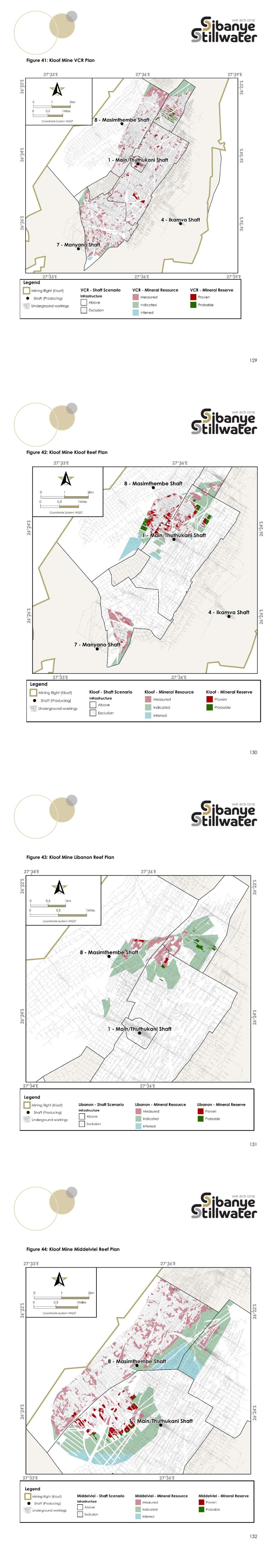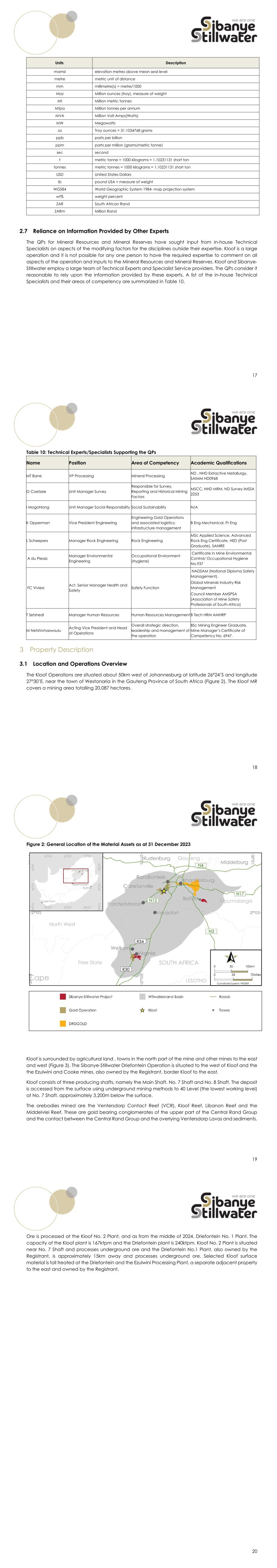 17 Units Description mamsl elevation metres above mean seal level metre metric unit of distance mm millimetre(s) = metre/1000 Moz Million ounces (troy), measure of weight Mt Million metric tonnes Mtpa Million tonnes per annum MVA Million Volt-Amps(Watts) MW Megawatts oz Troy ounces = 31.1034768 grams ppb parts per billion ppm parts per million (grams/metric tonne) sec second t metric tonne = 1000 kilograms = 1.10231131 short ton tonnes metric tonnes = 1000 kilograms = 1.10231131 short ton USD United States Dollars lb pound USA = measure of weight WGS84 World Geographic System 1984- map projection system wt% weight percent ZAR South African Rand ZARm Million Rand 2.7 Reliance on Information Provided by Other Experts The QPs for Mineral Resources and Mineral Reserves have sought input from in-house Technical Specialists on aspects of the modifying factors for the disciplines outside their expertise. Kloof is a large operation and it is not possible for any one person to have the required expertise to comment on all aspects of the operation and inputs to the Mineral Resources and Mineral Reserves. Kloof and Sibanye- Stillwater employ a large team of Technical Experts and Specialist Service providers. The QPs consider it reasonable to rely upon the information provided by these experts. A list of the in-house Technical Specialists and their areas of competency are summarized in Table 10. 18 Table 10: Technical Experts/Specialists Supporting the QPs Name Position Area of Competency Academic Qualifications MT Bane VP Processing Mineral Processing ND , NHD Extractive Metallurgy, SAIMM HD0968 G Coetzee Unit Manager Survey Responsible for Survey, Reporting and Historical Mining Factors MSCC, NHD MRM, ND Survey IMSSA 2253 I Mogohlong Unit Manager Social Responsibility Social Sustainability N/A K Opperman Vice President Engineering Engineering Gold Operations and associated logistics; infrastructure management B Eng Mechanical. Pr Eng L Scheepers Manager Rock Engineering Rock Engineering MSc Applied Science, Advanced Rock Eng Certificate, HED (Post Graduate), SANIRE A du Plessis Manager Environmental Engineering Occupational Environment (Hygiene) Certificate in Mine Environmental Control/ Occupational Hygiene No.937 FC Viviers Act. Senior Manager Health and Safety Safety Function NADSAM (National Diploma Safety Management). Global Minerals Industry Risk Management Council Member AMSPSA (Association of Mine Safety Profesionals of South-Africa) T Setshedi Manager Human Resources Human Resources Management B Tech HRM AMHRP M Netshivhazwaulu Acting Vice President and Head of Operations Overall strategic direction, leadership and management of the operation BSc Mining Engineer Graduate, Mine Manager’s Certificate of Competency No. 6947. 3 Property Description 3.1 Location and Operations Overview The Kloof Operations are situated about 50km west of Johannesburg at latitude 26°24’S and longitude 27°30’E, near the town of Westonaria in the Gauteng Province of South Africa (Figure 2). The Kloof MR covers a mining area totalling 20,087 hectares. 19 Figure 2: General Location of the Material Assets as at 31 December 2023 Kloof is surrounded by agricultural land , towns in the north part of the mine and other mines to the east and west (Figure 3). The Sibanye-Stillwater Driefontein Operation is situated to the west of Kloof and the the Ezulwini and Cooke mines, also owned by the Registrant, border Kloof to the east. Kloof consists of three producing shafts, namely the Main Shaft, No. 7 Shaft and No. 8 Shaft. The deposit is accessed from the surface using underground mining methods to 40 Level (the lowest working level) at No. 7 Shaft, approximately 3,200m below the surface. The orebodies mined are the Ventersdorp Contact Reef (VCR), Kloof Reef, Libanon Reef and the Middelvlei Reef. These are gold bearing conglomerates of the upper part of the Central Rand Group and the contact between the Central Rand Group and the overlying Ventersdorp Lavas and sediments. 20 Ore is processed at the Kloof No. 2 Plant, and as from the middle of 2024, Driefontein No. 1 Plant. The capacity of the Kloof plant is 167ktpm and the Driefontein plant is 240ktpm. Kloof No. 2 Plant is situated near No. 7 Shaft and processes underground ore and the Driefontein No.1 Plant, also owned by the Registrant, is approximately 15km away and processes underground ore. Selected Kloof surface material is toll treated at the Driefontein and the Ezulwini Processing Plant, a separate adjacent property to the east and owned by the Registrant.