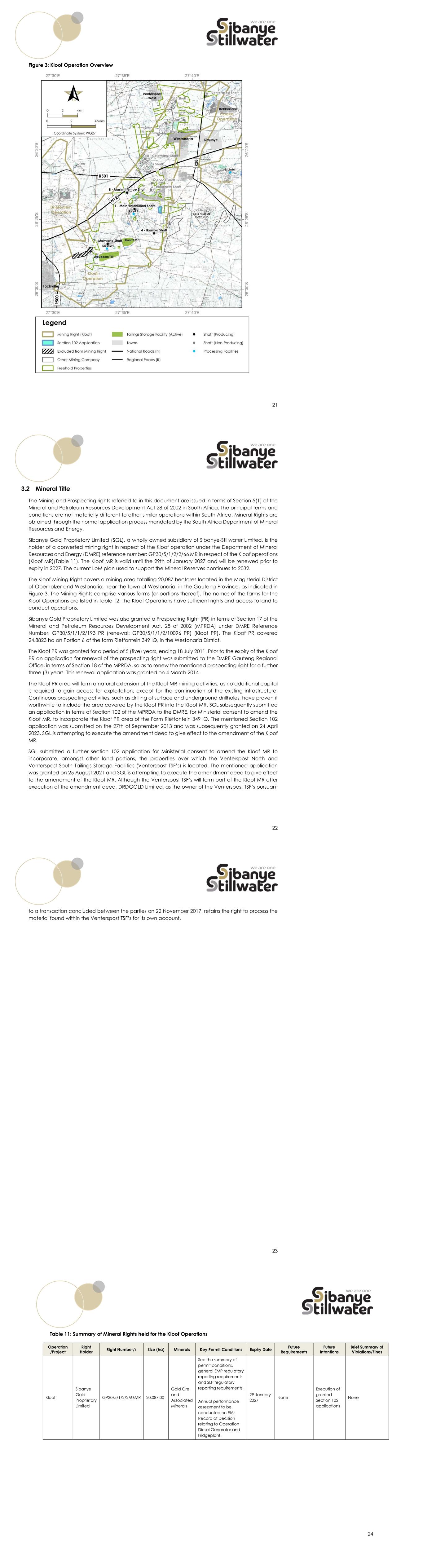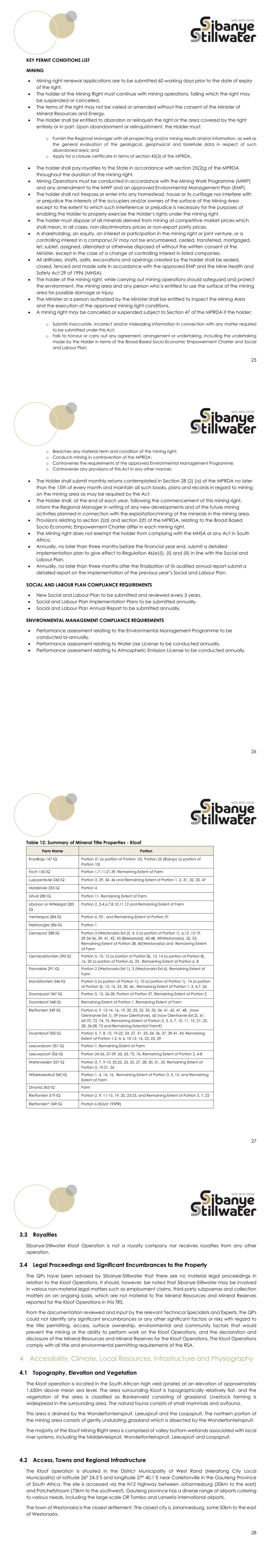 21 Figure 3: Kloof Operation Overview 22 3.2 Mineral Title The Mining and Prospecting rights referred to in this document are issued in terms of Section 5(1) of the Mineral and Petroleum Resources Development Act 28 of 2002 in South Africa. The principal terms and conditions are not materially different to other similar operations within South Africa. Mineral Rights are obtained through the normal application process mandated by the South Africa Department of Mineral Resources and Energy. Sibanye Gold Proprietary Limited (SGL), a wholly owned subsidiary of Sibanye-Stillwater Limited, is the holder of a converted mining right in respect of the Kloof operation under the Department of Mineral Resources and Energy (DMRE) reference number: GP30/5/1/2/2/66 MR in respect of the Kloof operations (Kloof MR)(Table 11). The Kloof MR is valid until the 29th of January 2027 and will be renewed prior to expiry in 2027. The current LoM plan used to support the Mineral Reserves continues to 2032. The Kloof Mining Right covers a mining area totalling 20,087 hectares located in the Magisterial District of Oberholzer and Westonaria, near the town of Westonaria, in the Gauteng Province, as indicated in Figure 3. The Mining Rights comprise various farms (or portions thereof). The names of the farms for the Kloof Operations are listed in Table 12. The Kloof Operations have sufficient rights and access to land to conduct operations. Sibanye Gold Proprietary Limited was also granted a Prospecting Right (PR) in terms of Section 17 of the Mineral and Petroleum Resources Development Act, 28 of 2002 (MPRDA) under DMRE Reference Number: GP30/5/1/1/2/193 PR (renewal: GP30/5/1/1/2/10096 PR) (Kloof PR). The Kloof PR covered 24.8823 ha on Portion 6 of the farm Rietfontein 349 IQ, in the Westonaria District. The Kloof PR was granted for a period of 5 (five) years, ending 18 July 2011. Prior to the expiry of the Kloof PR an application for renewal of the prospecting right was submitted to the DMRE Gauteng Regional Office, in terms of Section 18 of the MPRDA, so as to renew the mentioned prospecting right for a further three (3) years. This renewal application was granted on 4 March 2014. The Kloof PR area will form a natural extension of the Kloof MR mining activities, as no additional capital is required to gain access for exploitation, except for the continuation of the existing infrastructure. Continuous prospecting activities, such as drilling of surface and underground drillholes, have proven it worthwhile to include the area covered by the Kloof PR into the Kloof MR. SGL subsequently submitted an application in terms of Section 102 of the MPRDA to the DMRE, for Ministerial consent to amend the Kloof MR, to incorporate the Kloof PR area of the Farm Rietfontein 349 IQ. The mentioned Section 102 application was submitted on the 27th of September 2013 and was subsequently granted on 24 April 2023. SGL is attempting to execute the amendment deed to give effect to the amendment of the Kloof MR. SGL submitted a further section 102 application for Ministerial consent to amend the Kloof MR to incorporate, amongst other land portions, the properties over which the Venterspost North and Venterspost South Tailings Storage Facilities (Venterspost TSF’s) is located. The mentioned application was granted on 25 August 2021 and SGL is attempting to execute the amendment deed to give effect to the amendment of the Kloof MR. Although the Venterspost TSF’s will form part of the Kloof MR after execution of the amendment deed, DRDGOLD Limited, as the owner of the Venterspost TSF’s pursuant 23 to a transaction concluded between the parties on 22 November 2017, retains the right to process the material found within the Venterspost TSF’s for its own account. 24 Table 11: Summary of Mineral Rights held for the Kloof Operations Operation /Project Right Holder Right Number/s Size (ha) Minerals Key Permit Conditions Expiry Date Future Requirements Future Intentions Brief Summary of Violations/Fines Kloof Sibanye Gold Proprietary Limited GP30/5/1/2/2/66MR 20,087.00 Gold Ore and Associated Minerals See the summary of permit conditions, general EMP regulatory reporting requirements and SLP regulatory reporting requirements. Annual performance assessment to be conducted on EIA: Record of Decision relating to Operation Diesel Generator and Fridgeplant. 29 January 2027 None Execution of granted Section 102 applications None