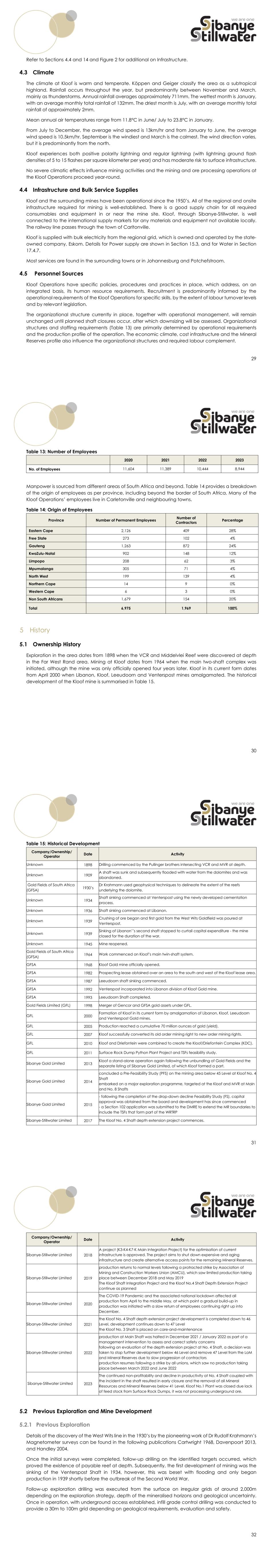 29 Refer to Sections 4.4 and 14 and Figure 2 for additional on Infrastructure. 4.3 Climate The climate at Kloof is warm and temperate. Köppen and Geiger classify the area as a subtropical highland. Rainfall occurs throughout the year, but predominantly between November and March, mainly as thunderstorms. Annual rainfall averages approximately 711mm. The wettest month is January, with an average monthly total rainfall of 132mm. The driest month is July, with an average monthly total rainfall of approximately 2mm. Mean annual air temperatures range from 11.8°C in June/ July to 23.8°C in January. From July to December, the average wind speed is 13km/hr and from January to June, the average wind speed is 10.5km/hr. September is the windiest and March is the calmest. The wind direction varies, but it is predominantly from the north. Kloof experiences both positive polarity lightning and regular lightning (with lightning ground flash densities of 5 to 15 flashes per square kilometer per year) and has moderate risk to surface infrastructure. No severe climatic effects influence mining activities and the mining and ore processing operations at the Kloof Operations proceed year-round. 4.4 Infrastructure and Bulk Service Supplies Kloof and the surrounding mines have been operational since the 1950’s. All of the regional and onsite infrastructure required for mining is well-established. There is a good supply chain for all required consumables and equipment in or near the mine site. Kloof, through Sibanye-Stillwater, is well connected to the international supply markets for any materials and equipment not available locally. The railway line passes through the town of Carltonville. Kloof is supplied with bulk electricity from the regional grid, which is owned and operated by the state- owned company, Eskom. Details for Power supply are shown in Section 15.3, and for Water in Section 17.4.7. Most services are found in the surrounding towns or in Johannesburg and Potchefstroom. 4.5 Personnel Sources Kloof Operations have specific policies, procedures and practices in place, which address, on an integrated basis, its human resource requirements. Recruitment is predominantly informed by the operational requirements of the Kloof Operations for specific skills, by the extent of labour turnover levels and by relevant legislation. The organizational structure currently in place, together with operational management, will remain unchanged until planned shaft closures occur, after which downsizing will be assessed. Organizational structures and staffing requirements (Table 13) are primarily determined by operational requirements and the production profile of the operation. The economic climate, cost infrastructure and the Mineral Reserves profile also influence the organizational structures and required labour complement. 30 Table 13: Number of Employees 2020 2021 2022 2023 No. of Employees 11,604 11,389 10,444 8,944 Manpower is sourced from different areas of South Africa and beyond. Table 14 provides a breakdown of the origin of employees as per province, including beyond the border of South Africa. Many of the Kloof Operations’ employees live in Carletonville and neighbouring towns. Table 14: Origin of Employees Province Number of Permanent Employees Number of Contractors Percentage Eastern Cape 2,126 409 28% Free State 273 102 4% Gauteng 1,263 872 24% KwaZulu-Natal 902 148 12% Limpopo 208 62 3% Mpumalanga 305 71 4% North West 199 139 4% Northern Cape 14 9 0% Western Cape 6 3 0% Non South Africans 1,679 154 20% Total 6,975 1,969 100% 5 History 5.1 Ownership History Exploration in the area dates from 1898 when the VCR and Middelvlei Reef were discovered at depth in the Far West Rand area. Mining at Kloof dates from 1964 when the main two-shaft complex was initiated, although the mine was only officially opened four years later. Kloof in its current form dates from April 2000 when Libanon, Kloof, Leeudoorn and Venterspost mines amalgamated. The historical development of the Kloof mine is summarised in Table 15. 31 Table 15: Historical Development Company/Ownership/ Operator Date Activity Unknown 1898 Drilling commenced by the Pullinger brothers intersecting VCR and MVR at depth. Unknown 1909 A shaft was sunk and subsequently flooded with water from the dolomites and was abandoned. Gold Fields of South Africa (GFSA) 1930’s Dr Krahmann used geophysical techniques to delineate the extent of the reefs underlying the dolomite. Unknown 1934 Shaft sinking commenced at Venterspost using the newly developed cementation process. Unknown 1936 Shaft sinking commenced at Libanon. Unknown 1939 Crushing of ore began and first gold from the West Wits Goldfield was poured at Venterspost. Unknown 1939 Sinking of Libanon’’s second shaft stopped to curtail capital expenditure - the mine closed for the duration of the war. Unknown 1945 Mine reopened. Gold Fields of South Africa (GFSA) 1964 Work commenced on Kloof’s main twin-shaft system. GFSA 1968 Kloof Gold mine officially opened. GFSA 1982 Prospecting lease obtained over an area to the south and west of the Kloof lease area. GFSA 1987 Leeudoorn shaft sinking commenced. GFSA 1992 Venterspost incorporated into Libanon division of Kloof Gold mine. GFSA 1993 Leeudoorn Shaft completed. Gold Fields Limited (GFL) 1998 Merger of Gencor and GFSA gold assets under GFL. GFL 2000 Formation of Kloof in its current form by amalgamation of Libanon, Kloof, Leeudoorn and Venterspost Gold mines. GFL 2005 Production reached a cumulative 70 million ounces of gold (yield). GFL 2007 Kloof successfully converted its old order mining right to new order mining rights. GFL 2010 Kloof and Driefontein were combined to create the Kloof/Driefontein Complex (KDC). GFL 2011 Surface Rock Dump Python Plant Project and TSFs feasibility study. Sibanye Gold Limited 2013 Kloof a stand-alone operation again following the unbundling of Gold Fields and the separate listing of Sibanye Gold Limited, of 