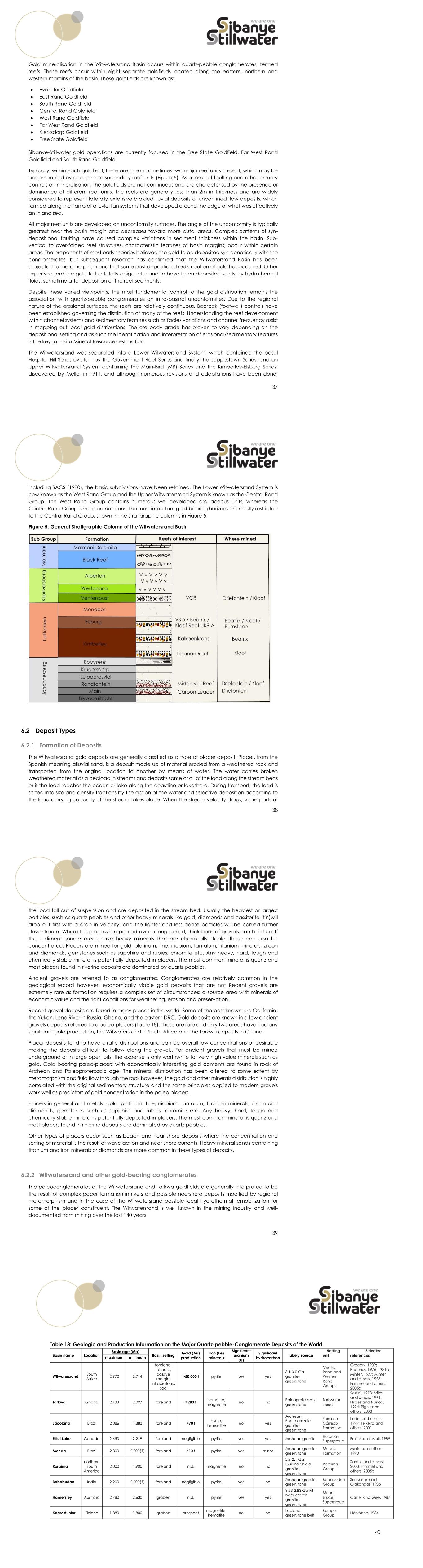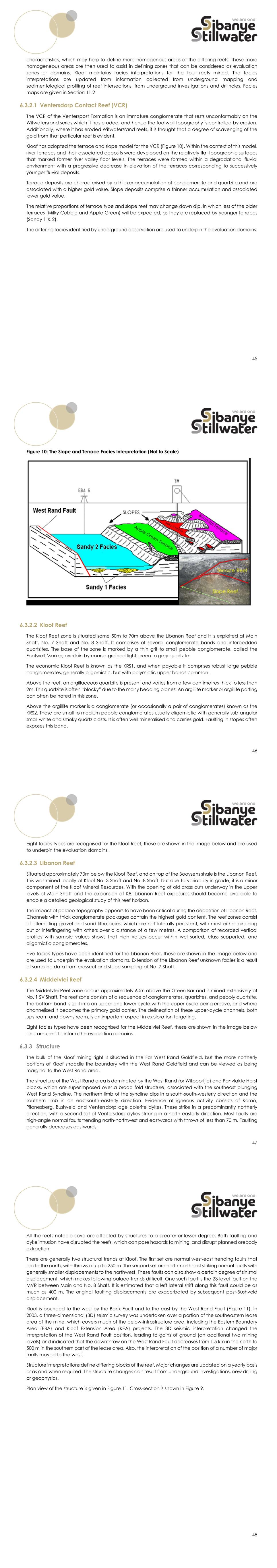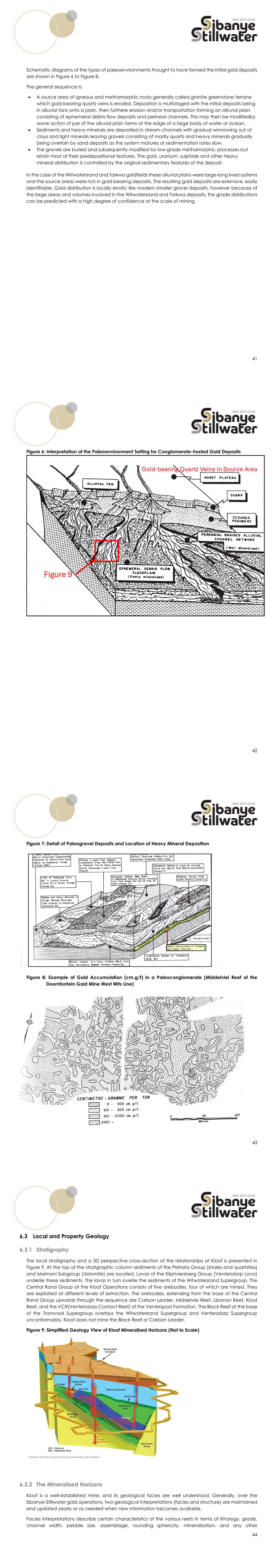 41 Schematic diagrams of the types of paleoenvironments thought to have formed the initial gold deposits are shown in Figure 6 to Figure 8. The general sequence is:  A source area of igneous and methamorphic rocks generally called granite-greenstone terrane which gold-bearing quartz veins is eroded. Deposition is multistaged with the initial deposits being in alluvial fans onto a plain, then furthere erosion and/or transportation forming an alluvial plain consisting of ephemeral debris flow deposits and perineal channels. This may then be modifiedby wave action of par of the alluvial plain forms at the edge of a large body of water or ocean.  Sediments and heavy minerals are deposited in stream channels with gradual winnowing out of clays and light minerals leaving gravels consisting of mostly quartz and heavy minerals gradually being overlain by sand deposits as the system matures or sedimentation rates slow.  The gravels are buried and subsequently modified by low-grade methamorphic processes but retain most of their predepositional features. The gold, uranium, sulphide and other heavy mineral distribution is controlled by the original sedimentary features of the deposit. In the case of the Witwatersrand and Tarkwa goldfields these alluvial plains were large-long lived systems and the source areas were rich in gold-bearing deposits. The resulting gold deposits are extensive, easily identifiable. Gold distribution is locally erratic like modern smaller gravel deposits, however because of the large areas and volumes involved in the Witwatersrand and Tarkwa deposits, the grade distributions can be predicted with a high degree of confidence at the scale of mining. 42 Figure 6: Interpretation of the Paleoenvironment Setting for Conglomerate-hosted Gold Deposits 43 Figure 7: Detail of Paleogravel Deposits and Location of Heavy Mineral Deposition Figure 8: Example of Gold Accumulation (cm.g/t) in a Paleoconglomerate (Middelvlei Reef of the Doornfontein Gold Mine West Wits Line) 44 6.3 Local and Property Geology 6.3.1 Stratigraphy The local stratigraphy and a 3D perspective cross-section of the relationships at Kloof is presented in Figure 9. At the top of the stratigraphic column sediments of the Pretoria Group (shales and quartzites) and Malmani Subgroup (dolomite) are located. Lavas of the Klipriviersberg Group (Ventersdorp Lava) underlie these sediments. The lavas in turn overlie the sediments of the Witwatersrand Supergroup. The Central Rand Group at the Kloof Operations consists of five orebodies, four of which are mined. They are exploited at different levels of extraction. The orebodies, extending from the base of the Central Rand Group upwards through the sequence are Carbon Leader, Middelvlei Reef, Libanon Reef, Kloof Reef, and the VCR(Ventersdorp Contact Reef) of the Venterspost Formation. The Black Reef at the base of the Transvaal Supergroup overlays the Witwatersrand Supergroup and Ventersdorp Supergroup unconformably. Kloof does not mine the Black Reef or Carbon Leader. Figure 9: Simplified Geology View of Kloof Mineralised Horizons (Not to Scale) 6.3.2 The Mineralised Horizons Kloof is a well-established mine, and its geological facies are well understood. Generally, over the Sibanye-Stillwater gold operations, two geological interpretations (facies and structure) are maintained and updated yearly or as needed when new information becomes available. Facies interpretations describe certain characteristics of the various reefs in terms of lithology, grade, channel width, pebble size, assemblage, rounding sphericity, mineralisation, and any other