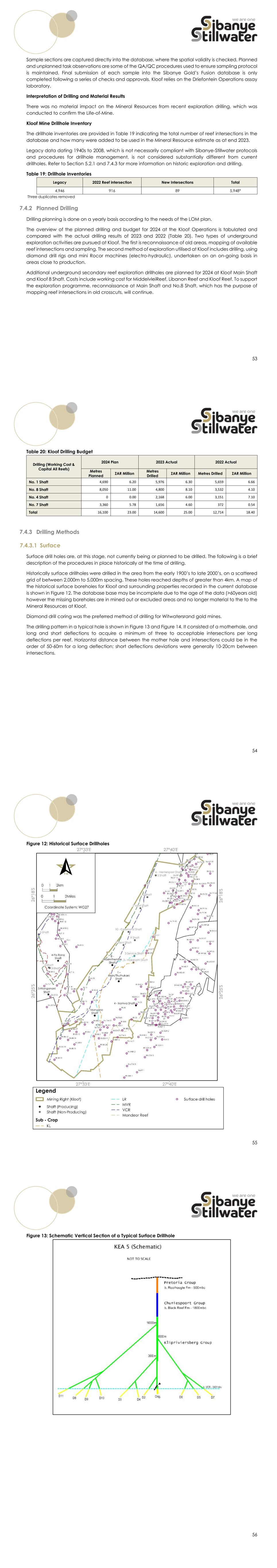 53 Sample sections are captured directly into the database, where the spatial validity is checked. Planned and unplanned task observations are some of the QA/QC procedures used to ensure sampling protocol is maintained. Final submission of each sample into the Sibanye Gold’s Fusion database is only completed following a series of checks and approvals. Kloof relies on the Driefontein Operations assay laboratory. Interpretation of Drilling and Material Results There was no material impact on the Mineral Resources from recent exploration drilling, which was conducted to confirm the Life-of-Mine. Kloof Mine Drillhole Inventory The drillhole inventories are provided in Table 19 indicating the total number of reef intersections in the database and how many were added to be used in the Mineral Resource estimate as at end 2023. Legacy data dating 1940s to 2008, which is not necessarily compliant with Sibanye-Stillwater protocols and procedures for drillhole management, is not considered substantially different from current drillholes. Refer to Section 5.2.1 and 7.4.3 for more information on historic exploration and drilling. Table 19: Drillhole Inventories Legacy 2022 Reef intersection New Intersections Total 4,946 916 89 5,948* Three duplicates removed 7.4.2 Planned Drilling Drilling planning is done on a yearly basis according to the needs of the LOM plan. The overview of the planned drilling and budget for 2024 at the Kloof Operations is tabulated and compared with the actual drilling results of 2023 and 2022 (Table 20). Two types of underground exploration activities are pursued at Kloof. The first is reconnaissance of old areas, mapping of available reef intersections and sampling. The second method of exploration utilised at Kloof includes drilling, using diamond drill rigs and mini Rocor machines (electro-hydraulic), undertaken on an on-going basis in areas close to production. Additional underground secondary reef exploration drillholes are planned for 2024 at Kloof Main Shaft and Kloof 8 Shaft. Costs include working cost for MiddelvleiReef, Libanon Reef and Kloof Reef. To support the exploration programme, reconnaissance at Main Shaft and No.8 Shaft, which has the purpose of mapping reef intersections in old crosscuts, will continue. 54 Table 20: Kloof Drilling Budget Drilling (Working Cost & Capital All Reefs) 2024 Plan 2023 Actual 2022 Actual Metres Planned ZAR Million Metres Drilled ZAR Million Metres Drilled ZAR Million No. 1 Shaft 4,690 6.20 5,976 6.30 5,659 6.66 No. 8 Shaft 8,050 11.00 4,800 8.10 3,532 4.10 No. 4 Shaft 0 0.00 2,168 6.00 3,151 7.10 No. 7 Shaft 3,360 5.78 1,656 4.60 372 0.54 Total 16,100 23.00 14,600 25.00 12,714 18.40 7.4.3 Drilling Methods 7.4.3.1 Surface Surface drill holes are, at this stage, not currently being or planned to be drilled. The following is a brief description of the procedures in place historically at the time of drilling. Historically surface drillholes were drilled in the area from the early 1900’s to late 2000’s, on a scattered grid of between 2,000m to 5,000m spacing. These holes reached depths of greater than 4km. A map of the historical surface boreholes for Kloof and surrounding properties recorded in the current database is shown in Figure 12. The database base may be incomplete due to the age of the data (>60years old) however the missing boreholes are in mined out or excluded areas and no longer material to the to the Mineral Resources at Kloof. Diamond drill coring was the preferred method of drilling for Witwatersrand gold mines. The drilling pattern in a typical hole is shown in Figure 13 and Figure 14. It consisted of a motherhole, and long and short deflections to acquire a minimum of three to acceptable intersections per long deflections per reef. Horizontal distance between the mother hole and intersections could be in the order of 50-60m for a long deflection; short deflections deviations were generally 10-20cm between intersections. 55 Figure 12: Historical Surface Drillholes 56 Figure 13: Schematic Vertical Section of a Typical Surface Drillhole