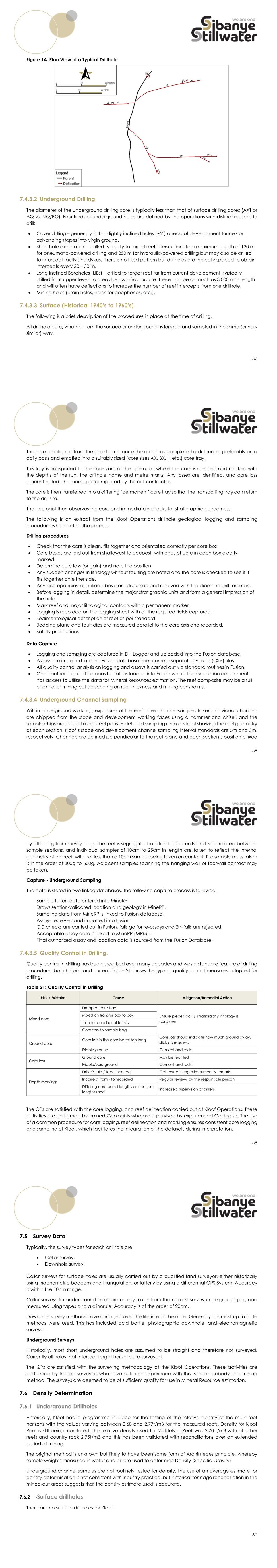 57 Figure 14: Plan View of a Typical Drillhole 7.4.3.2 Underground Drilling The diameter of the underground drilling core is typically less than that of surface drilling cores (AXT or AQ vs. NQ/BQ). Four kinds of underground holes are defined by the operations with distinct reasons to drill:  Cover drilling – generally flat or slightly inclined holes (~5°) ahead of development tunnels or advancing stopes into virgin ground.  Short hole exploration – drilled typically to target reef intersections to a maximum length of 120 m for pneumatic-powered drilling and 250 m for hydraulic-powered drilling but may also be drilled to intercept faults and dykes. There is no fixed pattern but drillholes are typically spaced to obtain intercepts every 30 – 50 m.  Long Inclined Boreholes (LIBs) – drilled to target reef far from current development, typically drilled from upper levels to areas below infrastructure. These can be as much as 3 000 m in length and will often have deflections to increase the number of reef intercepts from one drillhole.  Mining holes (drain holes, holes for geophones, etc.). 7.4.3.3 Surface (Historical 1940’s to 1960’s) The following is a brief description of the procedures in place at the time of drilling. All drillhole core, whether from the surface or underground, is logged and sampled in the same (or very similar) way. 58 The core is obtained from the core barrel, once the driller has completed a drill run, or preferably on a daily basis and emptied into a suitably sized (core sizes AX, BX, H etc.) core tray. This tray is transported to the core yard of the operation where the core is cleaned and marked with the depths of the run, the drillhole name and metre marks. Any losses are identified, and core loss amount noted. This mark-up is completed by the drill contractor. The core is then transferred into a differing ‘permanent’ core tray so that the transporting tray can return to the drill site. The geologist then observes the core and immediately checks for stratigraphic correctness. The following is an extract from the Kloof Operations drillhole geological logging and sampling procedure which details the process Drilling procedures  Check that the core is clean, fits together and orientated correctly per core box.  Core boxes are laid out from shallowest to deepest, with ends of core in each box clearly marked.  Determine core loss (or gain) and note the position.  Any sudden changes in lithology without faulting are noted and the core is checked to see if it fits together on either side.  Any discrepancies identified above are discussed and resolved with the diamond drill foreman.  Before logging in detail, determine the major stratigraphic units and form a general impression of the hole.  Mark reef and major lithological contacts with a permanent marker.  Logging is recorded on the logging sheet with all the required fields captured.  Sedimentological description of reef as per standard.  Bedding plane and fault dips are measured parallel to the core axis and recorded..  Safety precautions. Data Capture  Logging and sampling are captured in DH Logger and uploaded into the Fusion database.  Assays are imported into the Fusion database from comma separated values (CSV) files.  All quality control analysis on logging and assays is carried out via standard routines in Fusion.  Once authorised, reef composite data is loaded into Fusion where the evaluation department has access to utilise the data for Mineral Resources estimation. The reef composite may be a full channel or mining cut depending on reef thickness and mining constraints. 7.4.3.4 Underground Channel Sampling Within underground workings, exposures of the reef have channel samples taken. Individual channels are chipped from the stope and development working faces using a hammer and chisel, and the sample chips are caught using steel pans. A detailed sampling record is kept showing the reef geometry at each section. Kloof’s stope and development channel sampling interval standards are 5m and 3m, respectively. Channels are defined perpendicular to the reef plane and each section’s position is fixed 59 by offsetting from survey pegs. The reef is segregated into lithological units and is correlated between sample sections, and individual samples of 10cm to 25cm in length are taken to reflect the internal geometry of the reef, with not less than a 10cm sample being taken on contact. The sample mass taken is in the order of 300g to 500g. Adjacent samples spanning the hanging wall or footwall contact may be taken. Capture - Underground Sampling The data is stored in two linked databases. The following capture process is followed. Sample taken-data entered into MineRP. Draws section-validated location and geology in MineRP. Sampling data from MineRP is linked to Fusion database. Assays received and imported into Fusion QC checks are carried out in Fusion, fails go for re-assays and 2nd fails are rejected. Acceptable assay data is linked to MineRP (MRM). Final authorized assay and location data is sourced from the Fusion Database. 7.4.3.5 Quality Control in Drilling. Quality control in drilling has been practised over many decades and was a standard feature of drilling procedures both historic and current. Table 21 shows the typical quality control measures adopted for drilling. Table 21: Quality Control in Drilling Risk / Mistake Cause Mitigation/Remedial Action Mixed core Dropped core tray Ensure pieces lock & stratigraphy lithology is consistent Mixed on transfer box to box Transfer core barrel to tray Core tray to sample bag Ground core Core left in the core barrel too long Core loss should indicate how much ground away, stick up required Friable ground Cement and redrill Core loss Ground core May be redrilled Friable/void ground Cement and redrill Depth markings Driller’s rule / tape incorrect Get correct length instrument & remark Incor