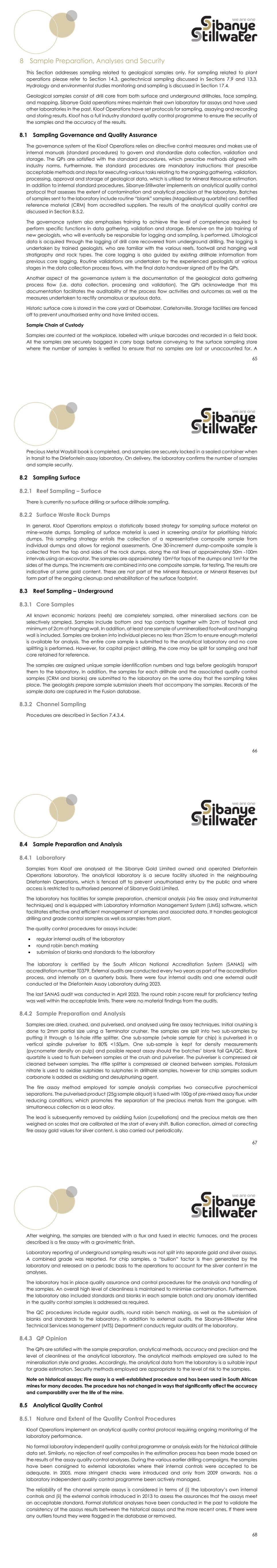 65 8 Sample Preparation, Analyses and Security This Section addresses sampling related to geological samples only. For sampling related to plant operations please refer to Section 14.3, geotechnical sampling discussed in Sections 7.9 and 13.3. Hydrology and environmental studies monitoring and sampling is discussed in Section 17.4. Geological samples consist of drill core from both surface and underground drillholes, face sampling. and mapping. Sibanye Gold operations mines maintain their own laboratory for assays and have used other laboratories in the past. Kloof Operations have set protocols for sampling, assaying and recording and storing results. Kloof has a full industry standard quality control programme to ensure the security of the samples and the accuracy of the results. 8.1 Sampling Governance and Quality Assurance The governance system at the Kloof Operations relies on directive control measures and makes use of internal manuals (standard procedures) to govern and standardize data collection, validation and storage. The QPs are satisfied with the standard procedures, which prescribe methods aligned with industry norms. Furthermore, the standard procedures are mandatory instructions that prescribe acceptable methods and steps for executing various tasks relating to the ongoing gathering, validation, processing, approval and storage of geological data, which is utilised for Mineral Resource estimation. In addition to internal standard procedures, Sibanye-Stillwater implements an analytical quality control protocol that assesses the extent of contamination and analytical precision at the laboratory. Batches of samples sent to the laboratory include routine “blank” samples (Magaliesburg quartzite) and certified reference material (CRM) from accredited suppliers. The results of the analytical quality control are discussed in Section 8.5.2. The governance system also emphasises training to achieve the level of competence required to perform specific functions in data gathering, validation and storage. Extensive on the job training of new geologists, who will eventually be responsible for logging and sampling, is performed. Lithological data is acquired through the logging of drill core recovered from underground drilling. The logging is undertaken by trained geologists, who are familiar with the various reefs, footwall and hanging wall stratigraphy and rock types. The core logging is also guided by existing drillhole information from previous core logging. Routine validations are undertaken by the experienced geologists at various stages in the data collection process flows, with the final data handover signed off by the QPs. Another aspect of the governance system is the documentation of the geological data gathering process flow (i.e. data collection, processing and validation). The QPs acknowledge that this documentation facilitates the auditability of the process flow activities and outcomes as well as the measures undertaken to rectify anomalous or spurious data. Historic surface core is stored in the core yard at Oberholzer, Carletonville. Storage facilities are fenced off to prevent unauthorised entry and have limited access. Sample Chain of Custody Samples are counted at the workplace, labelled with unique barcodes and recorded in a field book. All the samples are securely bagged in carry bags before conveying to the surface sampling store where the number of samples is verified to ensure that no samples are lost or unaccounted for. A 66 Precious Metal Waybill book is completed, and samples are securely locked in a sealed container when in transit to the Driefontein assay laboratory. On delivery, the laboratory confirms the number of samples and sample security. 8.2 Sampling Surface 8.2.1 Reef Sampling – Surface There is currently no surface drilling or surface drillhole sampling. 8.2.2 Surface Waste Rock Dumps In general, Kloof Operations employs a statistically based strategy for sampling surface material on mine-waste dumps. Sampling of surface material is used in screening and/or for prioritising historic dumps. This sampling strategy entails the collection of a representative composite sample from individual dumps and allows for regional assessments. One 30-increment dump-composite sample is collected from the top and sides of the rock dumps, along the rail lines at approximately 50m -100m intervals using an excavator. The samples are approximately 10m3 for tops of the dumps and 1m3 for the sides of the dumps. The increments are combined into one composite sample, for testing. The results are indicative of some gold content. These are not part of the Mineral Resource or Mineral Reserves but form part of the ongoing cleanup and rehabilitation of the surface footprint. 8.3 Reef Sampling – Underground 8.3.1 Core Samples All known economic horizons (reefs) are completely sampled, other mineralised sections can be selectively sampled. Samples include bottom and top contacts together with 2cm of footwall and minimum of 2cm of hanging wall. In addition, at least one sample of unmineralised footwall and hanging wall is included. Samples are broken into individual pieces no less than 25cm to ensure enough material is available for analysis. The entire core sample is submitted to the analytical laboratory and no core splitting is performed. However, for capital project drilling, the core may be split for sampling and half core retained for reference. The samples are assigned unique sample identification numbers and tags before geologists transport them to the laboratory. In addition, the samples for each drillhole and the associated quality control samples (CRM and blanks) are submitted to the laboratory on the same day that the sampling takes place. The geologists prepare sample submission sheets that accompany the samples. Records of the sample data are captured in the Fusion database. 8.3.2 Channel Sampling Procedures are described in Section 7.4.3.4. 67 8.4 Sample Pr