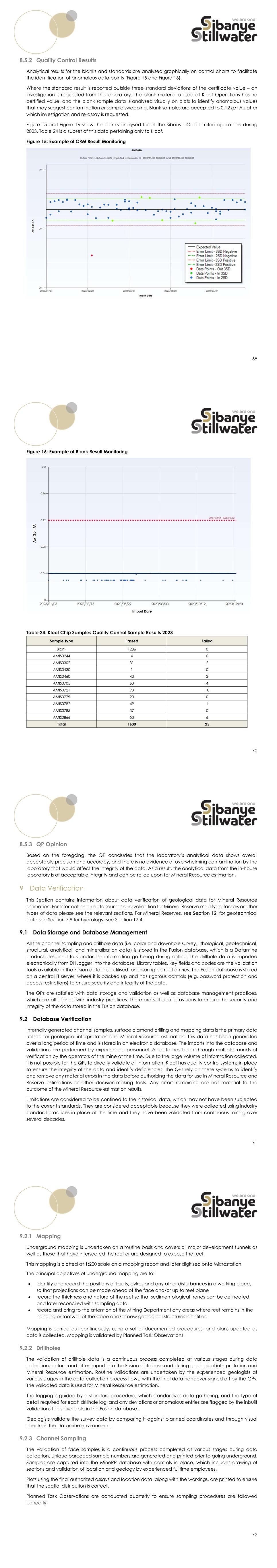 69 8.5.2 Quality Control Results Analytical results for the blanks and standards are analysed graphically on control charts to facilitate the identification of anomalous data points (Figure 15 and Figure 16). Where the standard result is reported outside three standard deviations of the certificate value – an investigation is requested from the laboratory. The blank material utilised at Kloof Operations has no certified value, and the blank sample data is analysed visually on plots to identify anomalous values that may suggest contamination or sample swapping. Blank samples are accepted to 0.12 g/t Au after which investigation and re-assay is requested. Figure 15 and Figure 16 show the blanks analysed for all the Sibanye Gold Limited operations during 2023. Table 24 is a subset of this data pertaining only to Kloof. Figure 15: Example of CRM Result Monitoring 70 Figure 16: Example of Blank Result Monitoring Table 24: Kloof Chip Samples Quality Control Sample Results 2023 Sample Type Passed Failed Blank 1236 0 AMIS0244 4 0 AMIS0302 31 2 AMIS0430 1 0 AMIS0460 43 2 AMIS0705 63 4 AMIS0721 93 10 AMIS0779 20 0 AMIS0782 49 1 AMIS0785 37 0 AMIS0866 53 6 Total 1630 25 71 8.5.3 QP Opinion Based on the foregoing, the QP concludes that the laboratory’s analytical data shows overall acceptable precision and accuracy, and there is no evidence of overwhelming contamination by the laboratory that would affect the integrity of the data. As a result, the analytical data from the in-house laboratory is of acceptable integrity and can be relied upon for Mineral Resource estimation. 9 Data Verification This Section contains information about data verification of geological data for Mineral Resource estimation. For Information on data sources and validation for Mineral Reserve modifying factors or other types of data please see the relevant sections. For Mineral Reserves, see Section 12, for geotechnical data see Section 7.9 for hydrology, see Section 17.4. 9.1 Data Storage and Database Management All the channel sampling and drillhole data (i.e. collar and downhole survey, lithological, geotechnical, structural, analytical, and mineralisation data) is stored in the Fusion database, which is a Datamine product designed to standardise information gathering during drilling. The drillhole data is imported electronically from DHLogger into the database. Library tables, key fields and codes are the validation tools available in the Fusion database utilised for ensuring correct entries. The Fusion database is stored on a central IT server, where it is backed up and has rigorous controls (e.g. password protection and access restrictions) to ensure security and integrity of the data. The QPs are satisfied with data storage and validation as well as database management practices, which are all aligned with industry practices. There are sufficient provisions to ensure the security and integrity of the data stored in the Fusion database. 9.2 Database Verification Internally generated channel samples, surface diamond drilling and mapping data is the primary data utilised for geological interpretation and Mineral Resource estimation. This data has been generated over a long period of time and is stored in an electronic database. The imports into the database and validations are performed by experienced personnel. All data has been through multiple rounds of verification by the operators of the mine at the time. Due to the large volume of information collected, it is not possible for the QPs to directly validate all information. Kloof has quality control systems in place to ensure the integrity of the data and identify deficiencies. The QPs rely on these systems to identify and remove any material errors in the data before authorizing the data for use in Mineral Resource and Reserve estimations or other decision-making tools. Any errors remaining are not material to the outcome of the Mineral Resource estimation results. Limitations are considered to be confined to the historical data, which may not have been subjected to the current standards. They are considered acceptable because they were collected using industry standard practices in place at the time and they have been validated from continuous mining over several decades. 72 9.2.1 Mapping Underground mapping is undertaken on a routine basis and covers all major development tunnels as well as those that have intersected the reef or are designed to expose the reef. This mapping is plotted at 1:200 scale on a mapping report and later digitised onto Microstation. The principal objectives of underground mapping are to:  identify and record the positions of faults, dykes and any other disturbances in a working place, so that projections can be made ahead of the face and/or up to reef plane  record the thickness and nature of the reef so that sedimentological trends can be delineated and later reconciled with sampling data  record and bring to the attention of the Mining Department any areas where reef remains in the hanging or footwall of the stope and/or new geological structures identified Mapping is carried out continuously, using a set of documented procedures, and plans updated as data is collected. Mapping is validated by Planned Task Observations. 9.2.2 Drillholes The validation of drillhole data is a continuous process completed at various stages during data collection, before and after import into the Fusion database and during geological interpretation and Mineral Resource estimation. Routine validations are undertaken by the experienced geologists at various stages in the data collection process flows, with the final data handover signed off by the QPs. The validated data is used for Mineral Resource estimation. The logging is guided by a standard procedure, which standardizes data gathering, and the type of detail required for each drillhole log, and any deviations or anomalous entries are flagged by the inbuilt validations tools available in the 