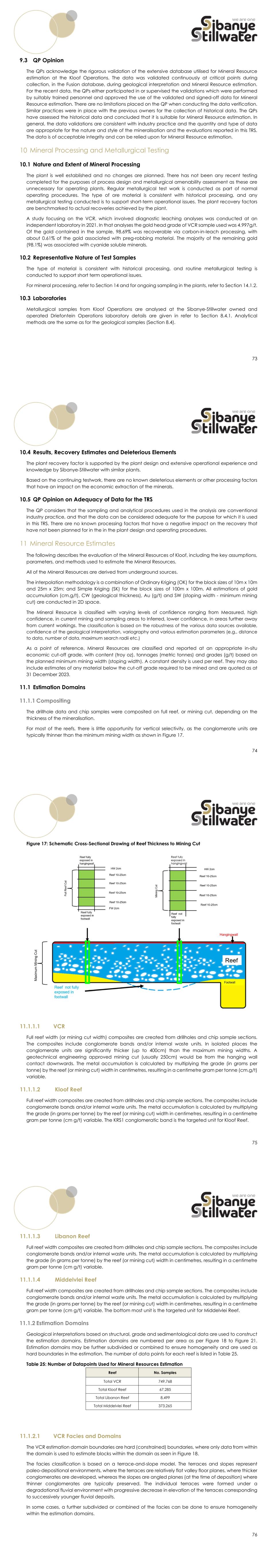 73 9.3 QP Opinion The QPs acknowledge the rigorous validation of the extensive database utilised for Mineral Resource estimation at the Kloof Operations. The data was validated continuously at critical points during collection, in the Fusion database, during geological interpretation and Mineral Resource estimation. For the recent data, the QPs either participated in or supervised the validations which were performed by suitably trained personnel and approved the use of the validated and signed-off data for Mineral Resource estimation. There are no limitations placed on the QP when conducting the data verification. Similar practices were in place with the previous owners for the collection of historical data. The QPs have assessed the historical data and concluded that it is suitable for Mineral Resource estimation. In general, the data validations are consistent with industry practice and the quantity and type of data are appropriate for the nature and style of the mineralisation and the evaluations reported in this TRS. The data is of acceptable integrity and can be relied upon for Mineral Resource estimation. 10 Mineral Processing and Metallurgical Testing 10.1 Nature and Extent of Mineral Processing The plant is well established and no changes are planned. There has not been any recent testing completed for the purposes of process design and metallurgical amenability assessment as these are unnecessary for operating plants. Regular metallurgical test work is conducted as part of normal operating procedures. The type of ore material is consistent with historical processing, and any metallurgical testing conducted is to support short-term operational issues. The plant recovery factors are benchmarked to actual recoveries achieved by the plant. A study focusing on the VCR, which involved diagnostic leaching analyses was conducted at an independent laboratory in 2021. In that analyses the gold head grade of VCR sample used was 4.997g/t. Of the gold contained in the sample, 98.69% was recoverable via carbon-in-leach processing, with about 0.61% of the gold associated with preg-robbing material. The majority of the remaining gold (98.1%) was associated with cyanide soluble minerals. 10.2 Representative Nature of Test Samples The type of material is consistent with historical processing, and routine metallurgical testing is conducted to support short term operational issues. For mineral processing, refer to Section 14 and for ongoing sampling in the plants, refer to Section 14.1.2. 10.3 Laboratories Metallurgical samples from Kloof Operations are analysed at the Sibanye-Stillwater owned and operated Driefontein Operations laboratory details are given in refer to Section 8.4.1. Analytical methods are the same as for the geological samples (Section 8.4). 74 10.4 Results, Recovery Estimates and Deleterious Elements The plant recovery factor is supported by the plant design and extensive operational experience and knowledge by Sibanye-Stillwater with similar plants. Based on the continuing testwork, there are no known deleterious elements or other processing factors that have an impact on the economic extraction of the minerals. 10.5 QP Opinion on Adequacy of Data for the TRS The QP considers that the sampling and analytical procedures used in the analysis are conventional industry practice, and that the data can be considered adequate for the purpose for which it is used in this TRS. There are no known processing factors that have a negative impact on the recovery that have not been planned for in the in the plant design and operating procedures. 11 Mineral Resource Estimates The following describes the evaluation of the Mineral Resources of Kloof, including the key assumptions, parameters, and methods used to estimate the Mineral Resources. All of the Mineral Resources are derived from underground sources. The interpolation methodology is a combination of Ordinary Kriging (OK) for the block sizes of 10m x 10m and 25m x 25m; and Simple Kriging (SK) for the block sizes of 100m x 100m. All estimations of gold accumulation (cm.g/t), CW (geological thickness), Au (g/t) and SW (stoping width - minimum mining cut) are conducted in 2D space. The Mineral Resource is classified with varying levels of confidence ranging from Measured, high confidence, in current mining and sampling areas to Inferred, lower confidence, in areas further away from current workings. The classification is based on the robustness of the various data sources available, confidence of the geological interpretation, variography and various estimation parameters (e.g., distance to data, number of data, maximum search radii etc.) As a point of reference, Mineral Resources are classified and reported at an appropriate in-situ economic cut-off grade, with content (troy oz), tonnages (metric tonnes) and grades (g/t) based on the planned minimum mining width (stoping width). A constant density is used per reef. They may also include estimates of any material below the cut-off grade required to be mined and are quoted as at 31 December 2023. 11.1 Estimation Domains 11.1.1 Compositing The drillhole data and chip samples were composited on full reef, or mining cut, depending on the thickness of the mineralisation. For most of the reefs, there is little opportunity for vertical selectivity, as the conglomerate units are typically thinner than the minimum mining width as shown in Figure 17. 75 Figure 17: Schematic Cross-Sectional Drawing of Reef Thickness to Mining Cut 11.1.1.1 VCR Full reef width (or mining cut width) composites are created from drillholes and chip sample sections. The composites include conglomerate bands and/or internal waste units. In isolated places the conglomerate units are significantly thicker (up to 400cm) than the maximum mining widths. A geotechnical engineering approved mining cut (usually 250cm) would be from the hanging wall contact downwards. The metal accumulation is calculated by multiplying the grade (in 