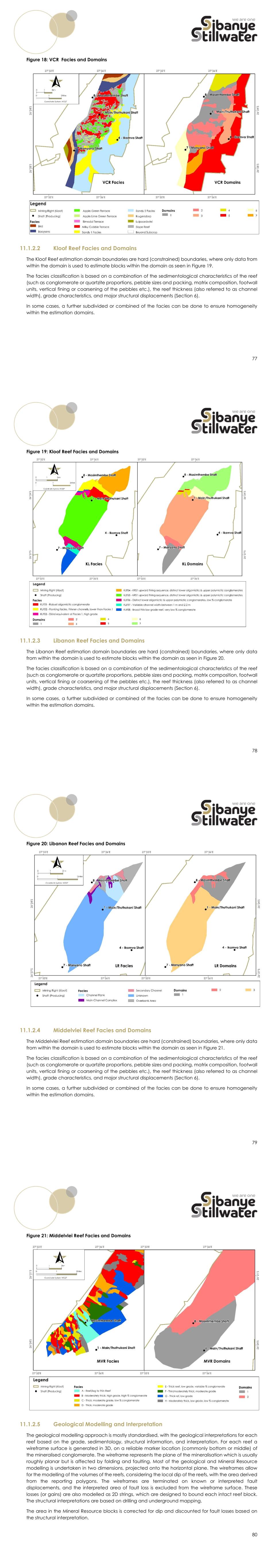 77 Figure 18: VCR Facies and Domains 11.1.2.2 Kloof Reef Facies and Domains The Kloof Reef estimation domain boundaries are hard (constrained) boundaries, where only data from within the domain is used to estimate blocks within the domain as seen in Figure 19. The facies classification is based on a combination of the sedimentological characteristics of the reef (such as conglomerate or quartzite proportions, pebble sizes and packing, matrix composition, footwall units, vertical fining or coarsening of the pebbles etc.), the reef thickness (also referred to as channel width), grade characteristics, and major structural displacements (Section 6). In some cases, a further subdivided or combined of the facies can be done to ensure homogeneity within the estimation domains. 78 Figure 19: Kloof Reef Facies and Domains 11.1.2.3 Libanon Reef Facies and Domains The Libanon Reef estimation domain boundaries are hard (constrained) boundaries, where only data from within the domain is used to estimate blocks within the domain as seen in Figure 20. The facies classification is based on a combination of the sedimentological characteristics of the reef (such as conglomerate or quartzite proportions, pebble sizes and packing, matrix composition, footwall units, vertical fining or coarsening of the pebbles etc.), the reef thickness (also referred to as channel width), grade characteristics, and major structural displacements (Section 6). In some cases, a further subdivided or combined of the facies can be done to ensure homogeneity within the estimation domains. 79 Figure 20: Libanon Reef Facies and Domains 11.1.2.4 Middelvlei Reef Facies and Domains The Middelvlei Reef estimation domain boundaries are hard (constrained) boundaries, where only data from within the domain is used to estimate blocks within the domain as seen in Figure 21. The facies classification is based on a combination of the sedimentological characteristics of the reef (such as conglomerate or quartzite proportions, pebble sizes and packing, matrix composition, footwall units, vertical fining or coarsening of the pebbles etc.), the reef thickness (also referred to as channel width), grade characteristics, and major structural displacements (Section 6). In some cases, a further subdivided or combined of the facies can be done to ensure homogeneity within the estimation domains. 80 Figure 21: Middelvlei Reef Facies and Domains 11.1.2.5 Geological Modelling and Interpretation The geological modelling approach is mostly standardised, with the geological interpretations for each reef based on the grade, sedimentology, structural information, and interpretation. For each reef a wireframe surface is generated in 3D, on a reliable marker location (commonly bottom or middle) of the mineralised conglomerate. The wireframe represents the plane of the mineralisation which is usually roughly planar but is affected by folding and faulting. Most of the geological and Mineral Resource modelling is undertaken in two dimensions, projected onto the horizontal plane. The wireframes allow for the modelling of the volumes of the reefs, considering the local dip of the reefs, with the area derived from the reporting polygons. The wireframes are terminated on known or interpreted fault displacements, and the interpreted area of fault loss is excluded from the wireframe surface. These losses (or gains) are also modelled as 2D strings, which are designed to bound each intact reef block. The structural interpretations are based on drilling and underground mapping. The area in the Mineral Resource blocks is corrected for dip and discounted for fault losses based on the structural interpretation.