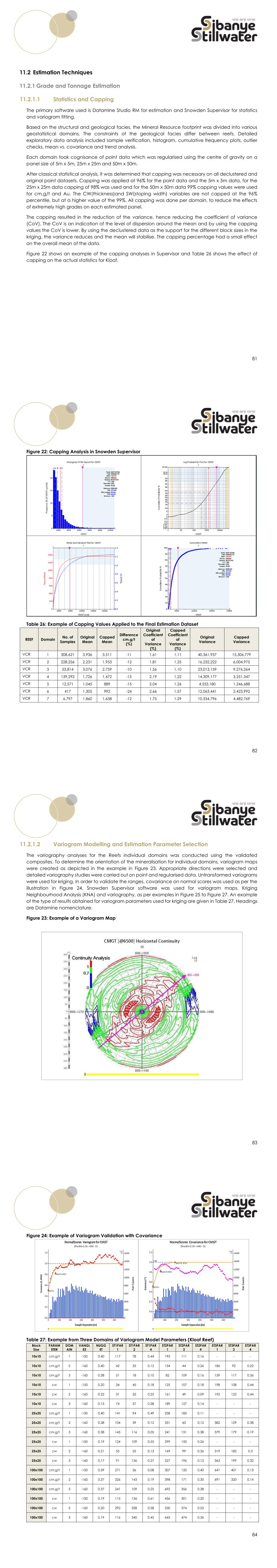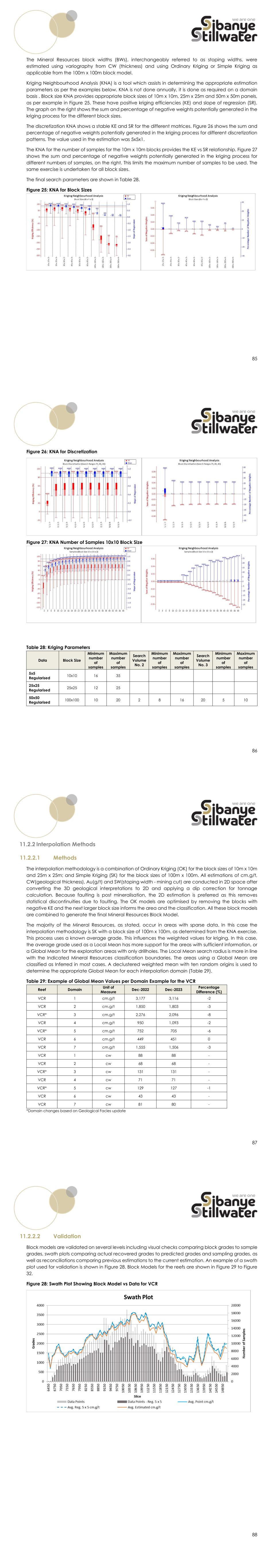 85 The Mineral Resources block widths (BWs), interchangeably referred to as stoping widths, were estimated using variography from CW (thickness) and using Ordinary Kriging or Simple Kriging as applicable from the 100m x 100m block model. Kriging Neighbourhood Analysis (KNA) is a tool which assists in determining the appropriate estimation parameters as per the examples below. KNA is not done annually, it is done as required on a domain basis . Block size KNA provides appropriate block sizes of 10m x 10m, 25m x 25m and 50m x 50m panels, as per example in Figure 25. These have positive kriging efficiencies (KE) and slope of regression (SR). The graph on the right shows the sum and percentage of negative weights potentially generated in the kriging process for the different block sizes. The discretization KNA shows a stable KE and SR for the different matrices. Figure 26 shows the sum and percentage of negative weights potentially generated in the kriging process for different discretization patterns. The value used in the estimation was 5x5x1. The KNA for the number of samples for the 10m x 10m blocks provides the KE vs SR relationship. Figure 27 shows the sum and percentage of negative weights potentially generated in the kriging process for different numbers of samples, on the right. This limits the maximum number of samples to be used. The same exercise is undertaken for all block sizes. The final search parameters are shown in Table 28. Figure 25: KNA for Block Sizes 86 Figure 26: KNA for Discretization Figure 27: KNA Number of Samples 10x10 Block Size Table 28: Kriging Parameters Data Block Size Minimum number of samples Maximum number of samples Search Volume No. 2 Minimum number of samples Maximum number of samples Search Volume No. 3 Minimum number of samples Maximum number of samples 5x5 Regularised 10x10 16 35 25x25 Regularised 25x25 12 25 50x50 Regularised 100x100 10 20 2 8 16 20 5 10 87 11.2.2 Interpolation Methods 11.2.2.1 Methods The interpolation methodology is a combination of Ordinary Kriging (OK) for the block sizes of 10m x 10m and 25m x 25m; and Simple Kriging (SK) for the block sizes of 100m x 100m. All estimations of cm.g/t, CW(geological thickness), Au(g/t) and SW(stoping width - mining cut) are conducted in 2D space after converting the 3D geological interpretations to 2D and applying a dip correction for tonnage calculation. Because faulting is post mineralisation, the 2D estimation is preferred as this removes statistical discontinuities due to faulting. The OK models are optimised by removing the blocks with negative KE and the next larger block size informs the area and the classification. All these block models are combined to generate the final Mineral Resources Block Model. The majority of the Mineral Resources, as stated, occur in areas with sparse data. In this case the interpolation methodology is SK with a block size of 100m x 100m, as determined from the KNA exercise. This process uses a known average grade. This influences the weighted values for kriging. In this case, the average grade used as a Local Mean has more support for the areas with sufficient information, or a Global Mean for the exploration areas with only drillholes. The Local Mean search radius is more in line with the Indicated Mineral Resources classification boundaries. The areas using a Global Mean are classified as Inferred in most cases. A declustered weighted mean with ten random origins is used to determine the appropriate Global Mean for each interpolation domain (Table 29). Table 29: Example of Global Mean Values per Domain Example for the VCR Reef Domain Unit of Measure Dec-2022 Dec-2023 Percentage Difference (%) VCR 1 cm.g/t 3,177 3,116 -2 VCR 2 cm.g/t 1,850 1,803 -3 VCR* 3 cm.g/t 2,276 2,096 -8 VCR 4 cm.g/t 950 1,093 -2 VCR* 5 cm.g/t 752 705 -6 VCR 6 cm.g/t 449 451 0 VCR 7 cm.g/t 1,555 1,506 -3 VCR 1 cw 88 88 - VCR 2 cw 68 68 - VCR* 3 cw 131 131 - VCR 4 cw 71 71 - VCR* 5 cw 129 127 -1 VCR 6 cw 43 43 - VCR 7 cw 81 80 - *Domain changes based on Geological Facies update 88 11.2.2.2 Validation Block models are validated on several levels including visual checks comparing block grades to sample grades, swath plots comparing actual recovered grades to predicted grades and sampling grades, as well as reconciliations comparing previous estimations to the current estimation. An example of a swath plot used for validation is shown in Figure 28. Block Models for the reefs are shown in Figure 29 to Figure 32. Figure 28: Swath Plot Showing Block Model vs Data for VCR