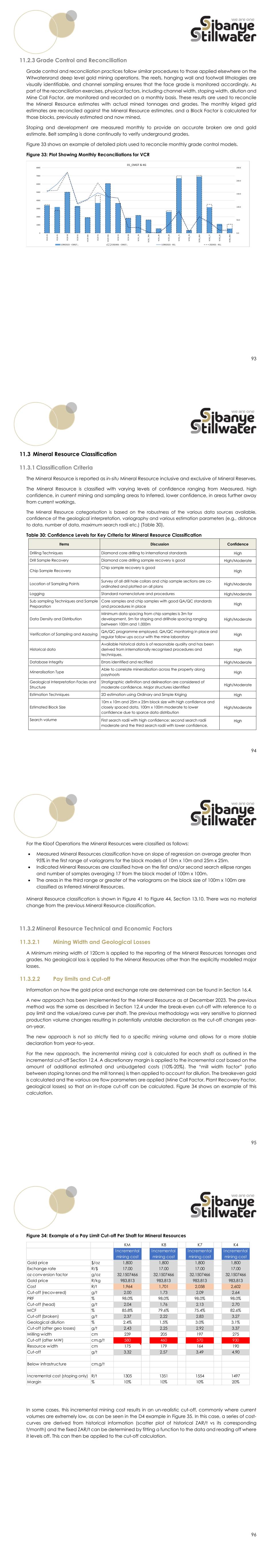 93 11.2.3 Grade Control and Reconciliation Grade control and reconciliation practices follow similar procedures to those applied elsewhere on the Witwatersrand deep level gold mining operations. The reefs, hanging wall and footwall lithologies are visually identifiable, and channel sampling ensures that the face grade is monitored accordingly. As part of the reconciliation exercises, physical factors, including channel width, stoping width, dilution and Mine Call Factor, are monitored and recorded on a monthly basis. These results are used to reconcile the Mineral Resource estimates with actual mined tonnages and grades. The monthly kriged grid estimates are reconciled against the Mineral Resource estimates, and a Block Factor is calculated for those blocks, previously estimated and now mined. Stoping and development are measured monthly to provide an accurate broken ore and gold estimate. Belt sampling is done continually to verify underground grades. Figure 33 shows an example of detailed plots used to reconcile monthly grade control models. Figure 33: Plot Showing Monthly Reconciliations for VCR 94 11.3 Mineral Resource Classification 11.3.1 Classification Criteria The Mineral Resource is reported as in-situ Mineral Resource inclusive and exclusive of Mineral Reserves. The Mineral Resource is classified with varying levels of confidence ranging from Measured, high confidence, in current mining and sampling areas to Inferred, lower confidence, in areas further away from current workings. The Mineral Resource categorisation is based on the robustness of the various data sources available, confidence of the geological interpretation, variography and various estimation parameters (e.g., distance to data, number of data, maximum search radii etc.) (Table 30). Table 30: Confidence Levels for Key Criteria for Mineral Resource Classification Items Discussion Confidence Drilling Techniques Diamond core drilling to international standards High Drill Sample Recovery Diamond core drilling sample recovery is good High/Moderate Chip Sample Recovery Chip sample recovery is good High Location of Sampling Points Survey of all drill hole collars and chip sample sections are co- ordinated and plotted on all plans High/Moderate Logging Standard nomenclature and procedures High/Moderate Sub sampling Techniques and Sample Preparation Core samples and chip samples with good QA/QC standards and procedures in place High Data Density and Distribution Minimum data spacing from chip samples is 3m for development, 5m for stoping and drillhole spacing ranging between 100m and 1,000m High/Moderate Verification of Sampling and Assaying QA/QC programme employed. QA/QC monitoring in place and regular follow ups occur with the mine laboratory High Historical data Available historical data is of reasonable quality and has been derived from internationally recognised procedures and techniques. High Database Integrity Errors identified and rectified High/Moderate Mineralisation Type Able to correlate mineralisation across the property along payshoots High Geological Interpretation Facies and Structure Stratigraphic definition and delineation are considered of moderate confidence. Major structures identified High/Moderate Estimation Techniques 2D estimation using Ordinary and Simple Kriging High Estimated Block Size 10m x 10m and 25m x 25m block size with high confidence and closely spaced data, 100m x 100m moderate to lower confidence due to sparce data distribution High/Moderate Search volume First search radii with high confidence; second search radii moderate and the third search radii with lower confidence. High 95 For the Kloof Operations the Mineral Resources were classified as follows:  Measured Mineral Resources classification have on slope of regression on average greater than 95% in the first range of variograms for the block models of 10m x 10m and 25m x 25m.  Indicated Mineral Resources are classified have on the first and/or second search ellipse ranges and number of samples averaging 17 from the block model of 100m x 100m.  The areas in the third range or greater of the variograms on the block size of 100m x 100m are classified as Inferred Mineral Resources. Mineral Resource classification is shown in Figure 41 to Figure 44, Section 13.10. There was no material change from the previous Mineral Resource classification. 11.3.2 Mineral Resource Technical and Economic Factors 11.3.2.1 Mining Width and Geological Losses A Minimum mining width of 120cm is applied to the reporting of the Mineral Resources tonnages and grades. No geological loss is applied to the Mineral Resources other than the explicitly modelled major losses. 11.3.2.2 Pay limits and Cut-off Information on how the gold price and exchange rate are determined can be found in Section 16.4. A new approach has been implemented for the Mineral Resource as at December 2023. The previous method was the same as described in Section 12.4 under the break-even cut-off with reference to a pay limit and the value/area curve per shaft. The previous methodology was very sensitive to planned production volume changes resulting in potentially unstable declaration as the cut-off changes year- on-year. The new approach is not so strictly tied to a specific mining volume and allows for a more stable declaration from year-to-year. For the new approach, the incremental mining cost is calculated for each shaft as outlined in the incremental cut-off Section 12.4. A discretionary margin is applied to the incremental cost based on the amount of additional estimated and unbudgeted costs (10%-20%). The “mill width factor” (ratio between stoping tonnes and the mill tonnes) is then applied to account for dilution. The breakeven gold is calculated and the various ore flow parameters are applied (Mine Call Factor, Plant Recovery Factor, geological losses) so that an in-stope cut-off can be calculated. Figure 34 shows an example of this calculation. 96 Figure 34: Exam