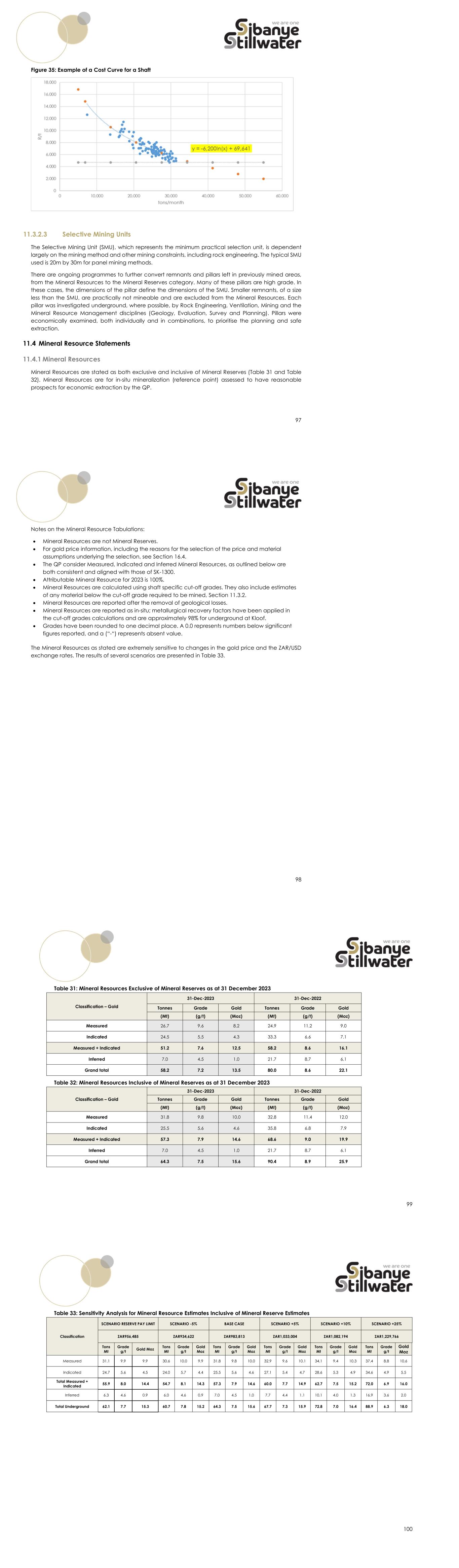 97 Figure 35: Example of a Cost Curve for a Shaft 11.3.2.3 Selective Mining Units The Selective Mining Unit (SMU), which represents the minimum practical selection unit, is dependent largely on the mining method and other mining constraints, including rock engineering. The typical SMU used is 20m by 30m for panel mining methods. There are ongoing programmes to further convert remnants and pillars left in previously mined areas, from the Mineral Resources to the Mineral Reserves category. Many of these pillars are high grade. In these cases, the dimensions of the pillar define the dimensions of the SMU. Smaller remnants, of a size less than the SMU, are practically not mineable and are excluded from the Mineral Resources. Each pillar was investigated underground, where possible, by Rock Engineering, Ventilation, Mining and the Mineral Resource Management disciplines (Geology, Evaluation, Survey and Planning). Pillars were economically examined, both individually and in combinations, to prioritise the planning and safe extraction. 11.4 Mineral Resource Statements 11.4.1 Mineral Resources Mineral Resources are stated as both exclusive and inclusive of Mineral Reserves (Table 31 and Table 32). Mineral Resources are for in-situ mineralization (reference point) assessed to have reasonable prospects for economic extraction by the QP. 98 Notes on the Mineral Resource Tabulations:  Mineral Resources are not Mineral Reserves.  For gold price information, including the reasons for the selection of the price and material assumptions underlying the selection, see Section 16.4.  The QP consider Measured, Indicated and Inferred Mineral Resources, as outlined below are both consistent and aligned with those of SK-1300.  Attributable Mineral Resource for 2023 is 100%.  Mineral Resources are calculated using shaft specific cut-off grades. They also include estimates of any material below the cut-off grade required to be mined, Section 11.3.2.  Mineral Resources are reported after the removal of geological losses.  Mineral Resources are reported as in-situ; metallurgical recovery factors have been applied in the cut-off grades calculations and are approximately 98% for underground at Kloof.  Grades have been rounded to one decimal place. A 0.0 represents numbers below significant figures reported, and a (“-“) represents absent value. The Mineral Resources as stated are extremely sensitive to changes in the gold price and the ZAR/USD exchange rates. The results of several scenarios are presented in Table 33. 99 Table 31: Mineral Resources Exclusive of Mineral Reserves as at 31 December 2023 Classification – Gold 31-Dec-2023 31-Dec-2022 Tonnes Grade Gold Tonnes Grade Gold (Mt) (g/t) (Moz) (Mt) (g/t) (Moz) Measured 26.7 9.6 8.2 24.9 11.2 9.0 Indicated 24.5 5.5 4.3 33.3 6.6 7.1 Measured + Indicated 51.2 7.6 12.5 58.2 8.6 16.1 Inferred 7.0 4.5 1.0 21.7 8.7 6.1 Grand total 58.2 7.2 13.5 80.0 8.6 22.1 Table 32: Mineral Resources Inclusive of Mineral Reserves as at 31 December 2023 Classification – Gold 31-Dec-2023 31-Dec-2022 Tonnes Grade Gold Tonnes Grade Gold (Mt) (g/t) (Moz) (Mt) (g/t) (Moz) Measured 31.8 9.8 10.0 32.8 11.4 12.0 Indicated 25.5 5.6 4.6 35.8 6.8 7.9 Measured + Indicated 57.3 7.9 14.6 68.6 9.0 19.9 Inferred 7.0 4.5 1.0 21.7 8.7 6.1 Grand total 64.3 7.5 15.6 90.4 8.9 25.9 100 Table 33: Sensitivity Analysis for Mineral Resource Estimates Inclusive of Mineral Reserve Estimates Classification SCENARIO RESERVE PAY LIMIT SCENARIO -5% BASE CASE SCENARIO +5% SCENARIO +10% SCENARIO +25% ZAR956,485 ZAR934,622 ZAR983,813 ZAR1,033,004 ZAR1,082,194 ZAR1,229,766 Tons Mt Grade g/t Gold Moz Tons Mt Grade g/t Gold Moz Tons Mt Grade g/t Gold Moz Tons Mt Grade g/t Gold Moz Tons Mt Grade g/t Gold Moz Tons Mt Grade g/t Gold Moz Measured 31.1 9.9 9.9 30.6 10.0 9.9 31.8 9.8 10.0 32.9 9.6 10.1 34.1 9.4 10.3 37.4 8.8 10.6 Indicated 24.7 5.6 4.5 24.0 5.7 4.4 25.5 5.6 4.6 27.1 5.4 4.7 28.6 5.3 4.9 34.6 4.9 5.5 Total Measured + Indicated 55.9 8.0 14.4 54.7 8.1 14.3 57.3 7.9 14.6 60.0 7.7 14.9 62.7 7.5 15.2 72.0 6.9 16.0 Inferred 6.3 4.6 0.9 6.0 4.6 0.9 7.0 4.5 1.0 7.7 4.4 1.1 10.1 4.0 1.3 16.9 3.6 2.0 Total Underground 62.1 7.7 15.3 60.7 7.8 15.2 64.3 7.5 15.6 67.7 7.3 15.9 72.8 7.0 16.4 88.9 6.3 18.0