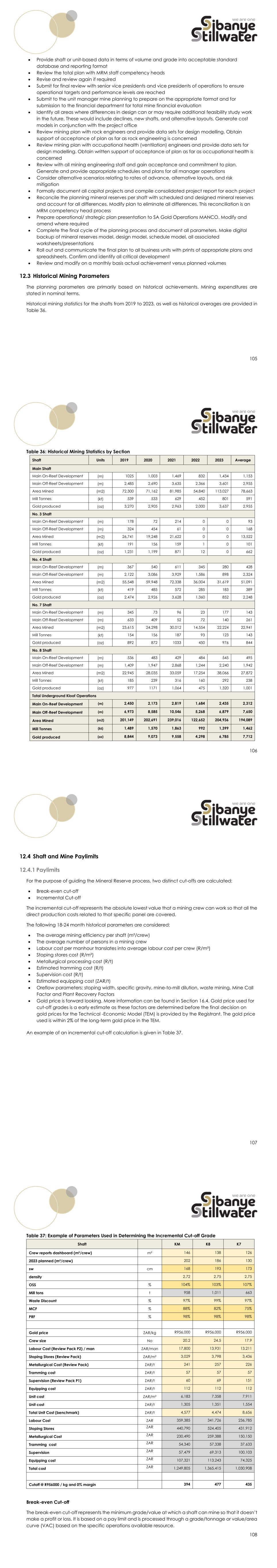 105  Provide shaft or unit-based data in terms of volume and grade into acceptable standard database and reporting format  Review the total plan with MRM staff competency heads  Revise and review again if required  Submit for final review with senior vice presidents and vice presidents of operations to ensure operational targets and performance levels are reached  Submit to the unit manager mine planning to prepare on the appropriate format and for submission to the financial department for total mine financial evaluation  Identify all areas where differences in design can or may require additional feasibility study work in the future. These would include declines, new shafts, and alternative layouts. Generate cost models in conjunction with the project office  Review mining plan with rock engineers and provide data sets for design modelling. Obtain support of acceptance of plan as far as rock engineering is concerned  Review mining plan with occupational health (ventilation) engineers and provide data sets for design modelling. Obtain written support of acceptance of plan as far as occupational health is concerned  Review with all mining engineering staff and gain acceptance and commitment to plan. Generate and provide appropriate schedules and plans for all manager operations  Consider alternative scenarios relating to rates of advance, alternative layouts, and risk mitigation  Formally document all capital projects and compile consolidated project report for each project  Reconcile the planning mineral reserves per shaft with scheduled and designed mineral reserves and account for all differences. Modify plan to eliminate all differences. This reconciliation is an MRM competency head process  Prepare operational/ strategic plan presentation to SA Gold Operations MANCO. Modify and amend where required  Complete the final cycle of the planning process and document all parameters. Make digital backup of mineral reserves model, design model, schedule model, all associated worksheets/presentations  Roll out and communicate the final plan to all business units with prints of appropriate plans and spreadsheets. Confirm and identify all critical development  Review and modify on a monthly basis actual achievement versus planned volumes 12.3 Historical Mining Parameters The planning parameters are primarily based on historical achievements. Mining expenditures are stated in nominal terms. Historical mining statistics for the shafts from 2019 to 2023, as well as historical averages are provided in Table 36. 106 Table 36: Historical Mining Statistics by Section Shaft Units 2019 2020 2021 2022 2023 Average Main Shaft Main On-Reef Development (m) 1025 1,003 1,469 832 1,434 1,153 Main Off-Reef Development (m) 2,485 2,690 3,635 2,366 3,601 2,955 Area Mined (m2) 72,300 71,162 81,985 54,840 113,027 78,663 Mill Tonnes (kt) 539 533 629 452 801 591 Gold produced (oz) 3,270 2,905 2,963 2,000 3,637 2,955 No. 3 Shaft Main On-Reef Development (m) 178 72 214 0 0 93 Main Off-Reef Development (m) 324 454 61 0 0 168 Area Mined (m2) 26,741 19,248 21,622 0 0 13,522 Mill Tonnes (kt) 191 156 159 1 0 101 Gold produced (oz) 1,231 1,199 871 12 0 662 No. 4 Shaft Main On-Reef Development (m) 367 540 611 345 280 428 Main Off-Reef Development (m) 2,122 3,086 3,929 1,586 898 2,324 Area Mined (m2) 55,548 59,948 72,338 36,004 31,619 51,091 Mill Tonnes (kt) 419 485 572 285 183 389 Gold produced (oz) 2,474 2,926 3,628 1,360 852 2,248 No. 7 Shaft Main On-Reef Development (m) 345 73 96 23 177 143 Main Off-Reef Development (m) 633 409 52 72 140 261 Area Mined (m2) 23,615 24,298 30,012 14,554 22,224 22,941 Mill Tonnes (kt) 154 156 187 93 123 143 Gold produced (oz) 892 872 1033 450 976 844 No. 8 Shaft Main On-Reef Development (m) 536 483 429 484 545 495 Main Off-Reef Development (m) 1,409 1,947 2,868 1,244 2,240 1,942 Area Mined (m2) 22,945 28,035 33,059 17,254 38,066 27,872 Mill Tonnes (kt) 185 239 316 160 292 238 Gold produced (oz) 977 1171 1,064 475 1,320 1,001 Total Underground Kloof Operations Main On-Reef Development (m) 2,450 2,173 2,819 1,684 2,435 2,312 Main Off-Reef Development (m) 6,973 8,585 10,546 5,268 6,879 7,650 Area Mined (m2) 201,149 202,691 239,016 122,652 204,936 194,089 Mill Tonnes (kt) 1,489 1,570 1,863 992 1,399 1,462 Gold produced (oz) 8,844 9,073 9,558 4,298 6,785 7,712 107 12.4 Shaft and Mine Paylimits 12.4.1 Paylimits For the purpose of guiding the Mineral Reserve process, two distinct cut-offs are calculated:  Break-even cut-off  Incremental Cut-off The incremental cut-off represents the absolute lowest value that a mining crew can work so that all the direct production costs related to that specific panel are covered. The following 18-24 month historical parameters are considered:  The average mining efficiency per shaft (m²/crew)  The average number of persons in a mining crew  Labour cost per manhour translates into average labour cost per crew (R/m²)  Stoping stores cost (R/m²)  Metallurgical processing cost (R/t)  Estimated tramming cost (R/t)  Supervision cost (R/t)  Estimated equipping cost (ZAR/t)  Oreflow parameters: stoping width, specific gravity, mine-to-mill dilution, waste mining, Mine Call Factor and Plant Recovery Factors  Gold price is forward looking. More information can be found in Section 16.4. Gold price used for cut-off grades is a early estimate as these factors are determined before the final decision on gold prices for the Technical -Economic Model (TEM) is provided by the Registrant. The gold price used is within 2% of the long-term gold price in the TEM. An example of an incremental cut-off calculation is given in Table 37. 108 Table 37: Example of Parameters Used in Determining the Incremental Cut-off Grade Shaft KM K8 K7 Crew reports dashboard (m²/crew) m² 146 138 126 2023 planned (m²/crew) 202 186 130 sw cm 168 193 173 density 2.72 2.75 2.75 OSS % 104% 103% 107% Mill tons t 958 1,011 66