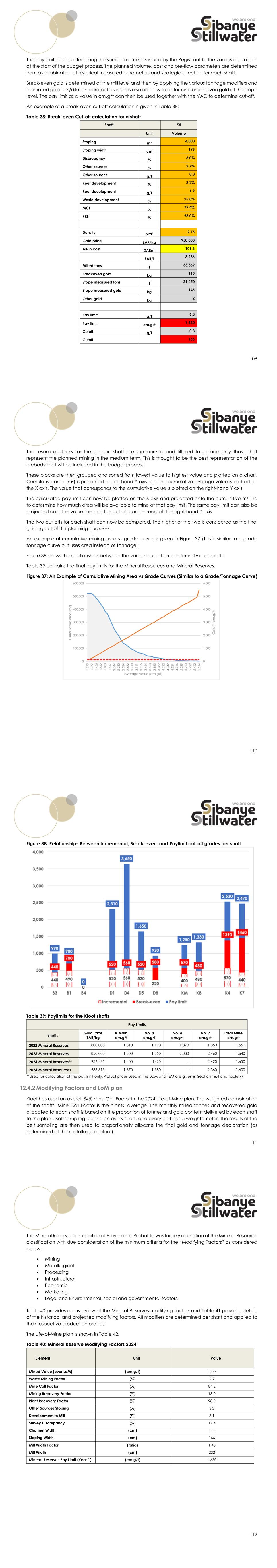109 The pay limit is calculated using the same parameters issued by the Registrant to the various operations at the start of the budget process. The planned volume, cost and ore-flow parameters are determined from a combination of historical measured parameters and strategic direction for each shaft. Break-even gold is determined at the mill level and then by applying the various tonnage modifiers and estimated gold loss/dilution parameters in a reverse ore-flow to determine break-even gold at the stope level. The pay limit as a value in cm.g/t can then be used together with the VAC to determine cut-off. An example of a break-even cut-off calculation is given in Table 38; Table 38: Break-even Cut-off calculation for a shaft Shaft K8 Unit Volume Stoping m² 4,000 Stoping width cm 195 Discrepancy % 3.0% Other sources % 2.7% Other sources g/t 0.0 Reef development % 3.2% Reef development g/t 1.9 Waste development % 26.8% MCF % 79.4% PRF % 98.0% Density t/m³ 2.75 Gold price ZAR/kg 950,000 All-in cost ZARm 109.6 ZAR/t 3,286 Milled tons t 33,359 Breakeven gold kg 115 Stope measured tons t 21,450 Stope measured gold kg 146 Other gold kg 2 Pay limit g/t 6.8 Pay limit cm.g/t 1,330 Cutoff g/t 0.8 Cutoff 166 110 The resource blocks for the specific shaft are summarized and filtered to include only those that represent the planned mining in the medium term. This is thought to be the best representation of the orebody that will be included in the budget process. These blocks are then grouped and sorted from lowest value to highest value and plotted on a chart. Cumulative area (m²) is presented on left-hand Y axis and the cumulative average value is plotted on the X axis. The value that corresponds to the cumulative value is plotted on the right-hand Y axis. The calculated pay limit can now be plotted on the X axis and projected onto the cumulative m² line to determine how much area will be available to mine at that pay limit. The same pay limit can also be projected onto the value line and the cut-off can be read off the right-hand Y axis. The two cut-offs for each shaft can now be compared. The higher of the two is considered as the final guiding cut-off for planning purposes. An example of cumulative mining area vs grade curves is given in Figure 37 (This is similar to a grade tonnage curve but uses area instead of tonnage). Figure 38 shows the relationships between the various cut-off grades for individual shafts. Table 39 contains the final pay limits for the Mineral Resources and Mineral Reserves. Figure 37: An Example of Cumulative Mining Area vs Grade Curves (Similar to a Grade/Tonnage Curve) 111 Figure 38: Relationships Between Incremental, Break-even, and Paylimit cut-off grades per shaft Table 39: Paylimits for the Kloof shafts Pay Limits Shafts Gold Price ZAR/kg K Main cm.g/t No. 8 cm.g/t No. 4 cm.g/t No. 7 cm.g/t Total Mine cm.g/t 2022 Mineral Reserves 800,000 1,310 1,190 1,870 1,850 1,550 2023 Mineral Reserves 850,000 1,300 1,350 2,030 2,460 1,640 2024 Mineral Reserves** 956,485 1,400 1420 - 2,420 1,650 2024 Mineral Resources 983,813 1,370 1,380 - 2,360 1,600 **Used for calculation of the pay limit only. Actual prices used in the LOM and TEM are given in Section 16.4 and Table 77. 12.4.2 Modifying Factors and LoM plan Kloof has used an overall 84% Mine Call Factor in the 2024 Life-of-Mine plan. The weighted combination of the shafts’ Mine Call Factor is the plants’ average. The monthly milled tonnes and recovered gold allocated to each shaft is based on the proportion of tonnes and gold content delivered by each shaft to the plant. Belt sampling is done on every shaft, and every belt has a weightometer. The results of the belt sampling are then used to proportionally allocate the final gold and tonnage declaration (as determined at the metallurgical plant). 112 The Mineral Reserve classification of Proven and Probable was largely a function of the Mineral Resource classification with due consideration of the minimum criteria for the “Modifying Factors” as considered below:  Mining  Metallurgical  Processing  Infrastructural  Economic  Marketing  Legal and Environmental, social and governmental factors. Table 40 provides an overview of the Mineral Reserves modifying factors and Table 41 provides details of the historical and projected modifying factors. All modifiers are determined per shaft and applied to their respective production profiles. The Life-of-Mine plan is shown in Table 42. Table 40: Mineral Reserve Modifying Factors 2024 Element Unit Value Mined Value (over LoM) (cm.g/t) 1,444 Waste Mining Factor (%) 2.2 Mine Call Factor (%) 84.2 Mining Recovery Factor (%) 13.0 Plant Recovery Factor (%) 98.0 Other Sources Stoping (%) 3.2 Development to Mill (%) 8.1 Survey Discrepancy (%) 17.4 Channel Width (cm) 111 Stoping Width (cm) 166 Mill Width Factor (ratio) 1.40 Mill Width (cm) 232 Mineral Reserves Pay Limit (Year 1) (cm.g/t) 1,650