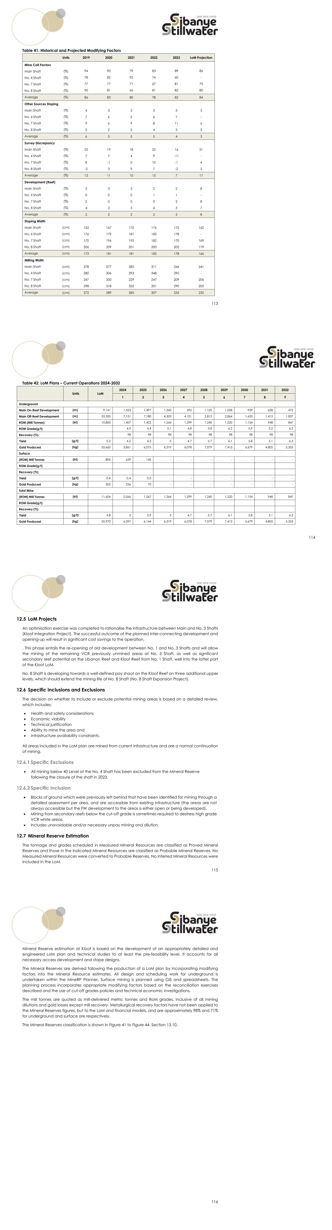 113 Table 41: Historical and Projected Modifying Factors Units 2019 2020 2021 2022 2023 LoM Projection Mine Call Factors Main Shaft (%) 94 90 79 83 89 86 No. 4 Shaft (%) 78 82 92 74 60 - No. 7 Shaft (%) 77 77 71 67 81 75 No. 8 Shaft (%) 90 81 66 81 82 80 Average (%) 86 83 80 78 82 84 Other Sources Stoping Main Shaft (%) 4 3 3 3 3 3 No. 4 Shaft (%) 7 6 5 6 7 - No. 7 Shaft (%) 9 6 9 8 11 6 No. 8 Shaft (%) 2 2 2 4 3 3 Average (%) 6 5 5 5 4 3 Survey Discrepancy Main Shaft (%) 25 19 18 22 16 21 No. 4 Shaft (%) 7 7 4 9 -11 - No. 7 Shaft (%) 8 -1 0 10 -1 4 No. 8 Shaft (%) -2 3 9 7 -2 3 Average (%) 13 11 10 15 7 17 Development (Reef) Main Shaft (%) 3 3 3 2 2 8 No. 4 Shaft (%) 0 0 0 1 1 - No. 7 Shaft (%) 2 0 0 0 2 8 No. 8 Shaft (%) 4 3 3 4 3 7 Average (%) 2 2 2 2 2 8 Stoping Width Main Shaft (cm) 152 167 170 176 172 162 No. 4 Shaft (cm) 176 179 181 183 178 - No. 7 Shaft (cm) 170 196 192 182 170 169 No. 8 Shaft (cm) 206 209 201 200 202 179 Average (cm) 173 181 181 182 178 166 Milling Width Main Shaft (cm) 278 277 285 311 266 241 No. 4 Shaft (cm) 280 306 293 348 290 - No. 7 Shaft (cm) 247 350 229 247 209 206 No. 8 Shaft (cm) 298 318 355 351 290 205 Average (cm) 272 289 285 307 255 232 114 Table 42: LoM Plans – Current Operations 2024-2032 Units LoM 2024 2025 2026 2027 2028 2029 2030 2031 2032 1 2 3 4 5 6 7 8 9 Underground Main On-Reef Development (m) 9,141 1,523 1,497 1,343 592 1,120 1,028 939 628 472 Main Off-Reef Development (m) 33,300 7,151 7,180 4,303 4,101 2,813 2,864 1,635 1,415 1,837 ROM (Mill Tonnes) (kt) 10,800 1,407 1,422 1,264 1,299 1,240 1,220 1,154 948 847 ROM Grade(g/t) 4.3 4.4 5.1 4.8 5.8 6.2 5.9 5.2 6.5 Recovery (%) 98 98 98 98 98 98 98 98 98 Yield (g/t) 5.2 4.2 4.3 5 4.7 5.7 6.1 5.8 5.1 6.3 Gold Produced (kg) 55,665 5,861 6,075 6,319 6,078 7,079 7,413 6,679 4,805 5,355 Surface (ROM) Mill Tonnes (kt) 805 659 145 - - - - - - - ROM Grade(g/t) Recovery (%) Yield (g/t) 0.4 0.4 0.5 - - - - - - - Gold Produced (kg) 305 236 70 - - - - - - - Total Mine (ROM) Mill Tonnes (kt) 11,604 2,066 1,567 1,264 1,299 1,240 1,220 1,154 948 847 ROM Grade(g/t) Recovery (%) Yield (g/t) 4.8 3 3.9 5 4.7 5.7 6.1 5.8 5.1 6.3 Gold Produced (kg) 55,970 6,097 6,144 6,319 6,078 7,079 7,413 6,679 4,805 5,355 115 12.5 LoM Projects An optimisation exercise was completed to rationalise the infrastructure between Main and No. 3 Shafts (Kloof Integration Project). The successful outcome of the planned inter-connecting development and opening-up will result in significant cost savings to the operation. . This phase entails the re-opening of old development between No. 1 and No. 3 Shafts and will allow the mining of the remaining VCR previously unmined areas at No. 3 Shaft, as well as significant secondary reef potential on the Libanon Reef and Kloof Reef from No. 1 Shaft, well into the latter part of the Kloof LoM. No. 8 Shaft is developing towards a well-defined pay shoot on the Kloof Reef on three additional upper levels, which should extend the mining life of No. 8 Shaft (No. 8 Shaft Expansion Project). 12.6 Specific Inclusions and Exclusions The decision on whether to include or exclude potential mining areas is based on a detailed review, which includes:  Health and safety considerations  Economic viability  Technical justification  Ability to mine the area and  Infrastructure availability constraints. All areas included in the LoM plan are mined from current infrastructure and are a normal continuation of mining. 12.6.1 Specific Exclusions  All mining below 40 Level at the No. 4 Shaft has been excluded from the Mineral Reserve following the closure of the shaft in 2023. 12.6.2 Specific Inclusion  Blocks of ground which were previously left behind that have been identified for mining through a detailed assessment per area, and are accessible from existing infrastructure (the areas are not always accessible but the FW development to the areas is either open or being developed).  Mining from secondary reefs below the cut-off grade is sometimes required to destress high grade VCR white areas.  Includes unavoidable and/or necessary unpay mining and dilution. 12.7 Mineral Reserve Estimation The tonnage and grades scheduled in Measured Mineral Resources are classified as Proved Mineral Reserves and those in the Indicated Mineral Resources are classified as Probable Mineral Reserves. No Measured Mineral Resources were converted to Probable Reserves. No Inferred Mineral Resources were included in the LoM. 116 Mineral Reserve estimation at Kloof is based on the development of an appropriately detailed and engineered LoM plan and technical studies to at least the pre-feasibility level. It accounts for all necessary access development and stope designs. The Mineral Reserves are derived following the production of a LoM plan by incorporating modifying factors into the Mineral Resource estimates. All design and scheduling work for underground is undertaken within the MineRP Planner. Surface mining is planned using GIS and spreadsheets. The planning process incorporates appropriate modifying factors based on the reconciliation exercises described and the use of cut-off grades policies and technical economic investigations. The mill tonnes are quoted as mill-delivered metric tonnes and RoM grades, inclusive of all mining dilutions and gold losses except mill recovery. Metallurgical recovery factors have not been applied to the Mineral Reserves figures, but to the LoM and financial models, and are approximately 98% and 71% for underground and surface ore respectively. The Mineral Reserves classification is shown in Figure 41 to Figure 44, Section 13.10.